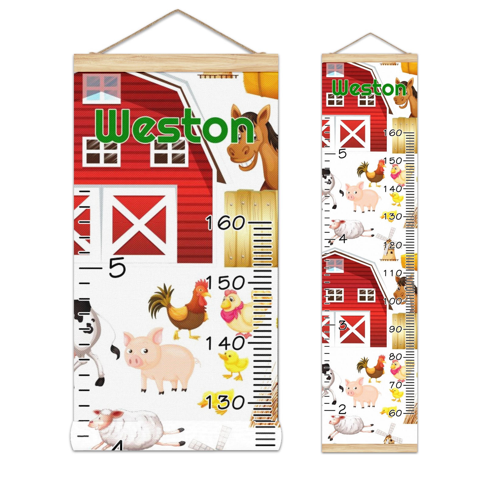 Personalized Kids Name Growth Chart Ruler for Wall Wood Frame Canvas Height Measure Chart 13.4x56 in Hanging Growth Chart Farm Animals Horse Red Barn1.22 Boys Girls Room Decor