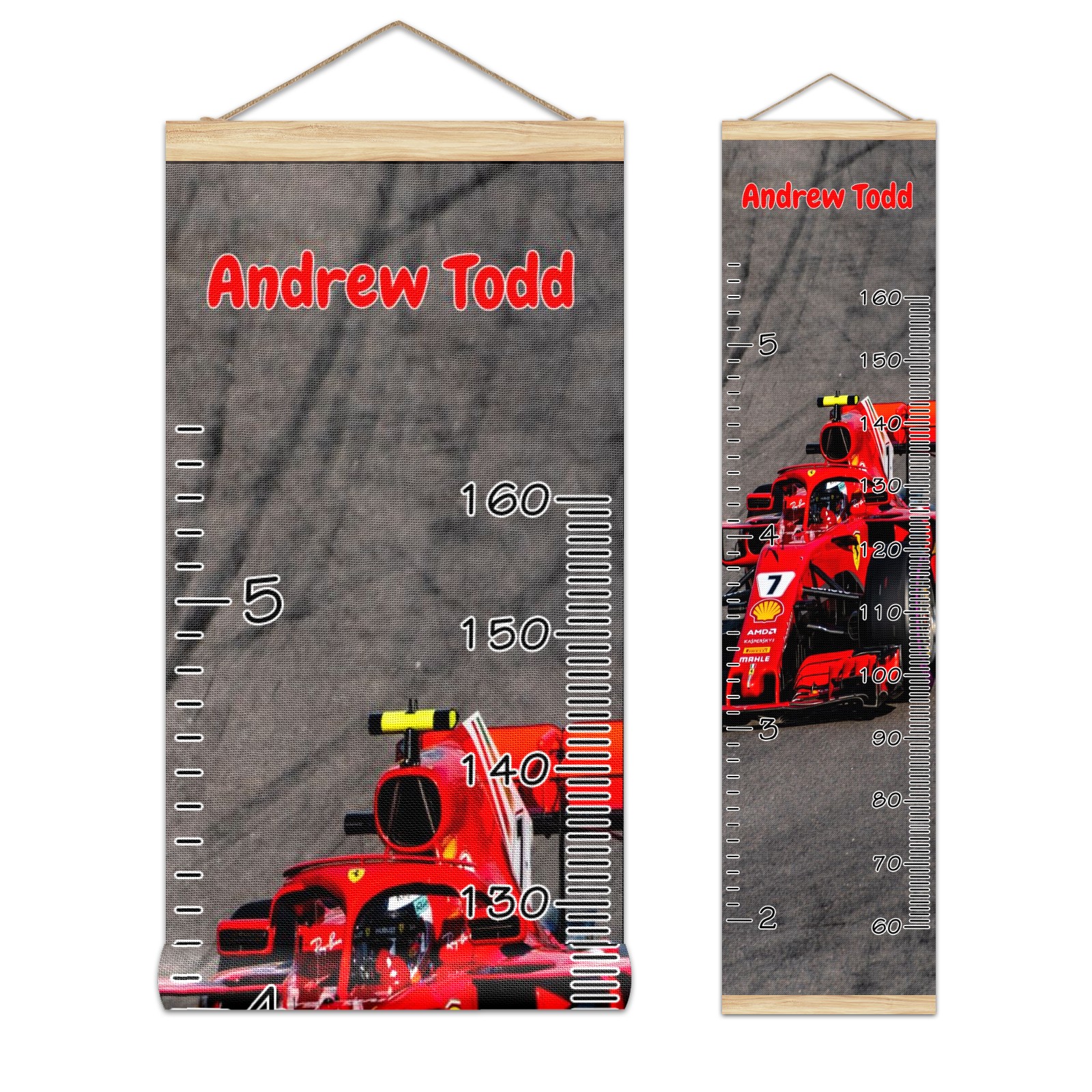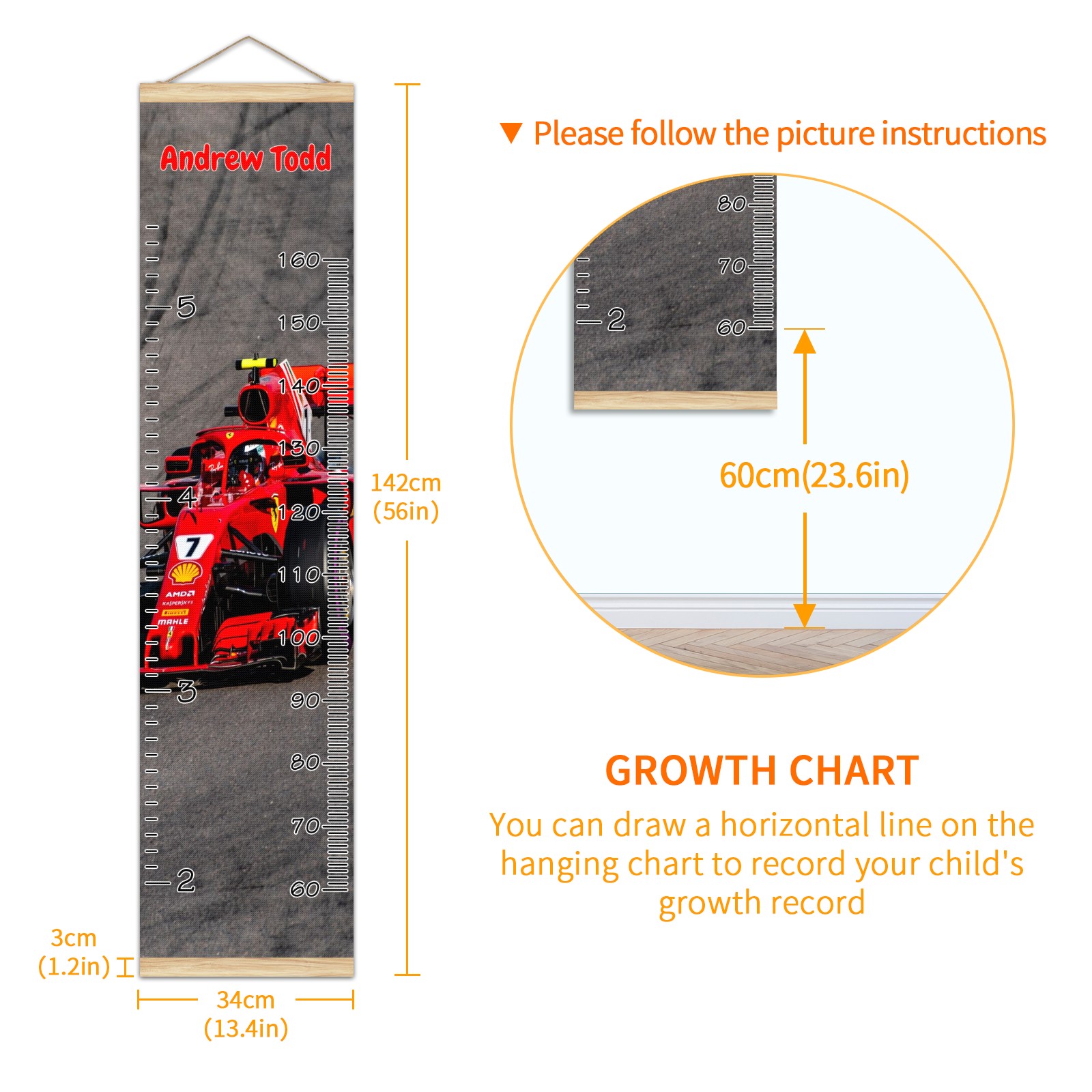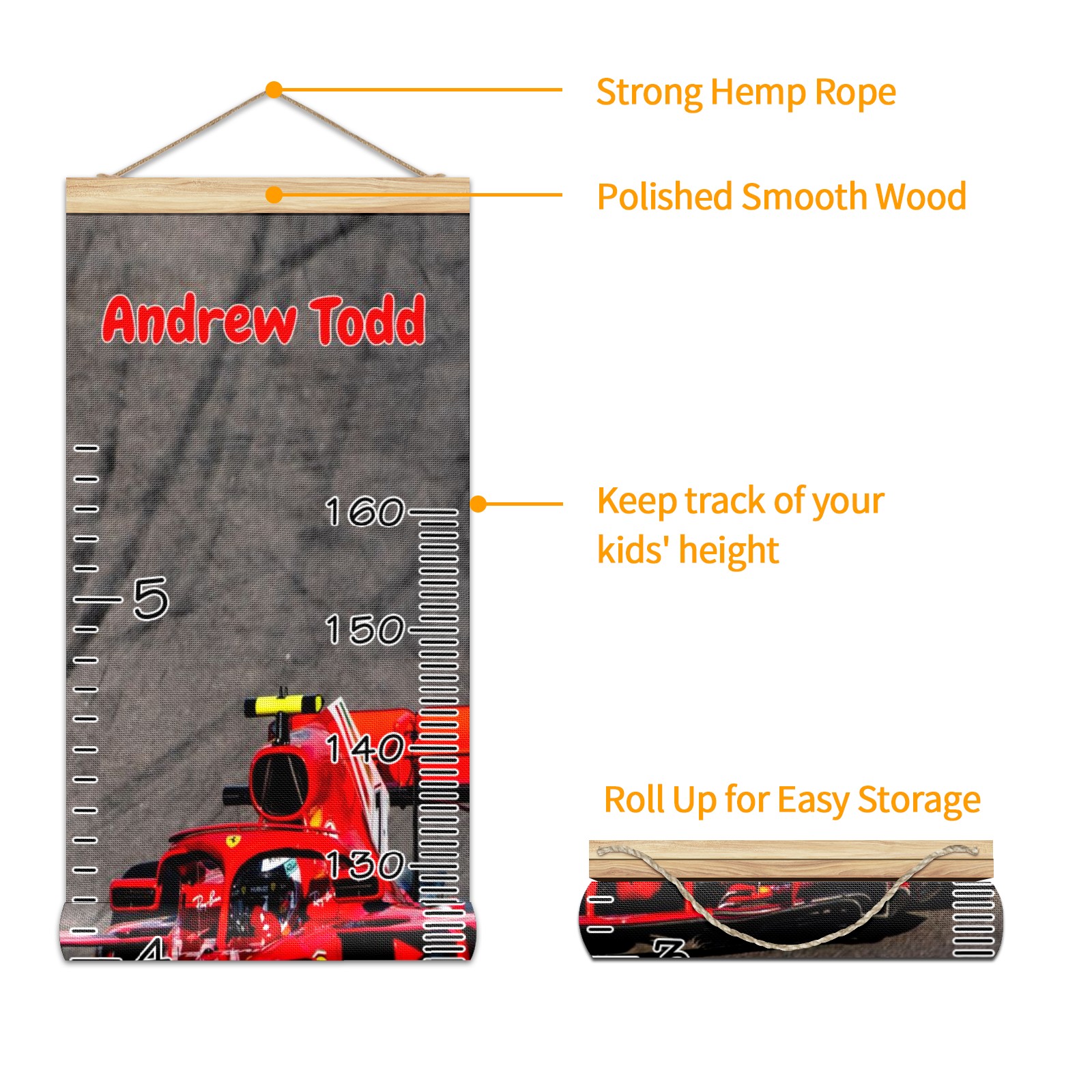 Personalized Kids Name Growth Chart Ruler for Wall Wood Frame Canvas Height Measure Chart 13.4x56 in Hanging Growth Chart RACE CAR1.30 Boys Girls Room Decor
