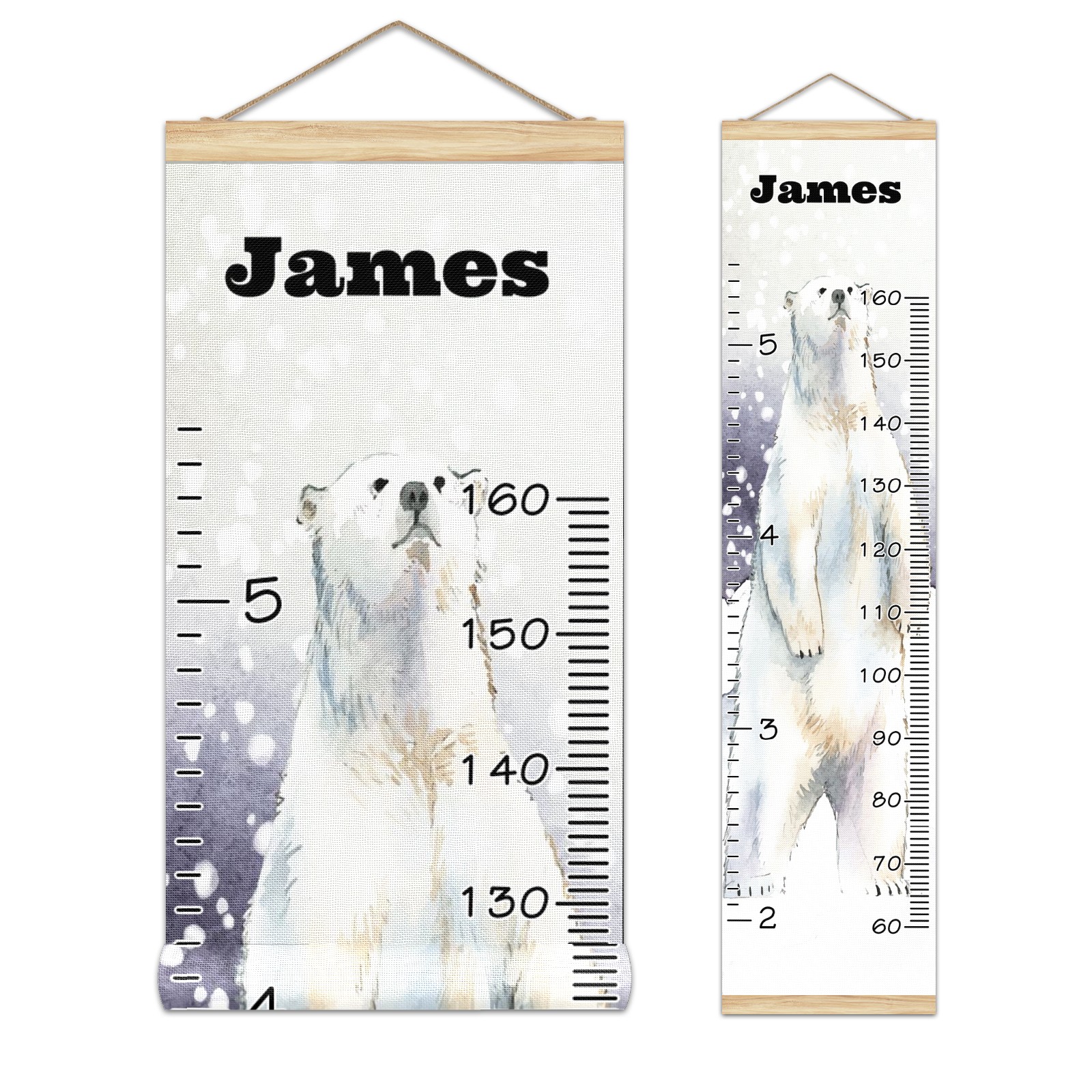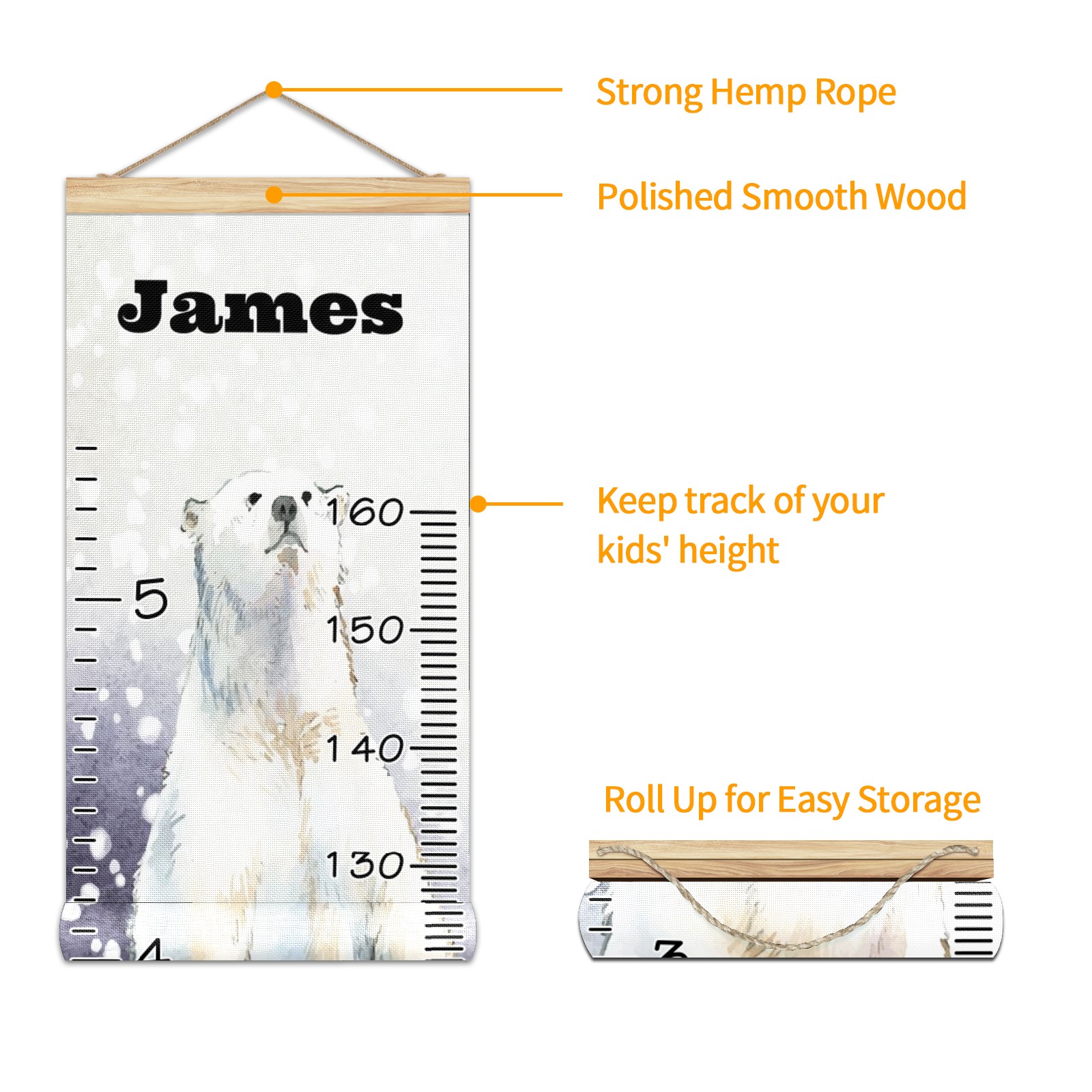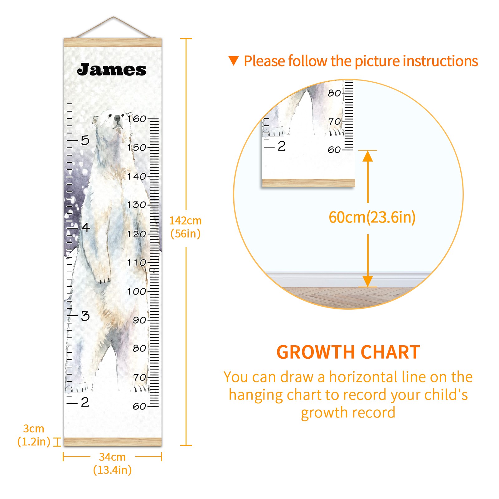 Personalized Kids Name Growth Chart Ruler for Wall Wood Frame Canvas Height Measure Chart 13.4x56 in Hanging Growth Chart Winter Snow Animal Polar Bear2.2 Boys Girls Room Decor