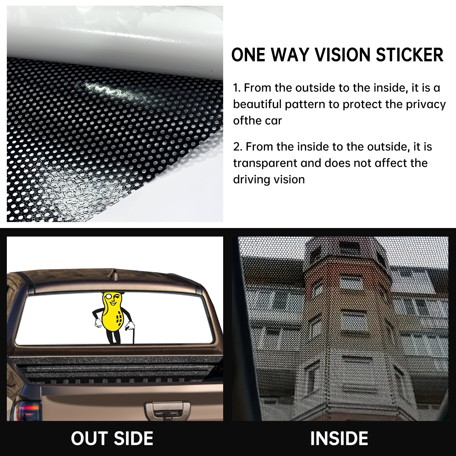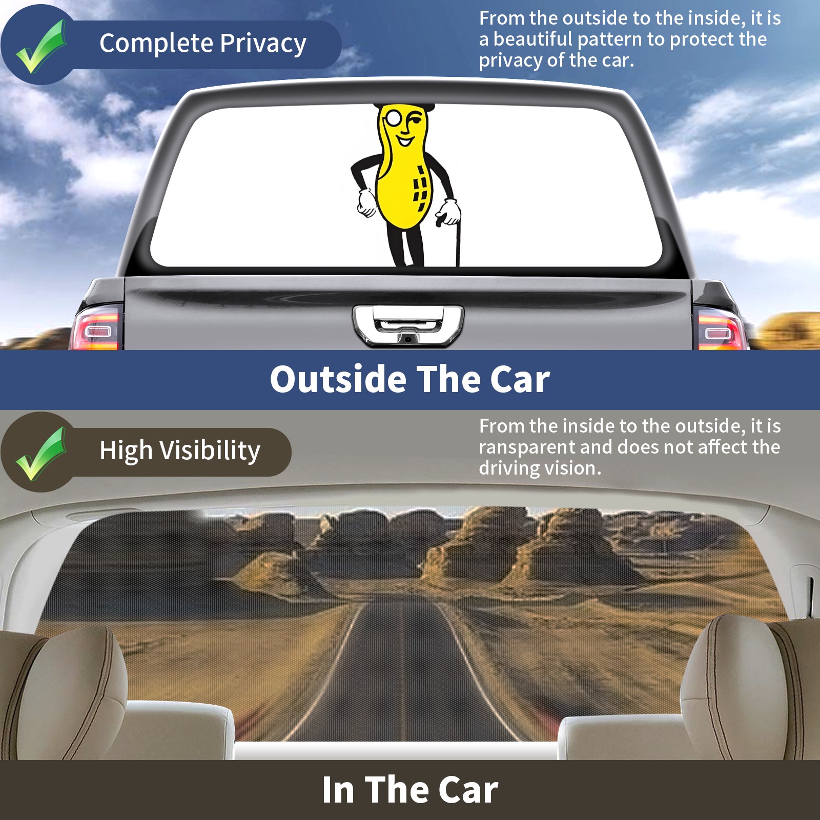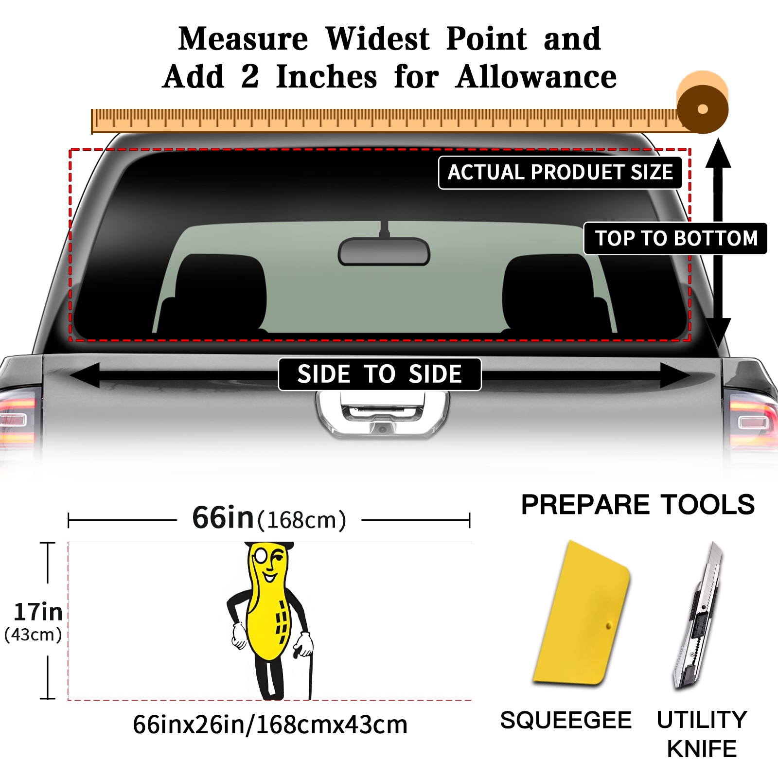 <p><strong>Truck Rear Window Graphics Decals Pickup Trucks Back Window Film Stickers 66" x 22" Perforated Vinyl Wrap Stickers Decorations for Car Rear Window</strong></p><p><strong><br /></strong></p><p><strong>Features :</strong></p><p>- Size of the rear window decals for trucks is 66x22 Inches (168x56cm).</p><p>- High quality perforated vinyl window film, one way vision sticker.</p><p>- Perforated is see through from the inside but not from outside.</p><p>- Clear printing, waterproof and durable.</p><p>- The car back window graphics stickers fits most truck and makes your vehicle more beautiful.&nbsp;</p><p><br /></p><p><strong>【Installation Instructions】</strong></p><p><strong>1. CLEAN SURFACE -</strong> Clean the rear window thoroughly and make sure the surface clean.</p><p><strong>2. STICK THE DECALS -</strong> Tear off the paper on the back and stick the decal on the window.</p><p><strong>3. SCRAPE OFF AIR BUBBLES -</strong> Use a squeegee or other card to scrape off the excess air bubbles.</p><p><strong>4. TRIM THE EXCESS -</strong> Use a knife to cut off the excess stickers of the window, finally complete.</p><p><br /></p><p>1. Please measure the size before purchasing, back window graphics decal for truck can be cut to your desired size.</p><p>2.The graphics stickers for truck back window is a great gift for yourself also can as a birthday / halloween / christmas gift for your friends and family.</p>