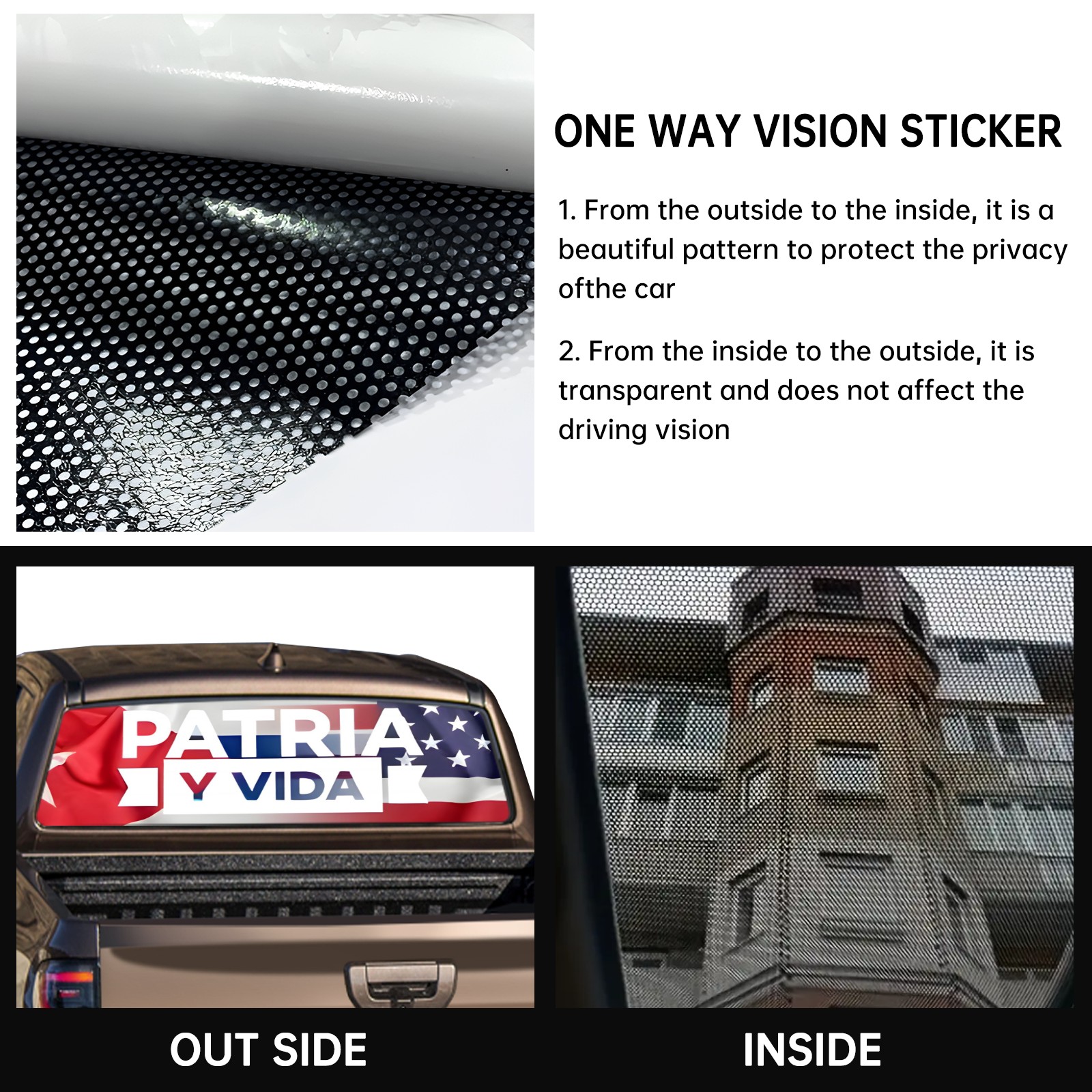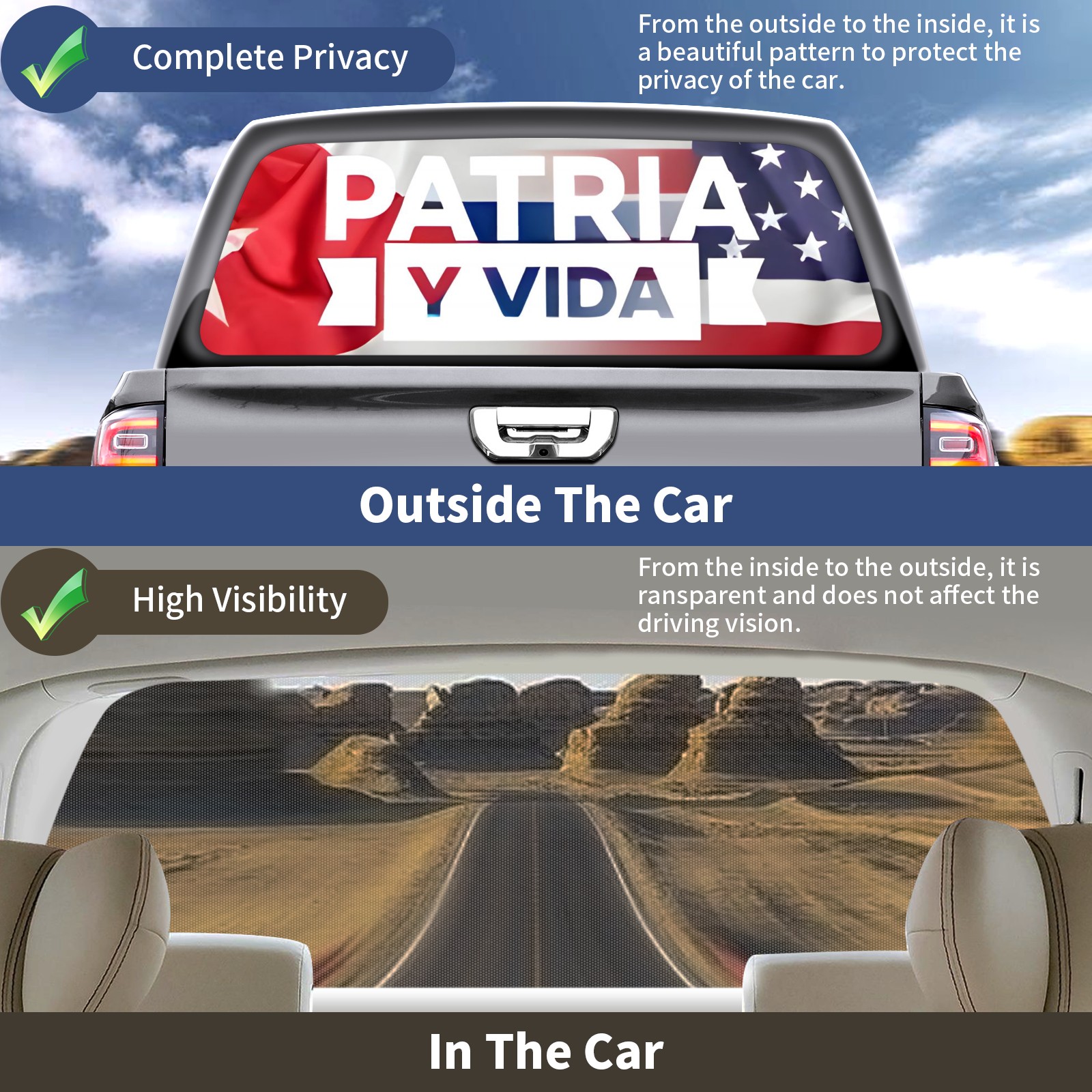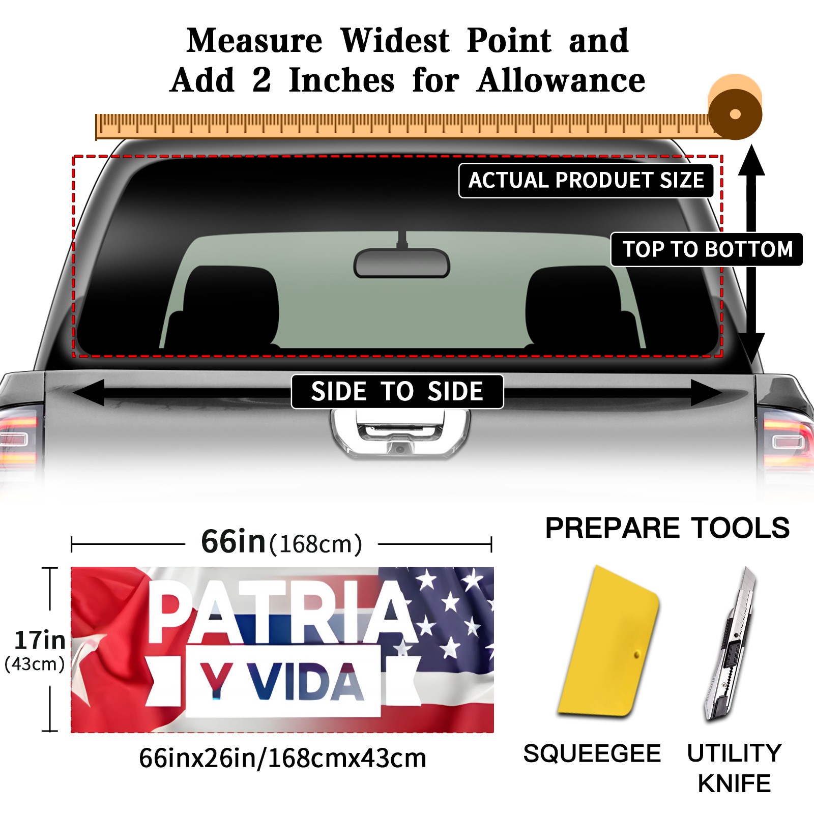 <p><strong>Truck Rear Window Graphics Decals Pickup Trucks Back Window Film Stickers 66" x 22" Perforated Vinyl Wrap Stickers Decorations for Car Rear Window</strong></p><p><strong><br /></strong></p><p><strong>Features :</strong></p><p>- Size of the rear window decals for trucks is 66x22 Inches (168x56cm).</p><p>- High quality perforated vinyl window film, one way vision sticker.</p><p>- Perforated is see through from the inside but not from outside.</p><p>- Clear printing, waterproof and durable.</p><p>- The car back window graphics stickers fits most truck and makes your vehicle more beautiful.&nbsp;</p><p><br /></p><p><strong>【Installation Instructions】</strong></p><p><strong>1. CLEAN SURFACE -</strong> Clean the rear window thoroughly and make sure the surface clean.</p><p><strong>2. STICK THE DECALS -</strong> Tear off the paper on the back and stick the decal on the window.</p><p><strong>3. SCRAPE OFF AIR BUBBLES -</strong> Use a squeegee or other card to scrape off the excess air bubbles.</p><p><strong>4. TRIM THE EXCESS -</strong> Use a knife to cut off the excess stickers of the window, finally complete.</p><p><br /></p><p>1. Please measure the size before purchasing, back window graphics decal for truck can be cut to your desired size.</p><p>2.The graphics stickers for truck back window is a great gift for yourself also can as a birthday / halloween / christmas gift for your friends and family.</p>
