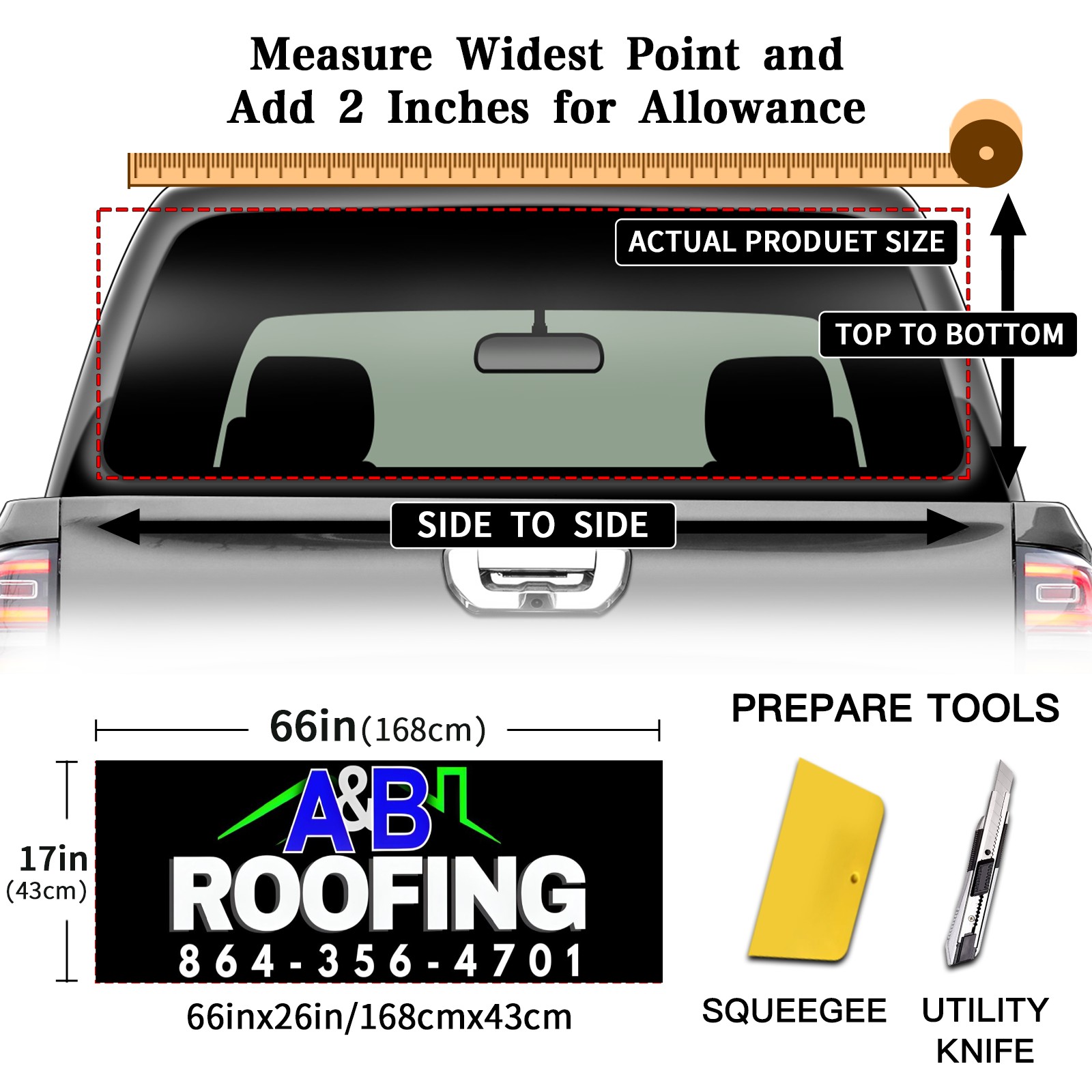<p><strong>Truck Rear Window Graphics Decals Pickup Trucks Back Window Film Stickers 66" x 22" Perforated Vinyl Wrap Stickers Decorations for Car Rear Window</strong></p><p><strong><br /></strong></p><p><strong>Features :</strong></p><p>- Size of the rear window decals for trucks is 66x22 Inches (168x56cm).</p><p>- High quality perforated vinyl window film, one way vision sticker.</p><p>- Perforated is see through from the inside but not from outside.</p><p>- Clear printing, waterproof and durable.</p><p>- The car back window graphics stickers fits most truck and makes your vehicle more beautiful.&nbsp;</p><p><br /></p><p><strong>【Installation Instructions】</strong></p><p><strong>1. CLEAN SURFACE -</strong> Clean the rear window thoroughly and make sure the surface clean.</p><p><strong>2. STICK THE DECALS -</strong> Tear off the paper on the back and stick the decal on the window.</p><p><strong>3. SCRAPE OFF AIR BUBBLES -</strong> Use a squeegee or other card to scrape off the excess air bubbles.</p><p><strong>4. TRIM THE EXCESS -</strong> Use a knife to cut off the excess stickers of the window, finally complete.</p><p><br /></p><p>1. Please measure the size before purchasing, back window graphics decal for truck can be cut to your desired size.</p><p>2.The graphics stickers for truck back window is a great gift for yourself also can as a birthday / halloween / christmas gift for your friends and family.</p>