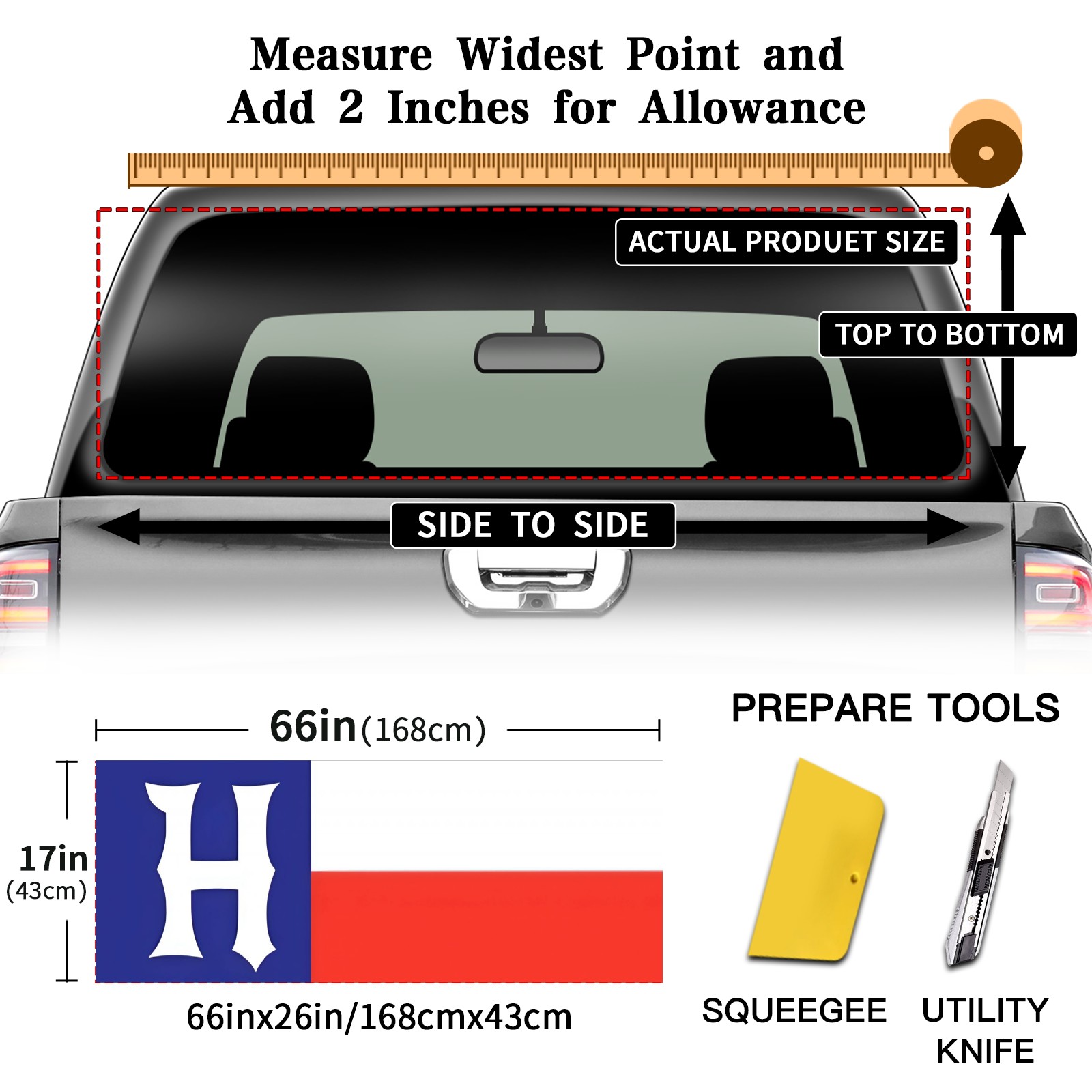<p><strong>Truck Rear Window Graphics Decals Pickup Trucks Back Window Film Stickers 66" x 22" Perforated Vinyl Wrap Stickers Decorations for Car Rear Window</strong></p><p><strong><br /></strong></p><p><strong>Features :</strong></p><p>- Size of the rear window decals for trucks is 66x22 Inches (168x56cm).</p><p>- High quality perforated vinyl window film, one way vision sticker.</p><p>- Perforated is see through from the inside but not from outside.</p><p>- Clear printing, waterproof and durable.</p><p>- The car back window graphics stickers fits most truck and makes your vehicle more beautiful.&nbsp;</p><p><br /></p><p><strong>【Installation Instructions】</strong></p><p><strong>1. CLEAN SURFACE -</strong> Clean the rear window thoroughly and make sure the surface clean.</p><p><strong>2. STICK THE DECALS -</strong> Tear off the paper on the back and stick the decal on the window.</p><p><strong>3. SCRAPE OFF AIR BUBBLES -</strong> Use a squeegee or other card to scrape off the excess air bubbles.</p><p><strong>4. TRIM THE EXCESS -</strong> Use a knife to cut off the excess stickers of the window, finally complete.</p><p><br /></p><p>1. Please measure the size before purchasing, back window graphics decal for truck can be cut to your desired size.</p><p>2.The graphics stickers for truck back window is a great gift for yourself also can as a birthday / halloween / christmas gift for your friends and family.</p>