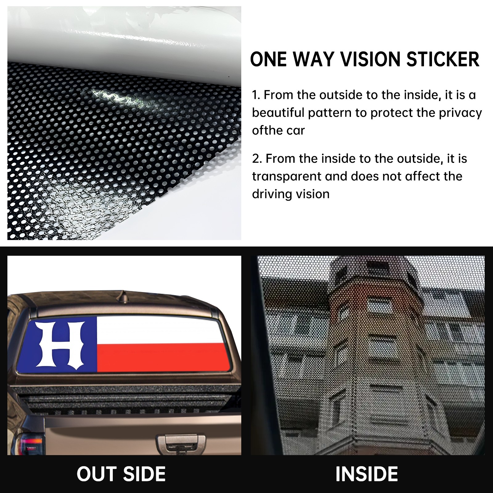 • <p><strong>Truck Rear Window Graphics Decals Pickup Trucks Back Window Film Stickers 66" x 22" Perforated Vinyl Wrap Stickers Decorations for Car Rear Window</strong></p><p><strong><br /></strong></p><p><strong>Features :</strong></p><p>- Size of the rear window decals for trucks is 66x22 Inches (168x56cm).</p><p>- High quality perforated vinyl window film, one way vision sticker.</p><p>- Perforated is see through from the inside but not from outside.</p><p>- Clear printing, waterproof and durable.</p><p>- The car back window graphics stickers fits most truck and makes your vehicle more beautiful.&nbsp;</p><p><br /></p><p><strong>【Installation Instructions】</strong></p><p><strong>1. CLEAN SURFACE -</strong> Clean the rear window thoroughly and make sure the surface clean.</p><p><strong>2. STICK THE DECALS -</strong> Tear off the paper on the back and stick the decal on the window.</p><p><strong>3. SCRAPE OFF AIR BUBBLES -</strong> Use a squeegee or other card to scrape off the excess air bubbles.</p><p><strong>4. TRIM THE EXCESS -</strong> Use a knife to cut off the excess stickers of the window, finally complete.</p><p><br /></p><p>1. Please measure the size before purchasing, back window graphics decal for truck can be cut to your desired size.</p><p>2.The graphics stickers for truck back window is a great gift for yourself also can as a birthday / halloween / christmas gift for your friends and family.</p>