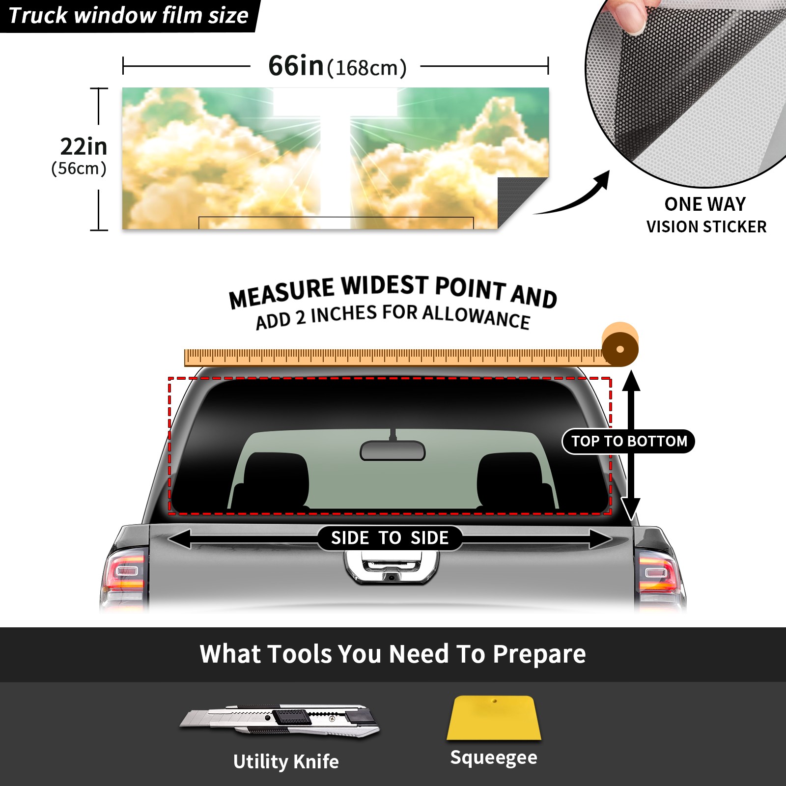 ●<b>Truck Rear Window Graphics Decals Pickup Trucks Back Window Film Stickers 66" x 22" Perforated Vinyl Wrap Stickers Decorations for Car Rear Window.</b><br> <br> <b>Features :</b><br> - Size of the rear window decals for trucks is 66x22 Inches (168x56cm).<br> - High quality perforated vinyl window film, one way vision sticker.<br> - Perforated is see through from the inside but not from outside.<br> - Clear printing, waterproof and continued.<br> - The car back window graphics stickers fits most truck and makes your vehicle more beautiful.<br> <br> <b>【Installation Instructions】</b><br> <b>1. CLEAN SURFACE - </b>Clean the rear window thoroughly and make sure the surface clean.<br> <b>2. STICK THE DECALS - </b>Tear off the paper on the back and stick the decal on the window.<br> <b>3. SCRAPE OFF AIR BUBBLES - </b>Use a squeegee or other card to scrape off the excess air bubbles.<br> <b>4. TRIM THE EXCESS -</b> Use a knife to cut off the excess stickers of the window, finally complete.<br> 1. Please measure the size before purchasing, back window graphics decal for truck can be cut to your desired size.<br> 2.The graphics stickers for truck back window is a great gift for yourself also can as a birthday / halloween / christmas gift for your friends and family.<br> <b>Decorate Your Pickup Truck With Rear Window Decal Today!</b>