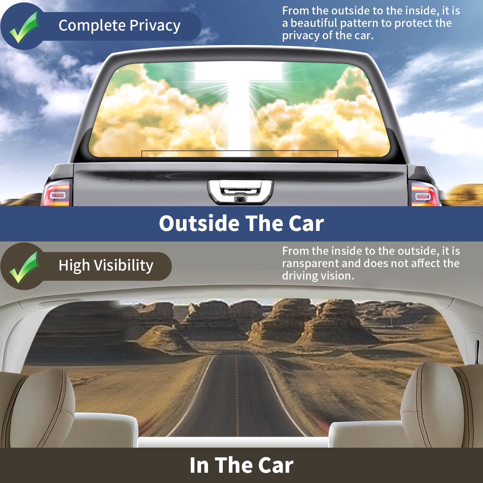 • ●<b>Truck Rear Window Graphics Decals Pickup Trucks Back Window Film Stickers 66" x 22" Perforated Vinyl Wrap Stickers Decorations for Car Rear Window.</b><br> <br> <b>Features :</b><br> - Size of the rear window decals for trucks is 66x22 Inches (168x56cm).<br> - High quality perforated vinyl window film, one way vision sticker.<br> - Perforated is see through from the inside but not from outside.<br> - Clear printing, waterproof and continued.<br> - The car back window graphics stickers fits most truck and makes your vehicle more beautiful.<br> <br> <b>【Installation Instructions】</b><br> <b>1. CLEAN SURFACE - </b>Clean the rear window thoroughly and make sure the surface clean.<br> <b>2. STICK THE DECALS - </b>Tear off the paper on the back and stick the decal on the window.<br> <b>3. SCRAPE OFF AIR BUBBLES - </b>Use a squeegee or other card to scrape off the excess air bubbles.<br> <b>4. TRIM THE EXCESS -</b> Use a knife to cut off the excess stickers of the window, finally complete.<br> 1. Please measure the size before purchasing, back window graphics decal for truck can be cut to your desired size.<br> 2.The graphics stickers for truck back window is a great gift for yourself also can as a birthday / halloween / christmas gift for your friends and family.<br> <b>Decorate Your Pickup Truck With Rear Window Decal Today!</b>