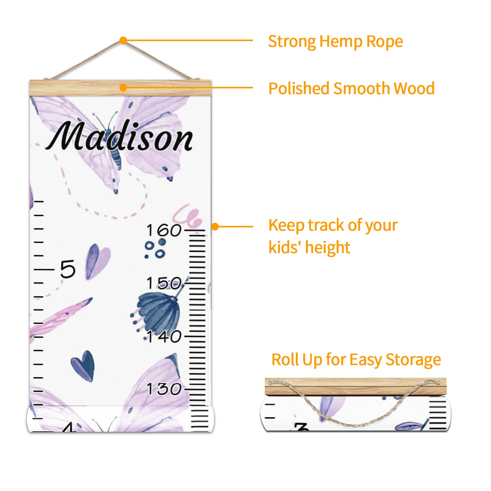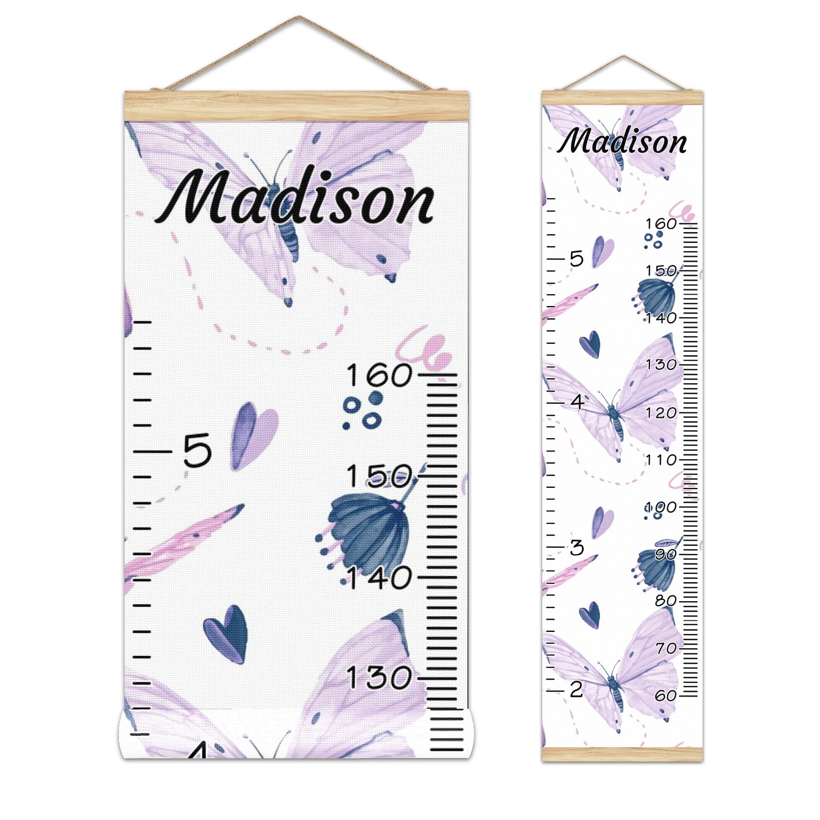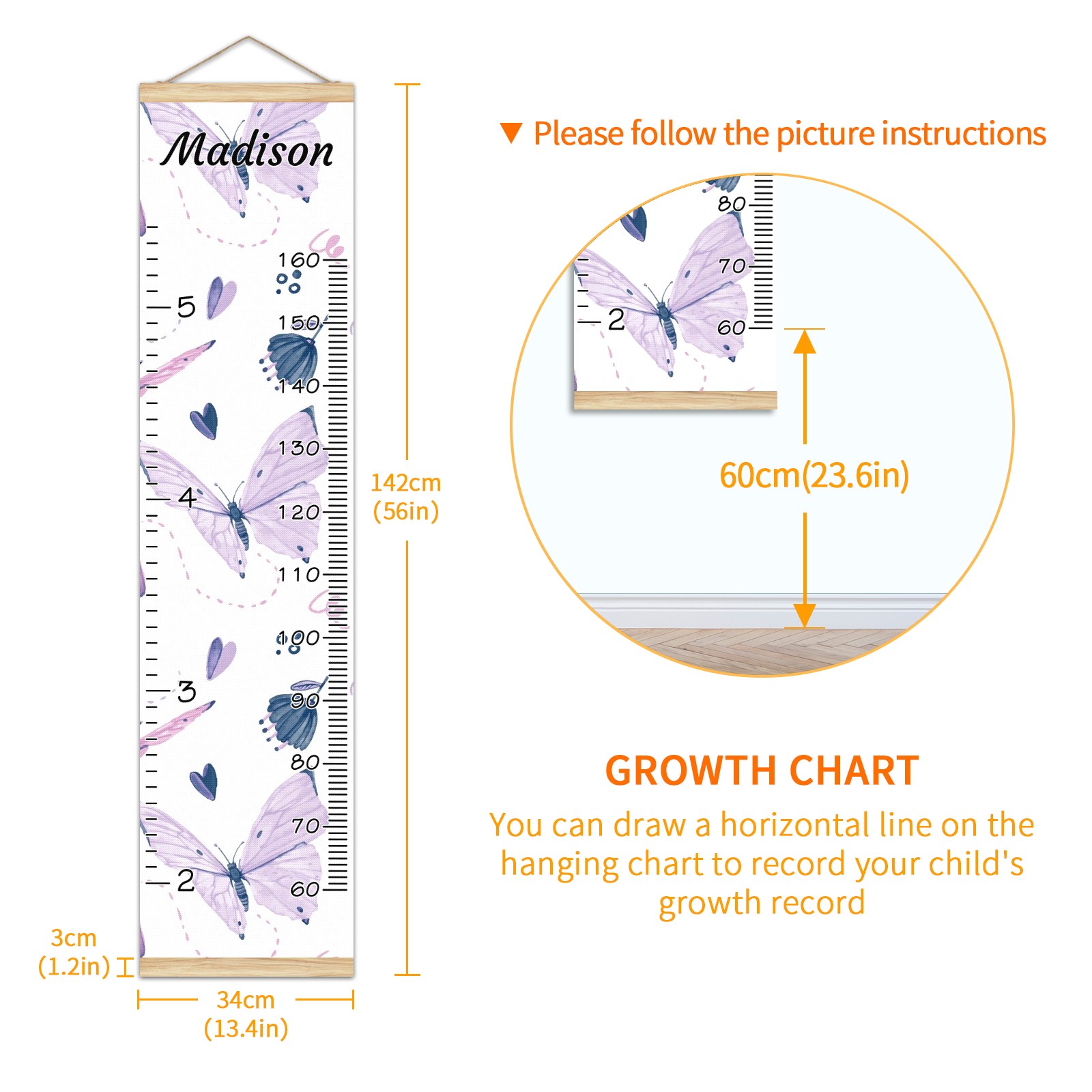 Personalized Kids Name Growth Chart Ruler for Wall Wood Frame Canvas Height Measure Chart 13.4x56 in Hanging Growth Chart Butterflies Purple2.10 Boys Girls Room Decor