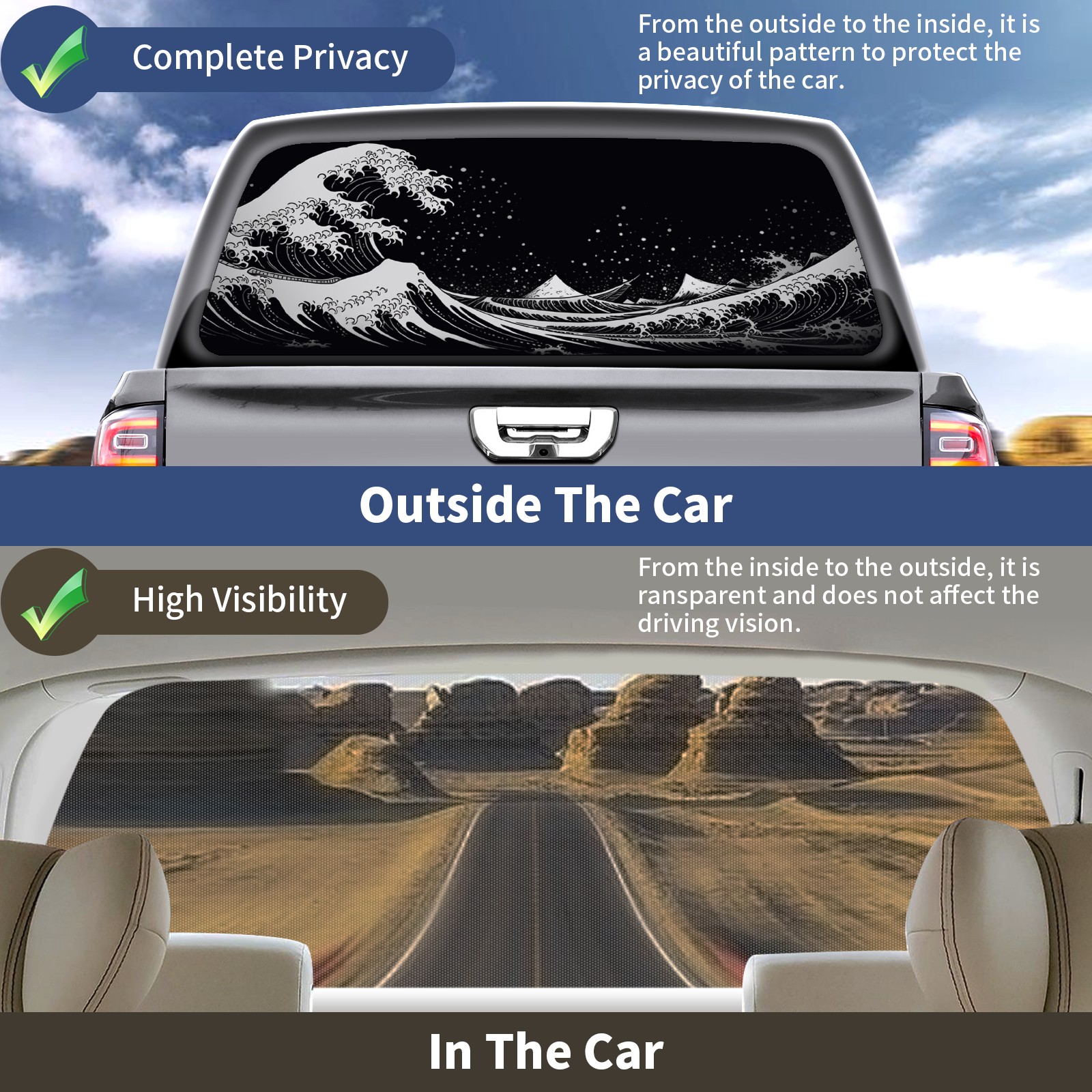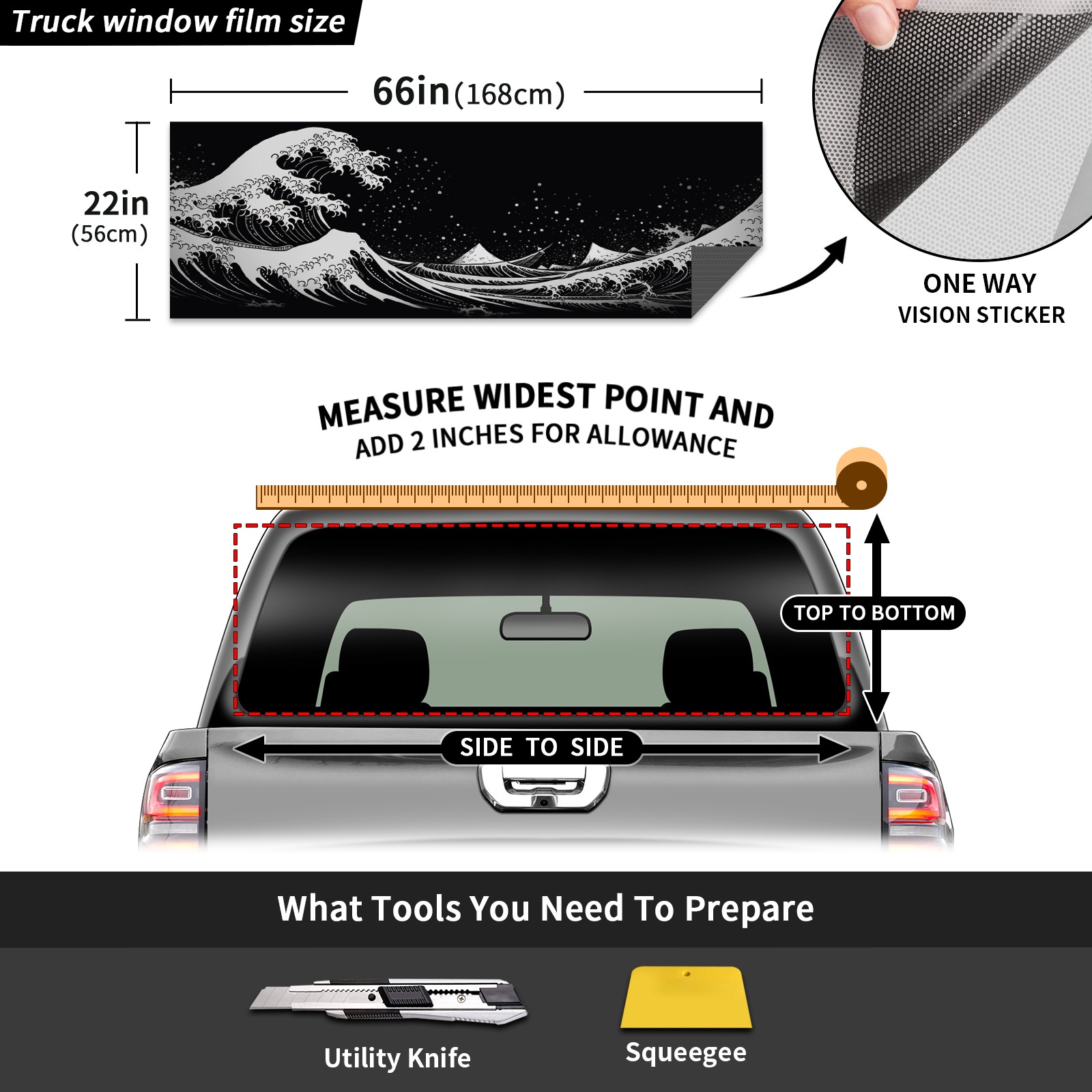 • ●<b>Truck Rear Window Graphics Decals Pickup Trucks Back Window Film Stickers 66" x 22" Perforated Vinyl Wrap Stickers Decorations for Car Rear Window.</b><br> <br> <b>Features :</b><br> - Size of the rear window decals for trucks is 66x22 Inches (168x56cm).<br> - High quality perforated vinyl window film, one way vision sticker.<br> - Perforated is see through from the inside but not from outside.<br> - Clear printing, waterproof and continued.<br> - The car back window graphics stickers fits most truck and makes your vehicle more beautiful.<br> <br> <b>【Installation Instructions】</b><br> <b>1. CLEAN SURFACE - </b>Clean the rear window thoroughly and make sure the surface clean.<br> <b>2. STICK THE DECALS - </b>Tear off the paper on the back and stick the decal on the window.<br> <b>3. SCRAPE OFF AIR BUBBLES - </b>Use a squeegee or other card to scrape off the excess air bubbles.<br> <b>4. TRIM THE EXCESS -</b> Use a knife to cut off the excess stickers of the window, finally complete.<br> 1. Please measure the size before purchasing, back window graphics decal for truck can be cut to your desired size.<br> 2.The graphics stickers for truck back window is a great gift for yourself also can as a birthday / halloween / christmas gift for your friends and family.<br> <b>Decorate Your Pickup Truck With Rear Window Decal Today!</b>
