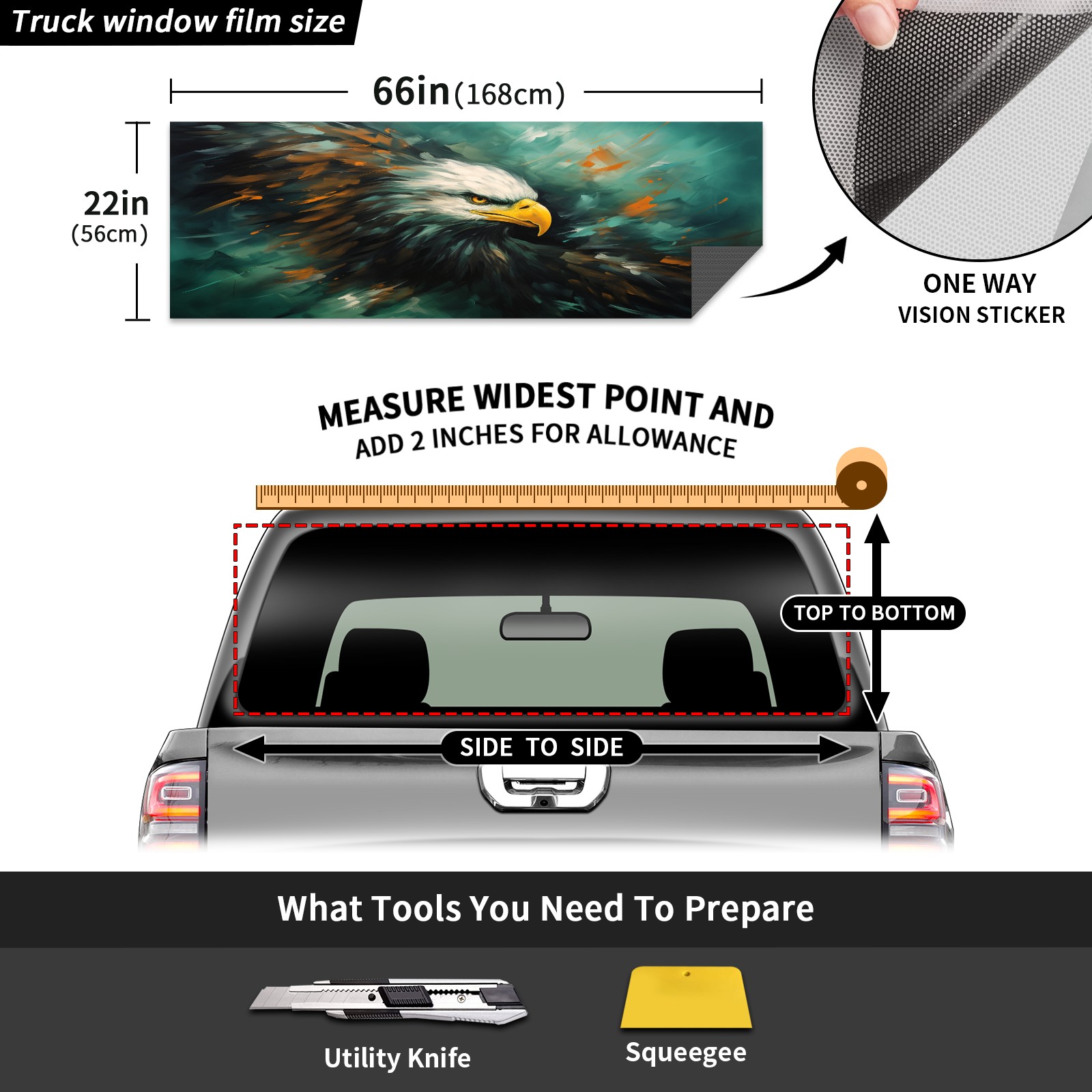 ●<b>Truck Rear Window Graphics Decals Pickup Trucks Back Window Film Stickers 66" x 22" Perforated Vinyl Wrap Stickers Decorations for Car Rear Window.</b><br> <br> <b>Features :</b><br> - Size of the rear window decals for trucks is 66x22 Inches (168x56cm).<br> - High quality perforated vinyl window film, one way vision sticker.<br> - Perforated is see through from the inside but not from outside.<br> - Clear printing, waterproof and continued.<br> - The car back window graphics stickers fits most truck and makes your vehicle more beautiful.<br> <br> <b>【Installation Instructions】</b><br> <b>1. CLEAN SURFACE - </b>Clean the rear window thoroughly and make sure the surface clean.<br> <b>2. STICK THE DECALS - </b>Tear off the paper on the back and stick the decal on the window.<br> <b>3. SCRAPE OFF AIR BUBBLES - </b>Use a squeegee or other card to scrape off the excess air bubbles.<br> <b>4. TRIM THE EXCESS -</b> Use a knife to cut off the excess stickers of the window, finally complete.<br> 1. Please measure the size before purchasing, back window graphics decal for truck can be cut to your desired size.<br> 2.The graphics stickers for truck back window is a great gift for yourself also can as a birthday / halloween / christmas gift for your friends and family.<br> <b>Decorate Your Pickup Truck With Rear Window Decal Today!</b>