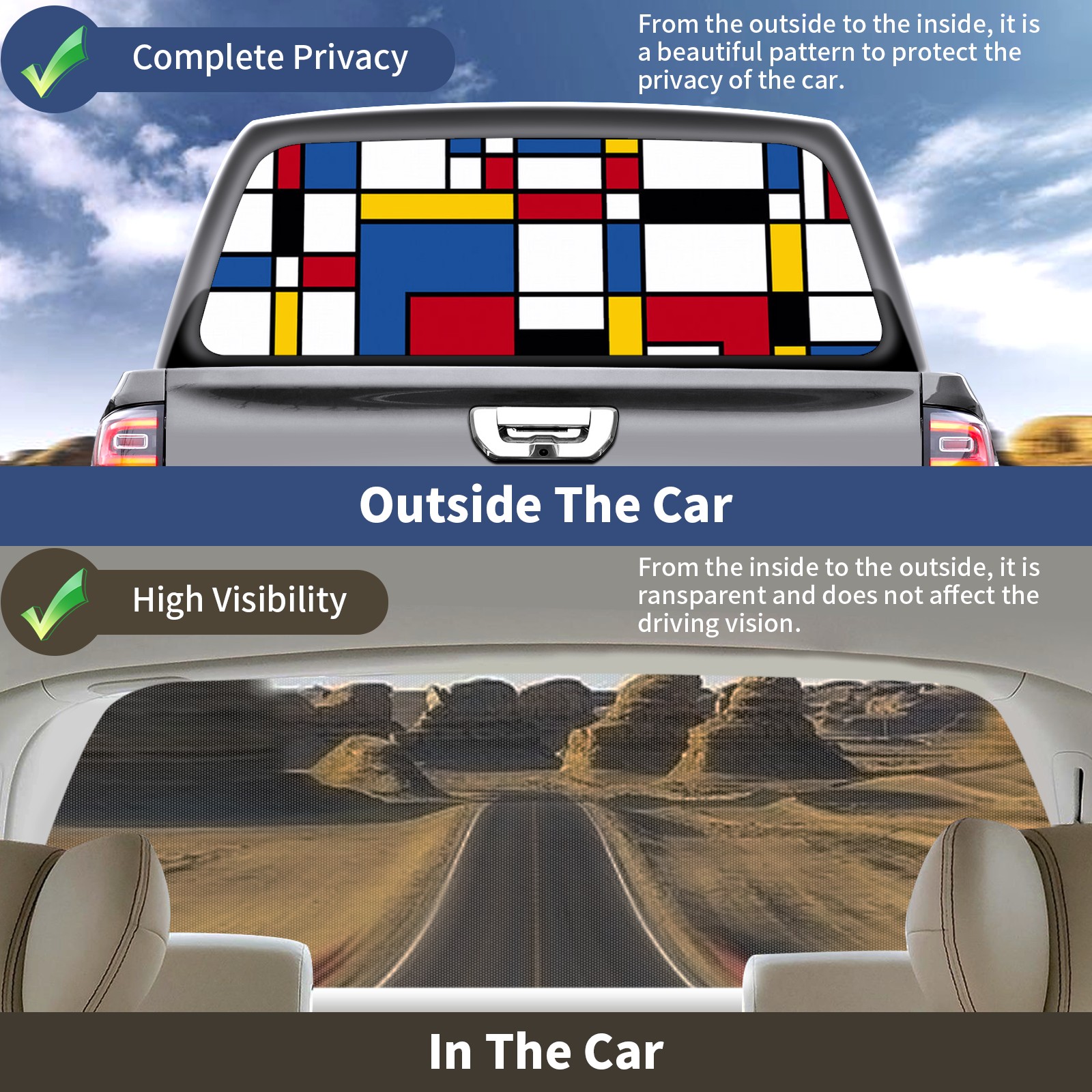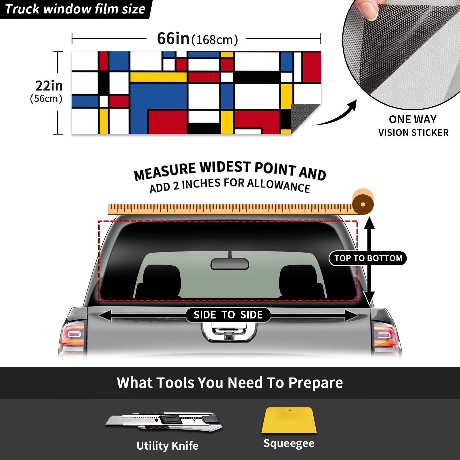 • ●<b>Truck Rear Window Graphics Decals Pickup Trucks Back Window Film Stickers 66" x 22" Perforated Vinyl Wrap Stickers Decorations for Car Rear Window.</b><br> <br> <b>Features :</b><br> - Size of the rear window decals for trucks is 66x22 Inches (168x56cm).<br> - High quality perforated vinyl window film, one way vision sticker.<br> - Perforated is see through from the inside but not from outside.<br> - Clear printing, waterproof and continued.<br> - The car back window graphics stickers fits most truck and makes your vehicle more beautiful.<br> <br> <b>【Installation Instructions】</b><br> <b>1. CLEAN SURFACE - </b>Clean the rear window thoroughly and make sure the surface clean.<br> <b>2. STICK THE DECALS - </b>Tear off the paper on the back and stick the decal on the window.<br> <b>3. SCRAPE OFF AIR BUBBLES - </b>Use a squeegee or other card to scrape off the excess air bubbles.<br> <b>4. TRIM THE EXCESS -</b> Use a knife to cut off the excess stickers of the window, finally complete.<br> 1. Please measure the size before purchasing, back window graphics decal for truck can be cut to your desired size.<br> 2.The graphics stickers for truck back window is a great gift for yourself also can as a birthday / halloween / christmas gift for your friends and family.<br> <b>Decorate Your Pickup Truck With Rear Window Decal Today!</b>