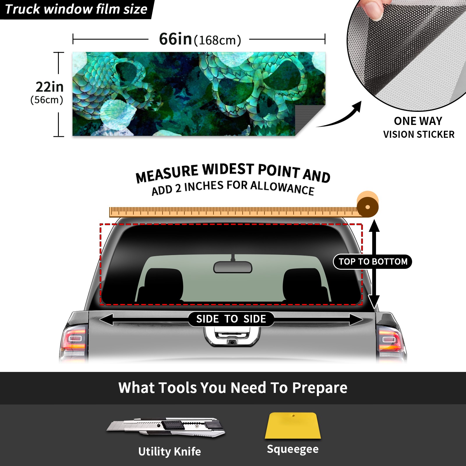●<b>Truck Rear Window Graphics Decals Pickup Trucks Back Window Film Stickers 66" x 22" Perforated Vinyl Wrap Stickers Decorations for Car Rear Window.</b><br> <br> <b>Features :</b><br> - Size of the rear window decals for trucks is 66x22 Inches (168x56cm).<br> - High quality perforated vinyl window film, one way vision sticker.<br> - Perforated is see through from the inside but not from outside.<br> - Clear printing, waterproof and continued.<br> - The car back window graphics stickers fits most truck and makes your vehicle more beautiful.<br> <br> <b>【Installation Instructions】</b><br> <b>1. CLEAN SURFACE - </b>Clean the rear window thoroughly and make sure the surface clean.<br> <b>2. STICK THE DECALS - </b>Tear off the paper on the back and stick the decal on the window.<br> <b>3. SCRAPE OFF AIR BUBBLES - </b>Use a squeegee or other card to scrape off the excess air bubbles.<br> <b>4. TRIM THE EXCESS -</b> Use a knife to cut off the excess stickers of the window, finally complete.<br> 1. Please measure the size before purchasing, back window graphics decal for truck can be cut to your desired size.<br> 2.The graphics stickers for truck back window is a great gift for yourself also can as a birthday / halloween / christmas gift for your friends and family.<br> <b>Decorate Your Pickup Truck With Rear Window Decal Today!</b>