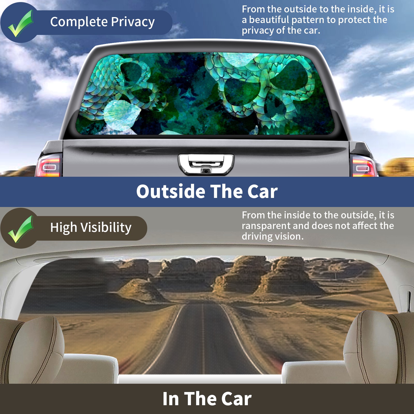 • ●<b>Truck Rear Window Graphics Decals Pickup Trucks Back Window Film Stickers 66" x 22" Perforated Vinyl Wrap Stickers Decorations for Car Rear Window.</b><br> <br> <b>Features :</b><br> - Size of the rear window decals for trucks is 66x22 Inches (168x56cm).<br> - High quality perforated vinyl window film, one way vision sticker.<br> - Perforated is see through from the inside but not from outside.<br> - Clear printing, waterproof and continued.<br> - The car back window graphics stickers fits most truck and makes your vehicle more beautiful.<br> <br> <b>【Installation Instructions】</b><br> <b>1. CLEAN SURFACE - </b>Clean the rear window thoroughly and make sure the surface clean.<br> <b>2. STICK THE DECALS - </b>Tear off the paper on the back and stick the decal on the window.<br> <b>3. SCRAPE OFF AIR BUBBLES - </b>Use a squeegee or other card to scrape off the excess air bubbles.<br> <b>4. TRIM THE EXCESS -</b> Use a knife to cut off the excess stickers of the window, finally complete.<br> 1. Please measure the size before purchasing, back window graphics decal for truck can be cut to your desired size.<br> 2.The graphics stickers for truck back window is a great gift for yourself also can as a birthday / halloween / christmas gift for your friends and family.<br> <b>Decorate Your Pickup Truck With Rear Window Decal Today!</b>