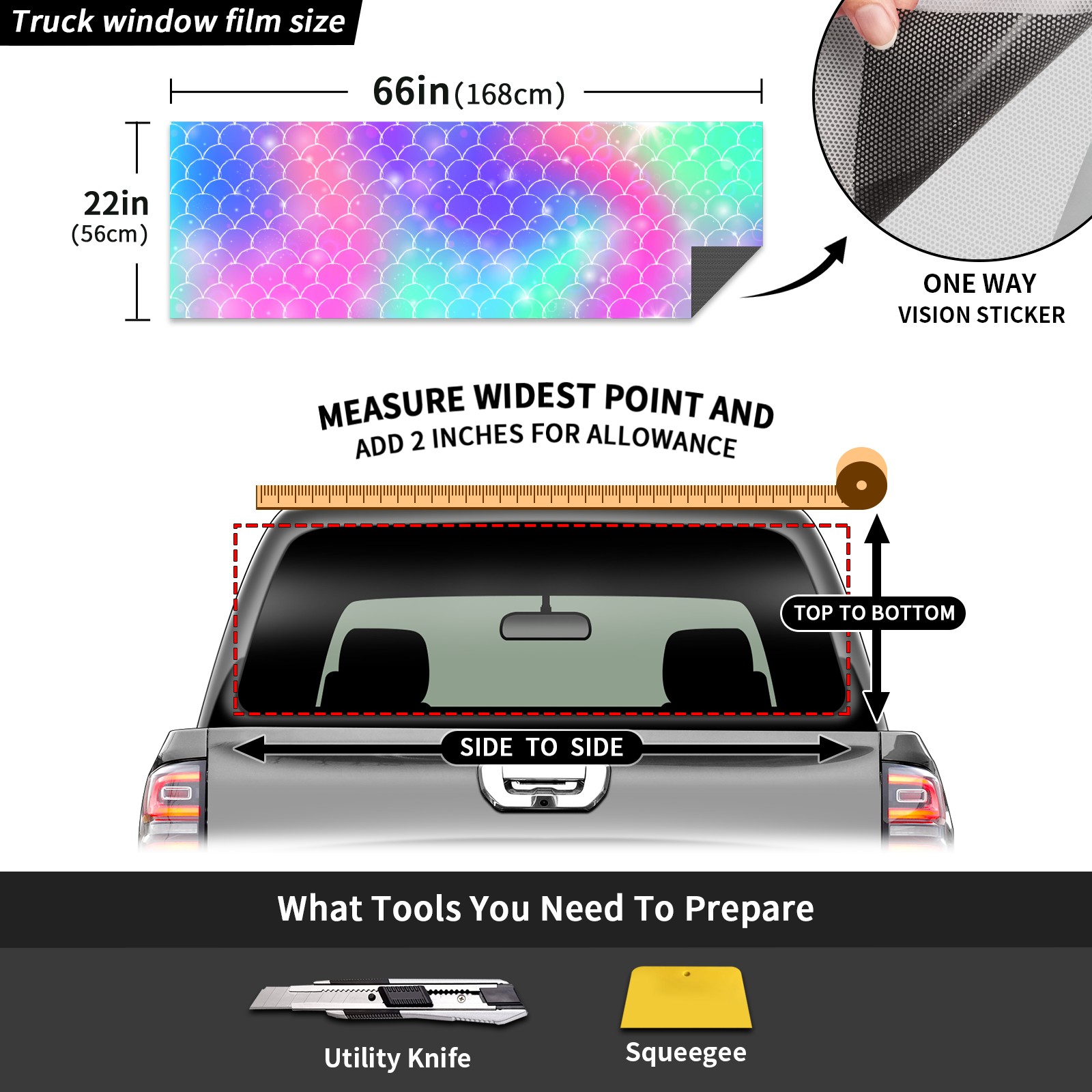 • ●<b>Truck Rear Window Graphics Decals Pickup Trucks Back Window Film Stickers 66" x 22" Perforated Vinyl Wrap Stickers Decorations for Car Rear Window.</b><br> <br> <b>Features :</b><br> - Size of the rear window decals for trucks is 66x22 Inches (168x56cm).<br> - High quality perforated vinyl window film, one way vision sticker.<br> - Perforated is see through from the inside but not from outside.<br> - Clear printing, waterproof and continued.<br> - The car back window graphics stickers fits most truck and makes your vehicle more beautiful.<br> <br> <b>【Installation Instructions】</b><br> <b>1. CLEAN SURFACE - </b>Clean the rear window thoroughly and make sure the surface clean.<br> <b>2. STICK THE DECALS - </b>Tear off the paper on the back and stick the decal on the window.<br> <b>3. SCRAPE OFF AIR BUBBLES - </b>Use a squeegee or other card to scrape off the excess air bubbles.<br> <b>4. TRIM THE EXCESS -</b> Use a knife to cut off the excess stickers of the window, finally complete.<br> 1. Please measure the size before purchasing, back window graphics decal for truck can be cut to your desired size.<br> 2.The graphics stickers for truck back window is a great gift for yourself also can as a birthday / halloween / christmas gift for your friends and family.<br> <b>Decorate Your Pickup Truck With Rear Window Decal Today!</b>