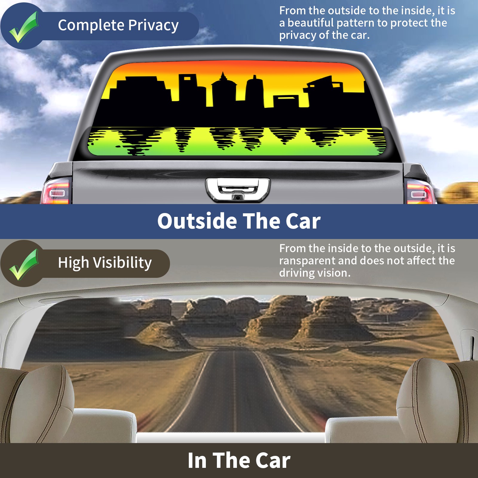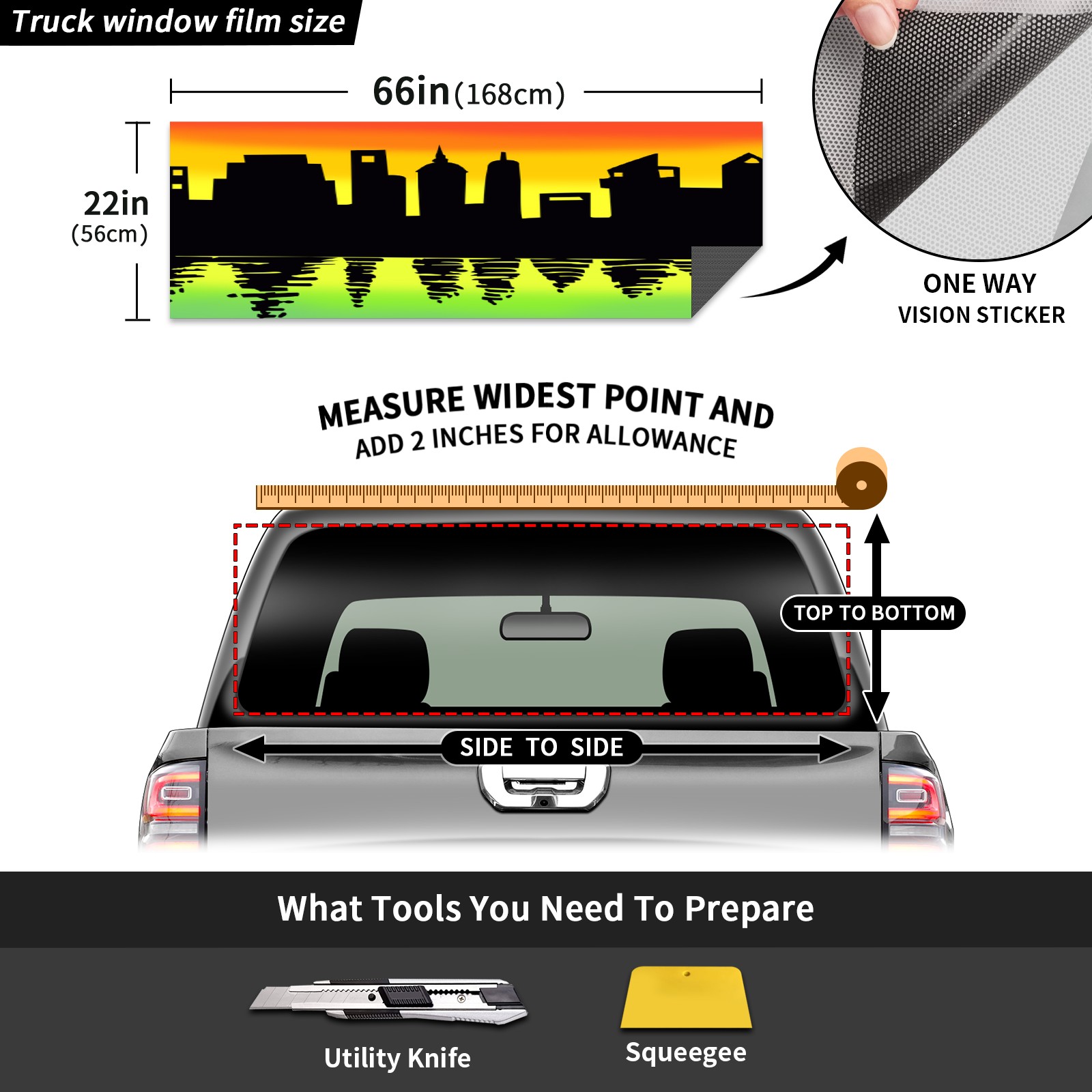 • ●<b>Truck Rear Window Graphics Decals Pickup Trucks Back Window Film Stickers 66" x 22" Perforated Vinyl Wrap Stickers Decorations for Car Rear Window.</b><br> <br> <b>Features :</b><br> - Size of the rear window decals for trucks is 66x22 Inches (168x56cm).<br> - High quality perforated vinyl window film, one way vision sticker.<br> - Perforated is see through from the inside but not from outside.<br> - Clear printing, waterproof and continued.<br> - The car back window graphics stickers fits most truck and makes your vehicle more beautiful.<br> <br> <b>【Installation Instructions】</b><br> <b>1. CLEAN SURFACE - </b>Clean the rear window thoroughly and make sure the surface clean.<br> <b>2. STICK THE DECALS - </b>Tear off the paper on the back and stick the decal on the window.<br> <b>3. SCRAPE OFF AIR BUBBLES - </b>Use a squeegee or other card to scrape off the excess air bubbles.<br> <b>4. TRIM THE EXCESS -</b> Use a knife to cut off the excess stickers of the window, finally complete.<br> 1. Please measure the size before purchasing, back window graphics decal for truck can be cut to your desired size.<br> 2.The graphics stickers for truck back window is a great gift for yourself also can as a birthday / halloween / christmas gift for your friends and family.<br> <b>Decorate Your Pickup Truck With Rear Window Decal Today!</b>