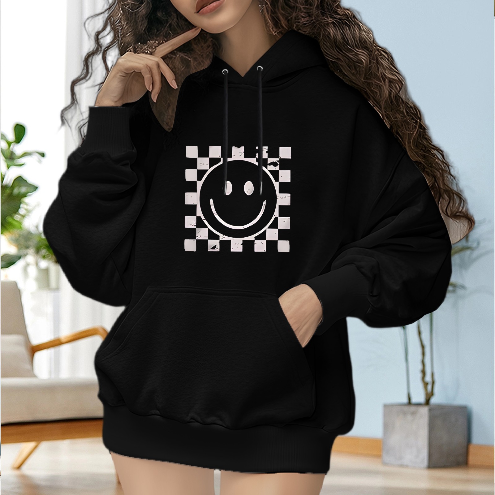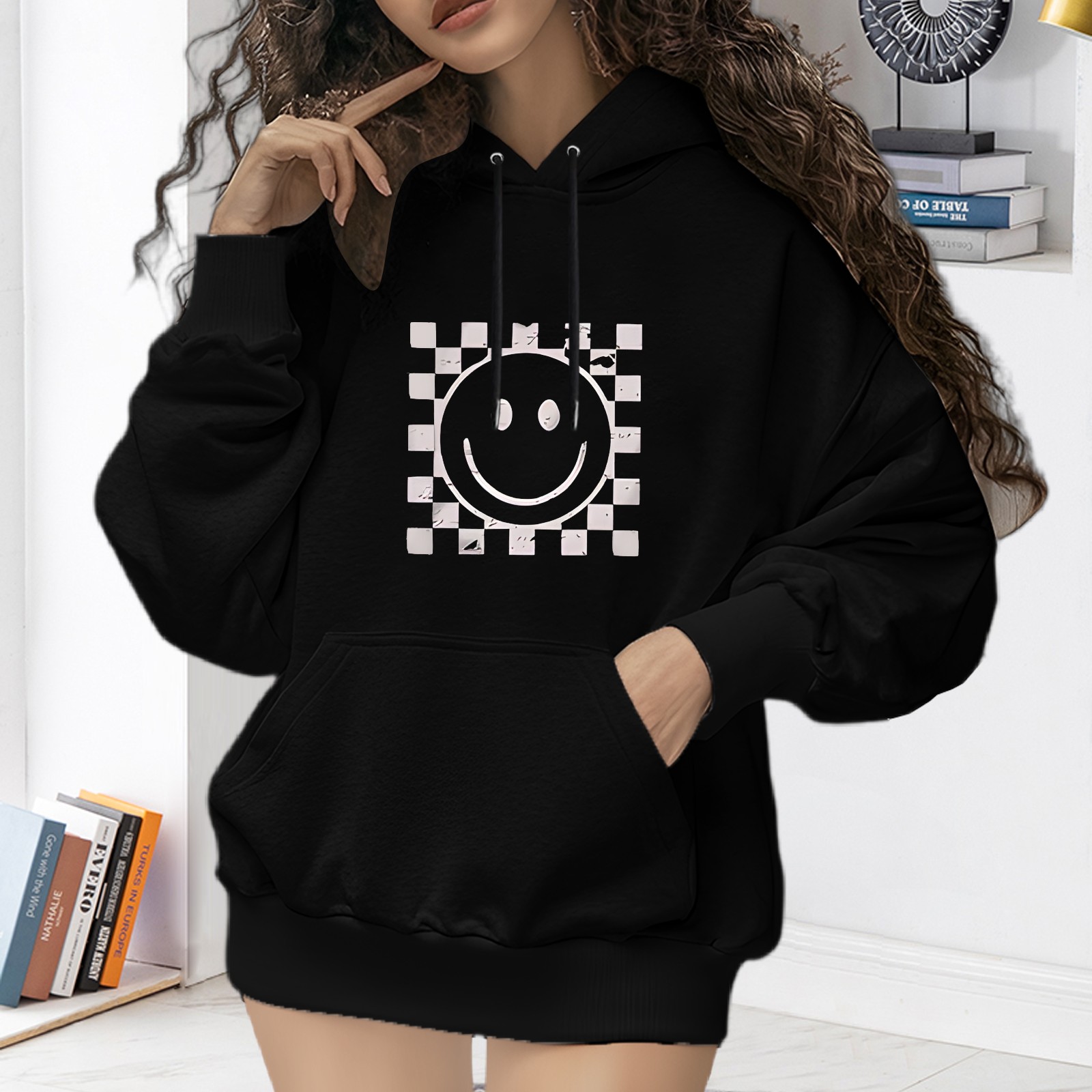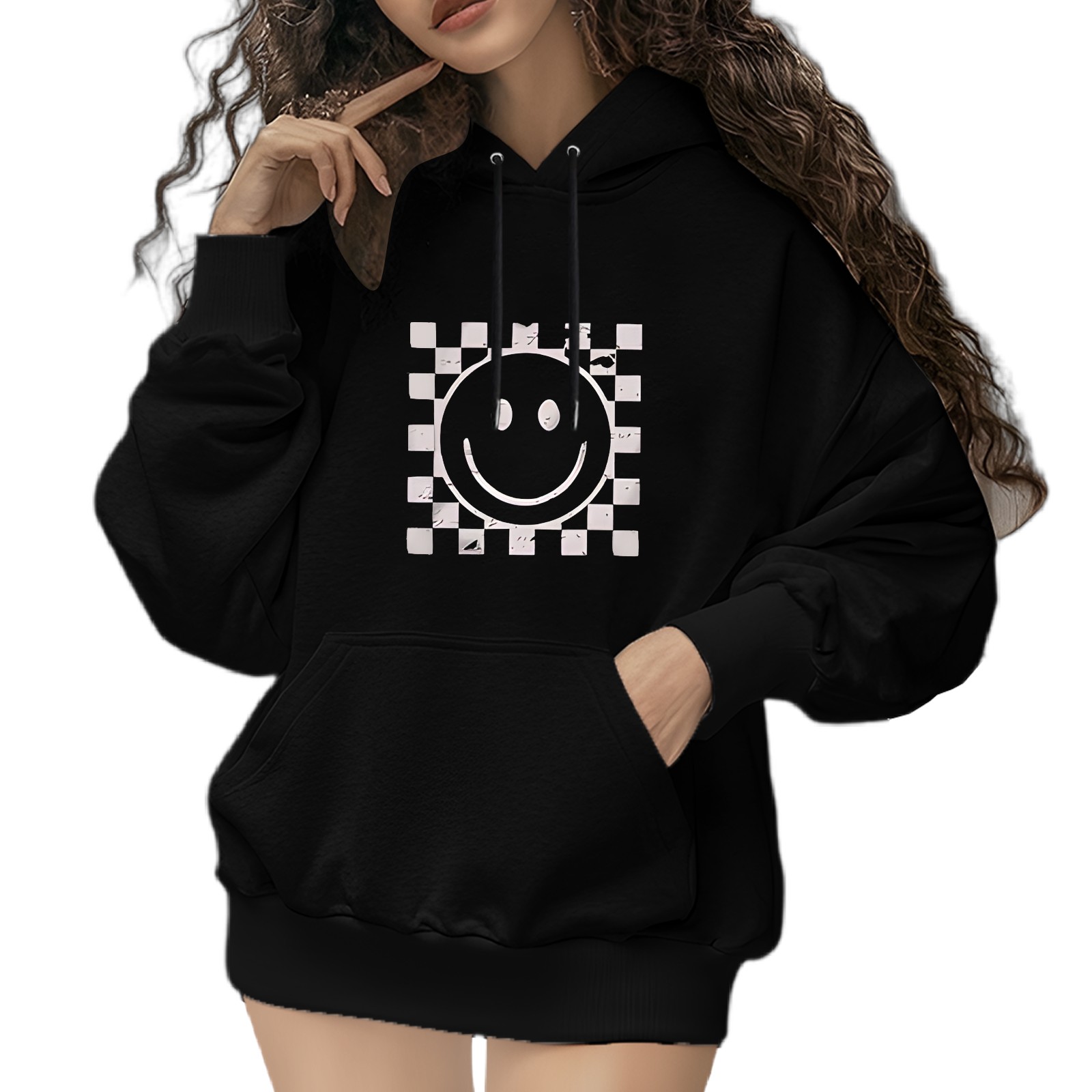 Trendy Smiling Face Checkered Print Printed Women's Hooded Sweatshirt, Loose And Stylish Long Sleeved Top, Is The Perfect Gift For Valentine's Day, Suitable For Daily Outdoor Wear