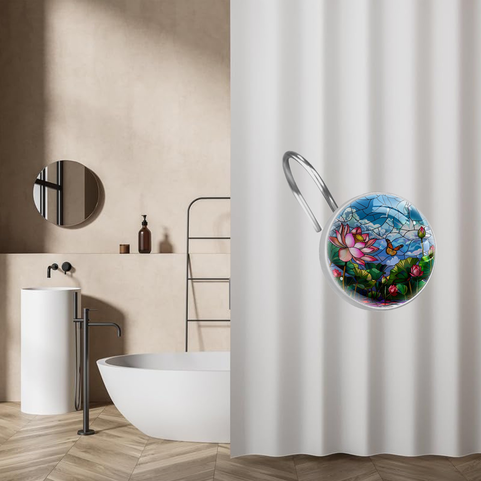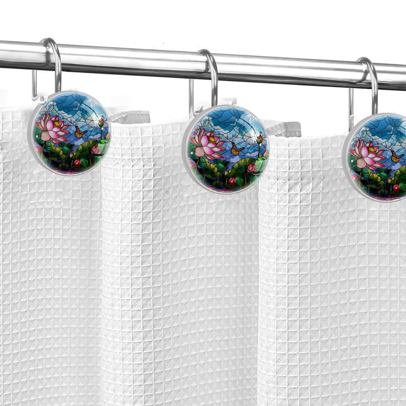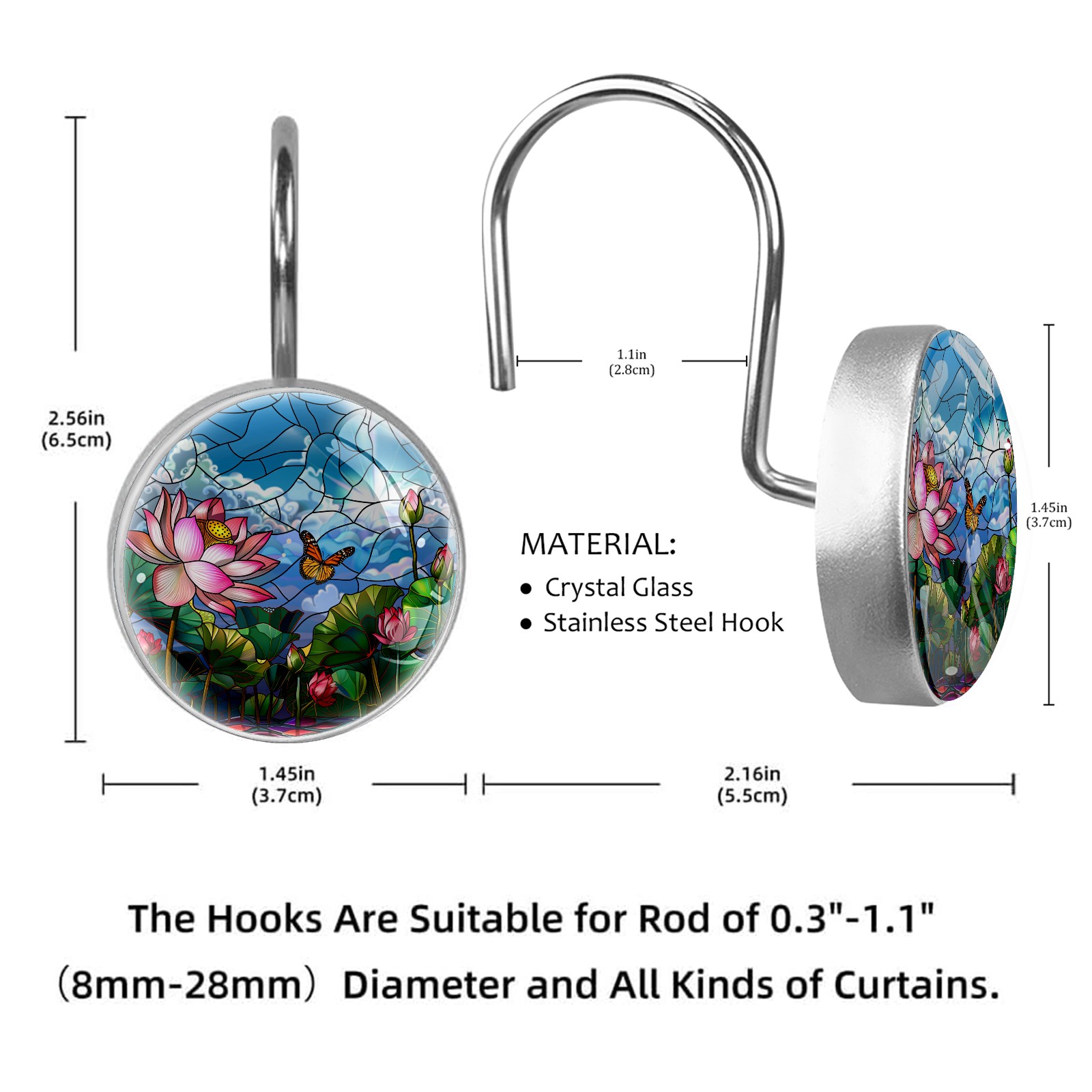 Decorative Stained Glass Pink Lotus Shower Curtain Hooks 12pcs Crystal Glass Rustproof Shower Hooks for Bathroom Home Decor Stainless Steel Resin Shower Curtain Rings