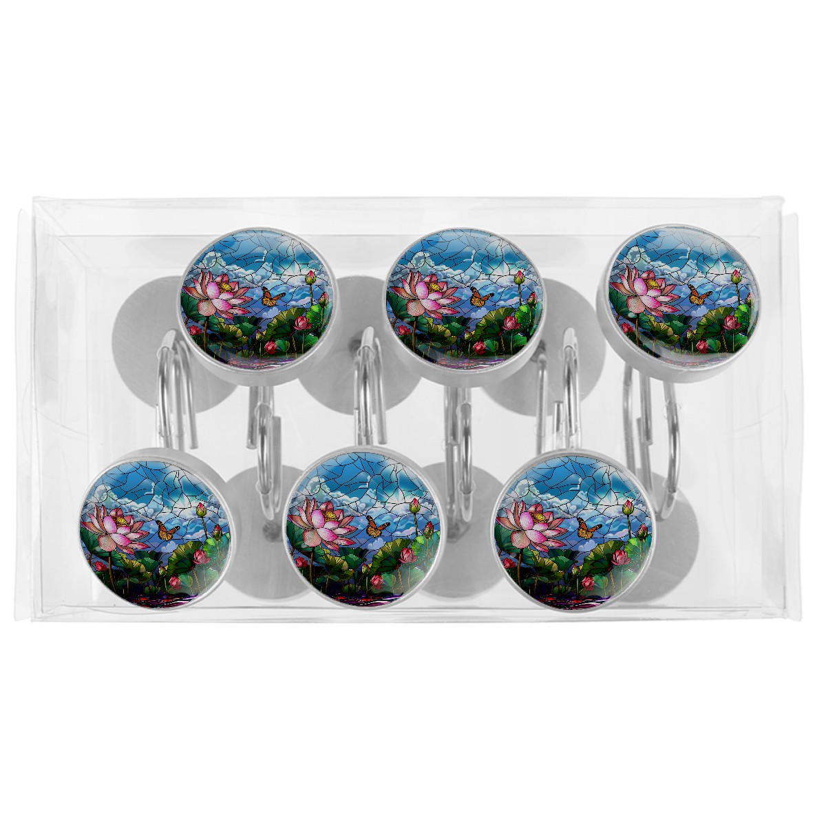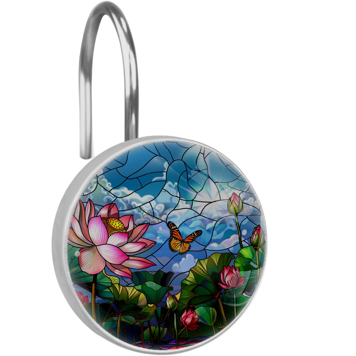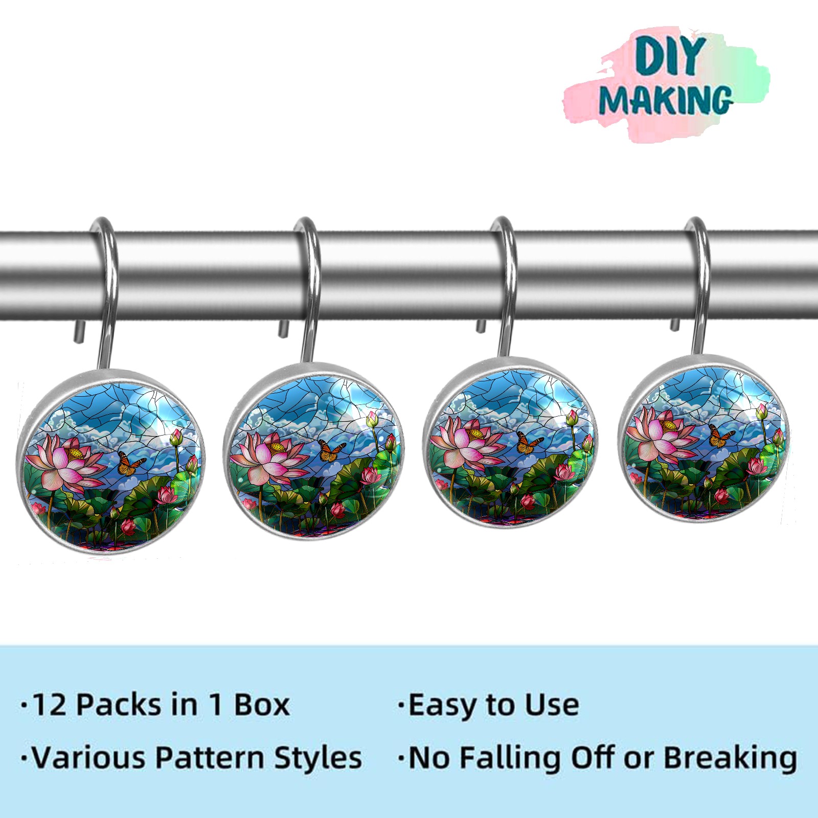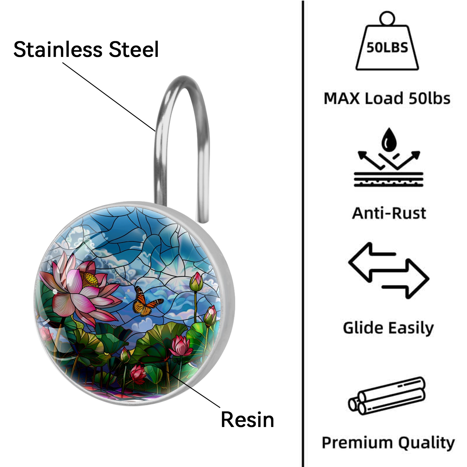 Decorative Stained Glass Pink Lotus Shower Curtain Hooks 12pcs Crystal Glass Rustproof Shower Hooks for Bathroom Home Decor Stainless Steel Resin Shower Curtain Rings