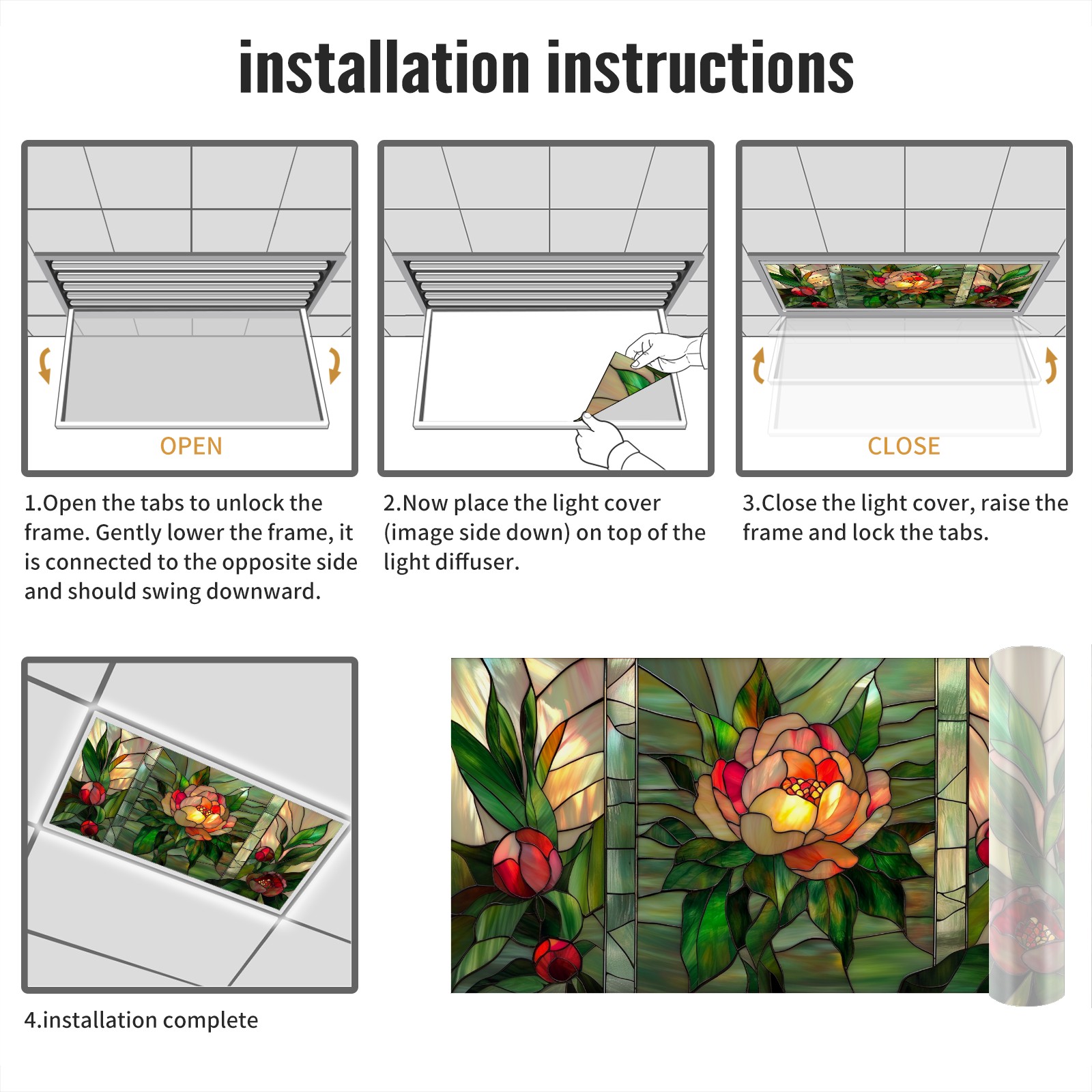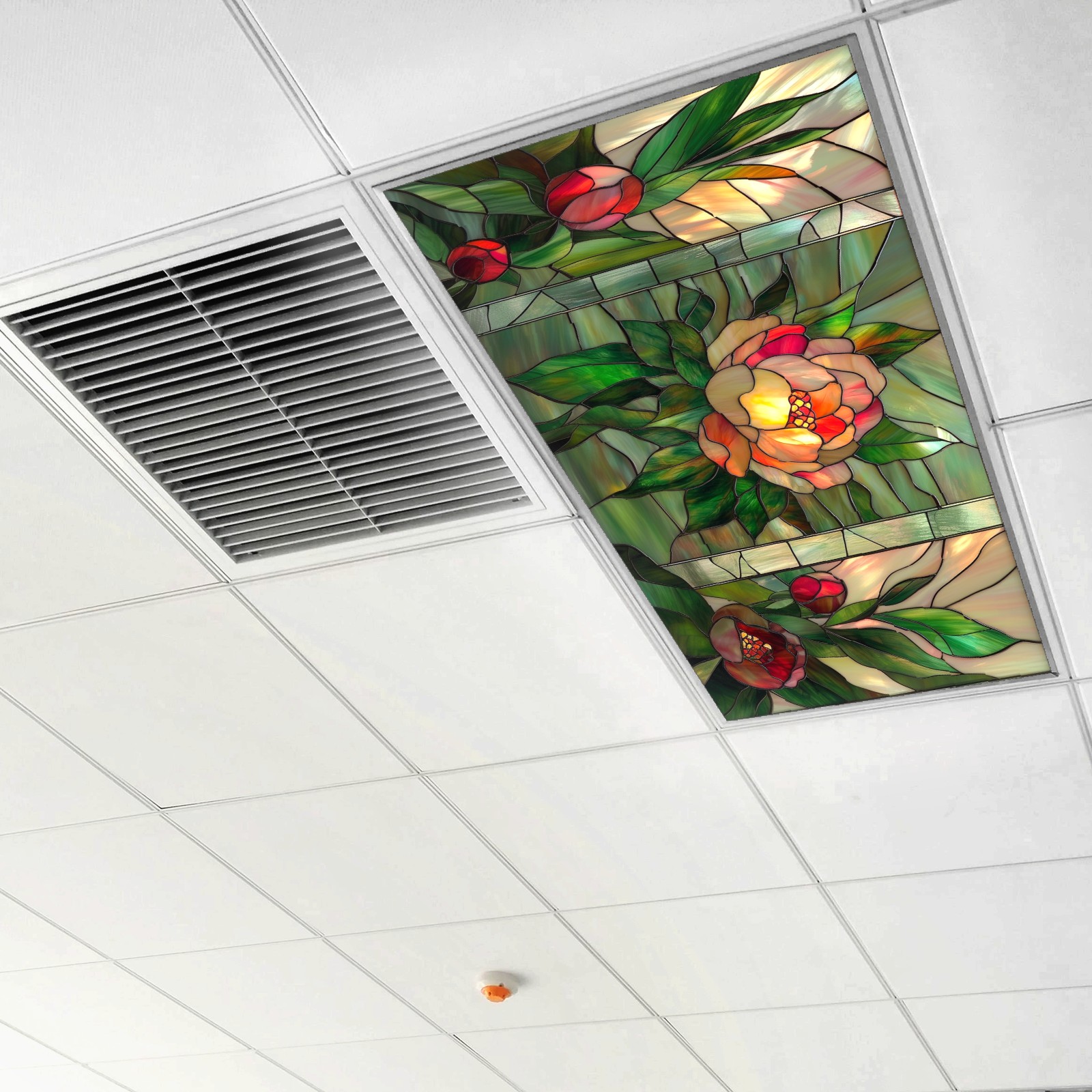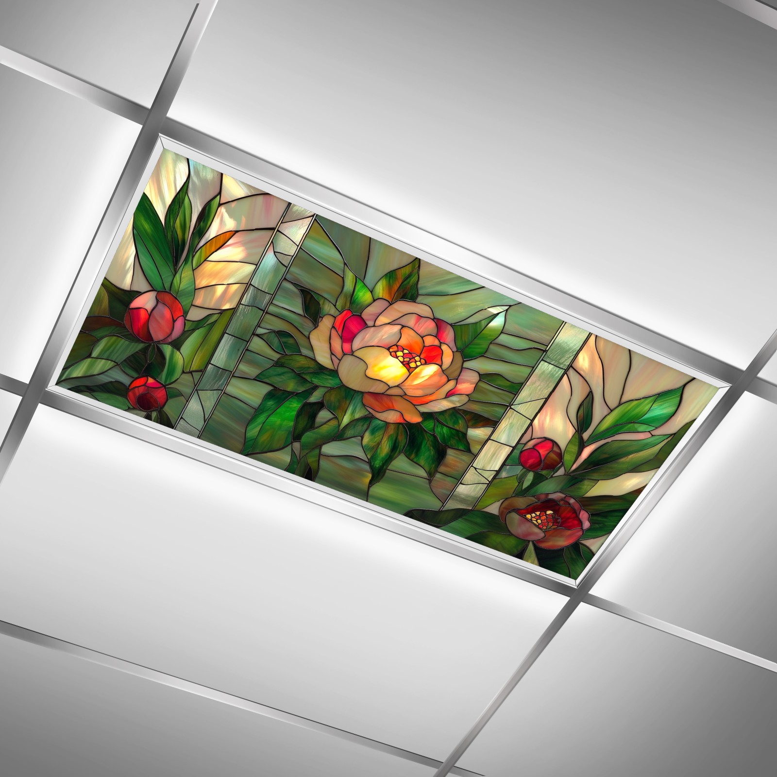 MSINMKOK Fluorescent Light Covers for Ceiling Lights Classroom Office 4x2ft Stained Glass Peony Flower Decorative Drop Ceiling Light Cover Filters Hospital Home Ceiling Decorations