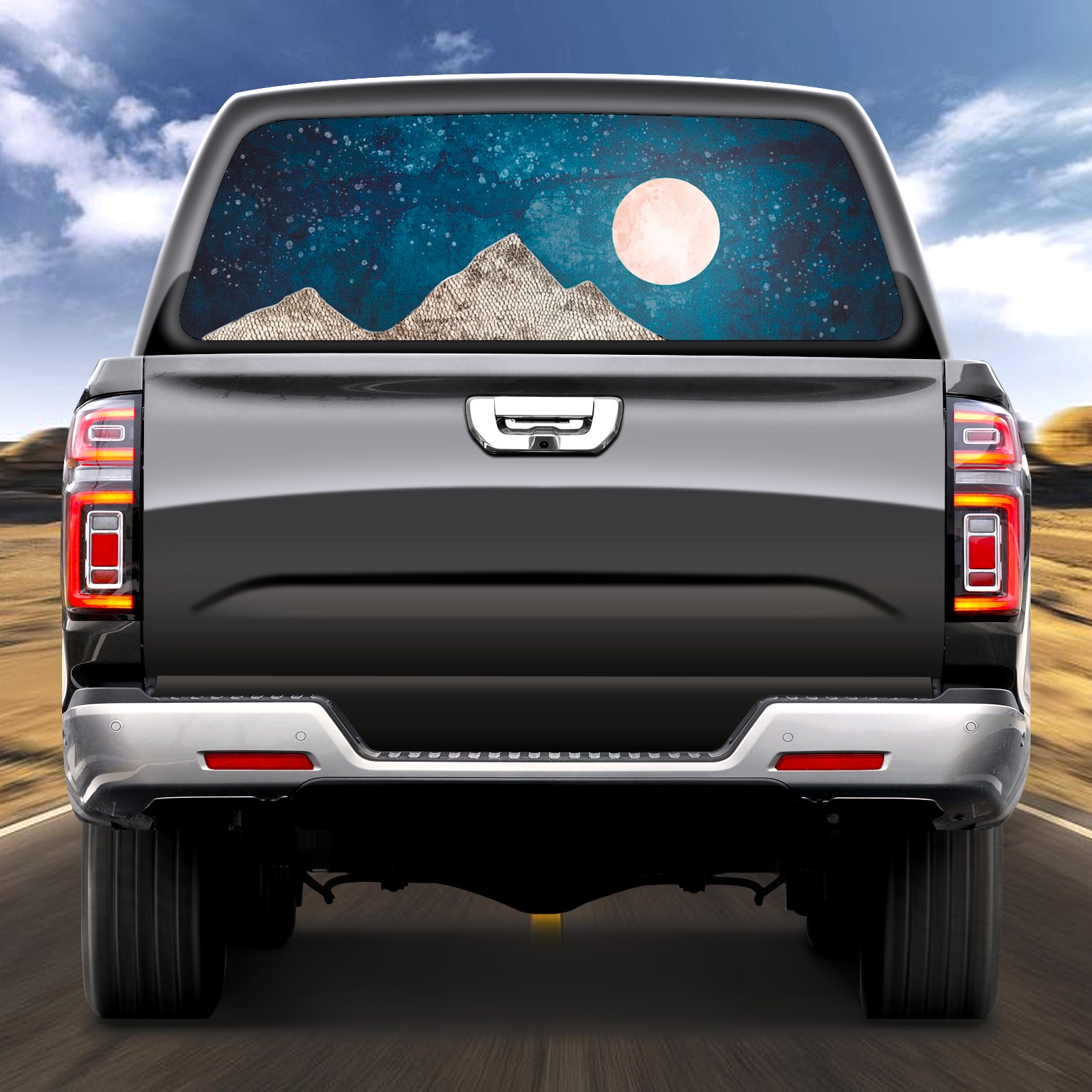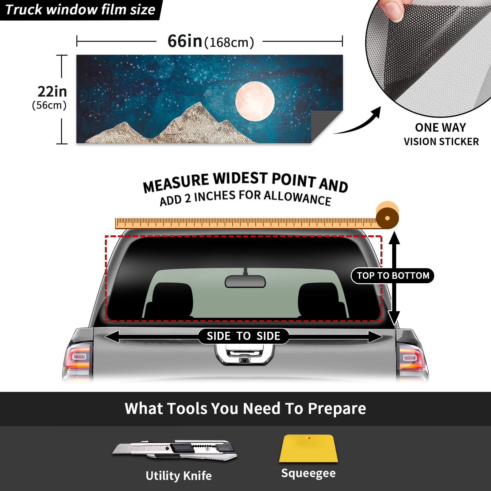●<b>Truck Rear Window Graphics Decals Pickup Trucks Back Window Film Stickers 66" x 22" Perforated Vinyl Wrap Stickers Decorations for Car Rear Window.</b><br> <br> <b>Features :</b><br> - Size of the rear window decals for trucks is 66x22 Inches (168x56cm).<br> - High quality perforated vinyl window film, one way vision sticker.<br> - Perforated is see through from the inside but not from outside.<br> - Clear printing, waterproof and continued.<br> - The car back window graphics stickers fits most truck and makes your vehicle more beautiful.<br> <br> <b>【Installation Instructions】</b><br> <b>1. CLEAN SURFACE - </b>Clean the rear window thoroughly and make sure the surface clean.<br> <b>2. STICK THE DECALS - </b>Tear off the paper on the back and stick the decal on the window.<br> <b>3. SCRAPE OFF AIR BUBBLES - </b>Use a squeegee or other card to scrape off the excess air bubbles.<br> <b>4. TRIM THE EXCESS -</b> Use a knife to cut off the excess stickers of the window, finally complete.<br> 1. Please measure the size before purchasing, back window graphics decal for truck can be cut to your desired size.<br> 2.The graphics stickers for truck back window is a great gift for yourself also can as a birthday / halloween / christmas gift for your friends and family.<br> <b>Decorate Your Pickup Truck With Rear Window Decal Today!</b>