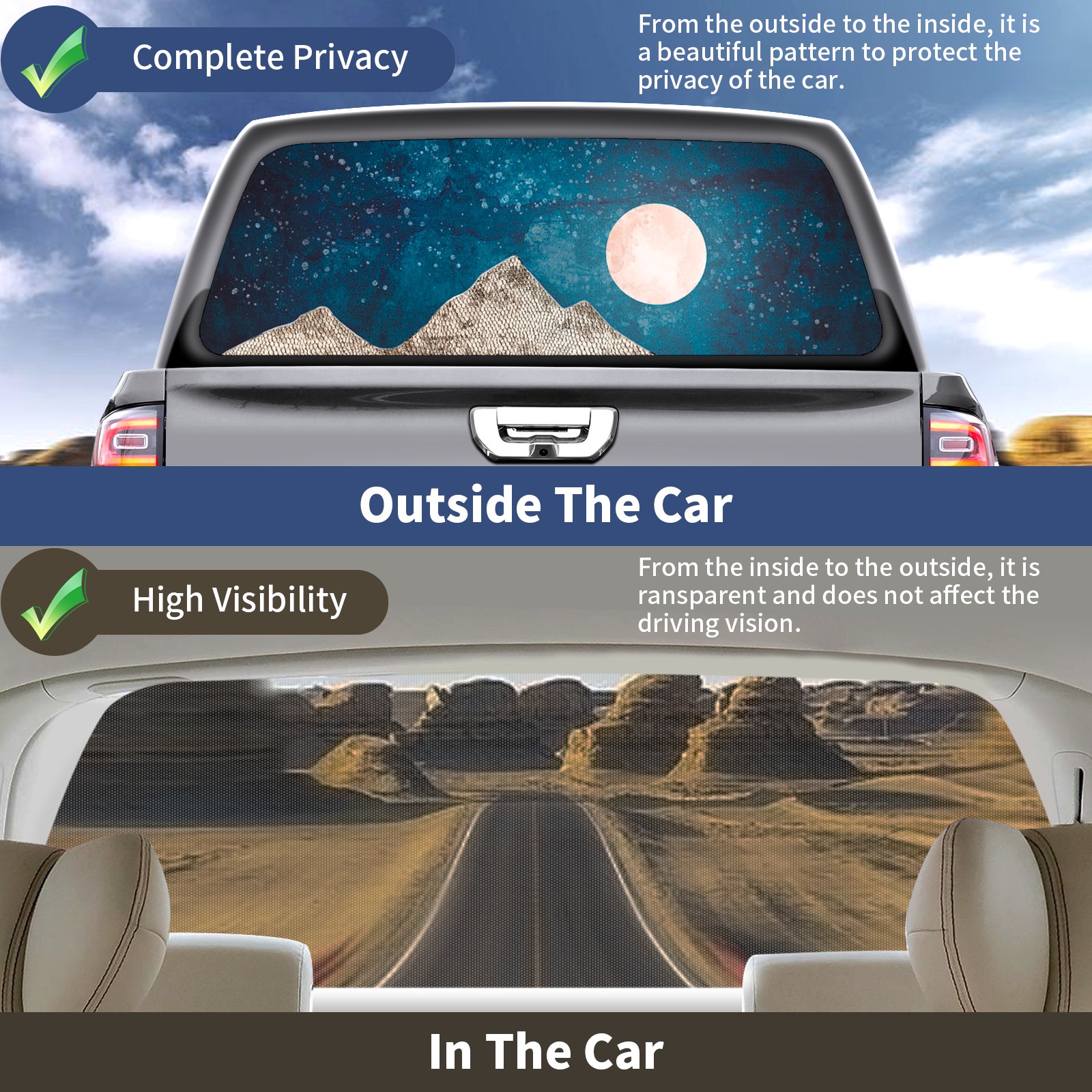 • ●<b>Truck Rear Window Graphics Decals Pickup Trucks Back Window Film Stickers 66" x 22" Perforated Vinyl Wrap Stickers Decorations for Car Rear Window.</b><br> <br> <b>Features :</b><br> - Size of the rear window decals for trucks is 66x22 Inches (168x56cm).<br> - High quality perforated vinyl window film, one way vision sticker.<br> - Perforated is see through from the inside but not from outside.<br> - Clear printing, waterproof and continued.<br> - The car back window graphics stickers fits most truck and makes your vehicle more beautiful.<br> <br> <b>【Installation Instructions】</b><br> <b>1. CLEAN SURFACE - </b>Clean the rear window thoroughly and make sure the surface clean.<br> <b>2. STICK THE DECALS - </b>Tear off the paper on the back and stick the decal on the window.<br> <b>3. SCRAPE OFF AIR BUBBLES - </b>Use a squeegee or other card to scrape off the excess air bubbles.<br> <b>4. TRIM THE EXCESS -</b> Use a knife to cut off the excess stickers of the window, finally complete.<br> 1. Please measure the size before purchasing, back window graphics decal for truck can be cut to your desired size.<br> 2.The graphics stickers for truck back window is a great gift for yourself also can as a birthday / halloween / christmas gift for your friends and family.<br> <b>Decorate Your Pickup Truck With Rear Window Decal Today!</b>