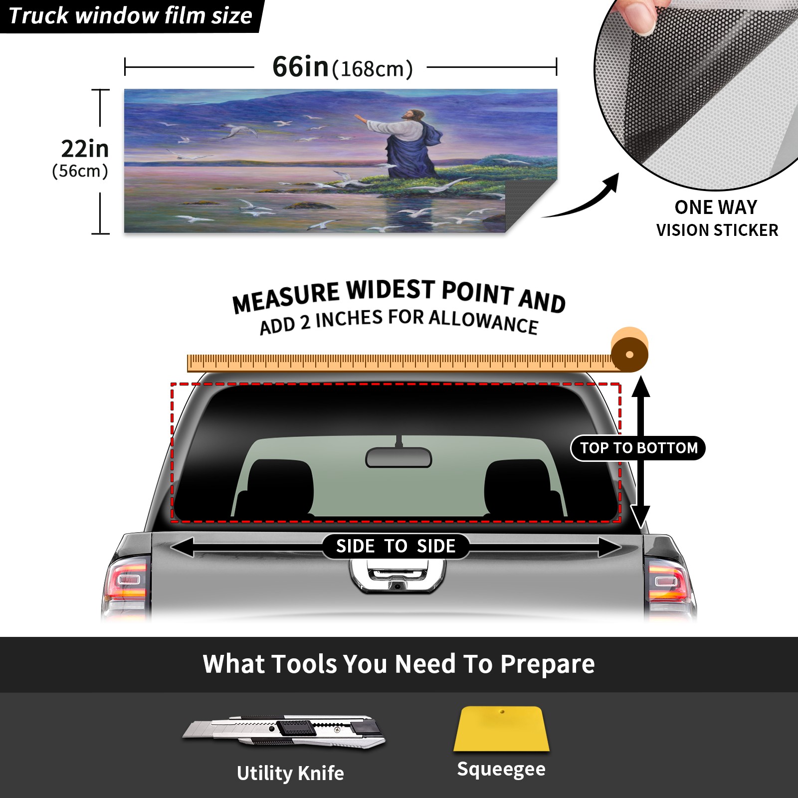 • ●<b>Truck Rear Window Graphics Decals Pickup Trucks Back Window Film Stickers 66" x 22" Perforated Vinyl Wrap Stickers Decorations for Car Rear Window.</b><br> <br> <b>Features :</b><br> - Size of the rear window decals for trucks is 66x22 Inches (168x56cm).<br> - High quality perforated vinyl window film, one way vision sticker.<br> - Perforated is see through from the inside but not from outside.<br> - Clear printing, waterproof and continued.<br> - The car back window graphics stickers fits most truck and makes your vehicle more beautiful.<br> <br> <b>【Installation Instructions】</b><br> <b>1. CLEAN SURFACE - </b>Clean the rear window thoroughly and make sure the surface clean.<br> <b>2. STICK THE DECALS - </b>Tear off the paper on the back and stick the decal on the window.<br> <b>3. SCRAPE OFF AIR BUBBLES - </b>Use a squeegee or other card to scrape off the excess air bubbles.<br> <b>4. TRIM THE EXCESS -</b> Use a knife to cut off the excess stickers of the window, finally complete.<br> 1. Please measure the size before purchasing, back window graphics decal for truck can be cut to your desired size.<br> 2.The graphics stickers for truck back window is a great gift for yourself also can as a birthday / halloween / christmas gift for your friends and family.<br> <b>Decorate Your Pickup Truck With Rear Window Decal Today!</b>