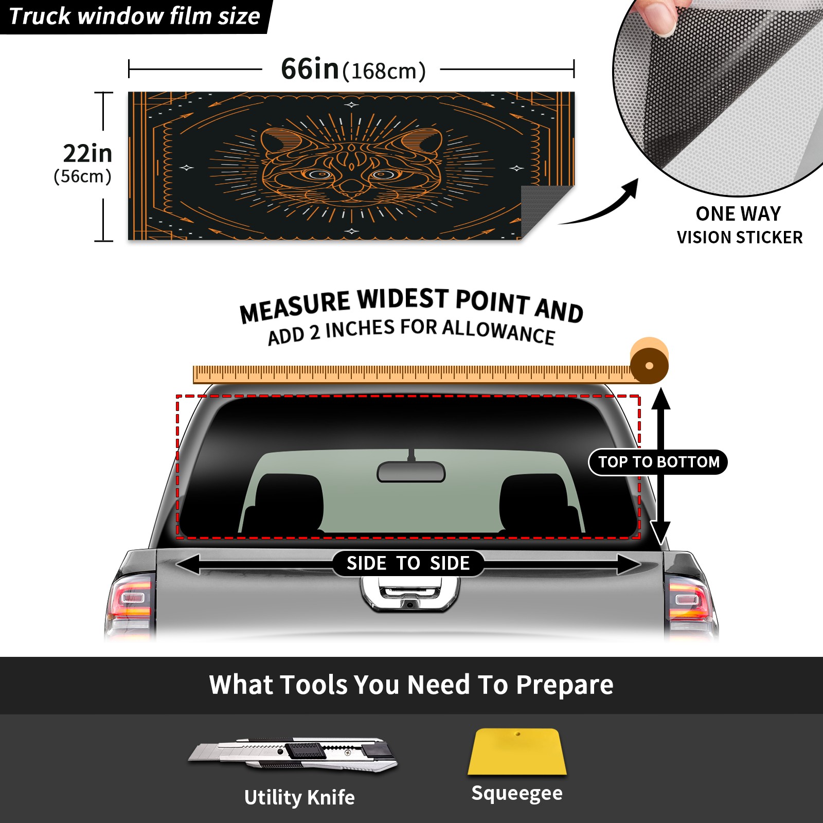 • ●<b>Truck Rear Window Graphics Decals Pickup Trucks Back Window Film Stickers 66" x 22" Perforated Vinyl Wrap Stickers Decorations for Car Rear Window.</b><br> <br> <b>Features :</b><br> - Size of the rear window decals for trucks is 66x22 Inches (168x56cm).<br> - High quality perforated vinyl window film, one way vision sticker.<br> - Perforated is see through from the inside but not from outside.<br> - Clear printing, waterproof and continued.<br> - The car back window graphics stickers fits most truck and makes your vehicle more beautiful.<br> <br> <b>【Installation Instructions】</b><br> <b>1. CLEAN SURFACE - </b>Clean the rear window thoroughly and make sure the surface clean.<br> <b>2. STICK THE DECALS - </b>Tear off the paper on the back and stick the decal on the window.<br> <b>3. SCRAPE OFF AIR BUBBLES - </b>Use a squeegee or other card to scrape off the excess air bubbles.<br> <b>4. TRIM THE EXCESS -</b> Use a knife to cut off the excess stickers of the window, finally complete.<br> 1. Please measure the size before purchasing, back window graphics decal for truck can be cut to your desired size.<br> 2.The graphics stickers for truck back window is a great gift for yourself also can as a birthday / halloween / christmas gift for your friends and family.<br> <b>Decorate Your Pickup Truck With Rear Window Decal Today!</b>