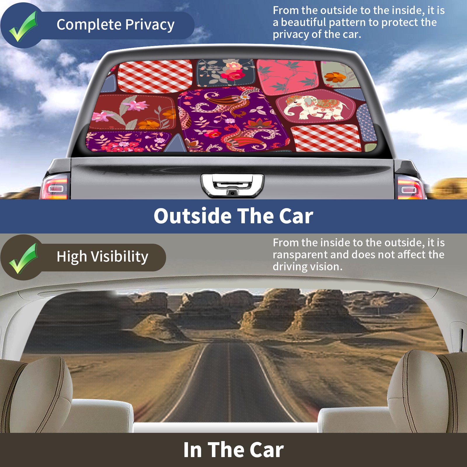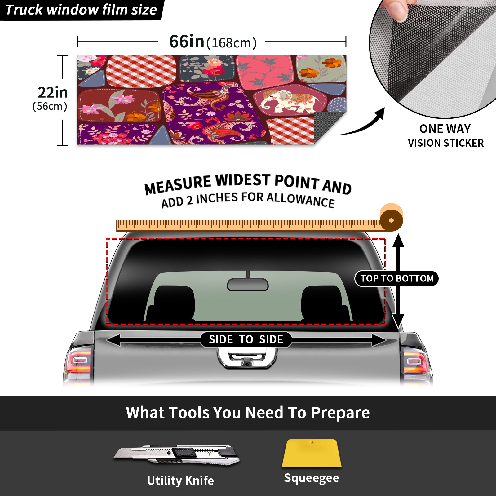• ●<b>Truck Rear Window Graphics Decals Pickup Trucks Back Window Film Stickers 66" x 22" Perforated Vinyl Wrap Stickers Decorations for Car Rear Window.</b><br> <br> <b>Features :</b><br> - Size of the rear window decals for trucks is 66x22 Inches (168x56cm).<br> - High quality perforated vinyl window film, one way vision sticker.<br> - Perforated is see through from the inside but not from outside.<br> - Clear printing, waterproof and continued.<br> - The car back window graphics stickers fits most truck and makes your vehicle more beautiful.<br> <br> <b>【Installation Instructions】</b><br> <b>1. CLEAN SURFACE - </b>Clean the rear window thoroughly and make sure the surface clean.<br> <b>2. STICK THE DECALS - </b>Tear off the paper on the back and stick the decal on the window.<br> <b>3. SCRAPE OFF AIR BUBBLES - </b>Use a squeegee or other card to scrape off the excess air bubbles.<br> <b>4. TRIM THE EXCESS -</b> Use a knife to cut off the excess stickers of the window, finally complete.<br> 1. Please measure the size before purchasing, back window graphics decal for truck can be cut to your desired size.<br> 2.The graphics stickers for truck back window is a great gift for yourself also can as a birthday / halloween / christmas gift for your friends and family.<br> <b>Decorate Your Pickup Truck With Rear Window Decal Today!</b>