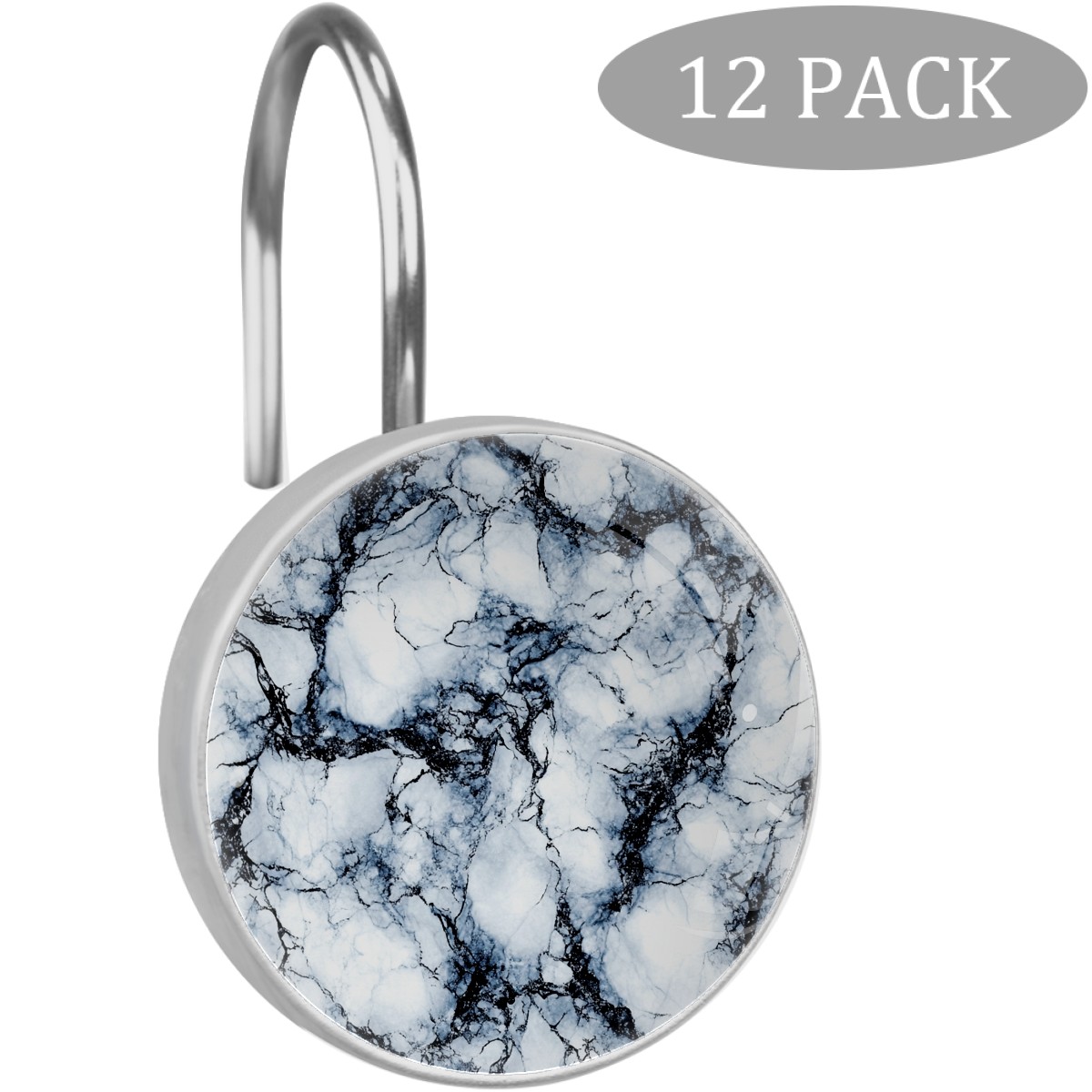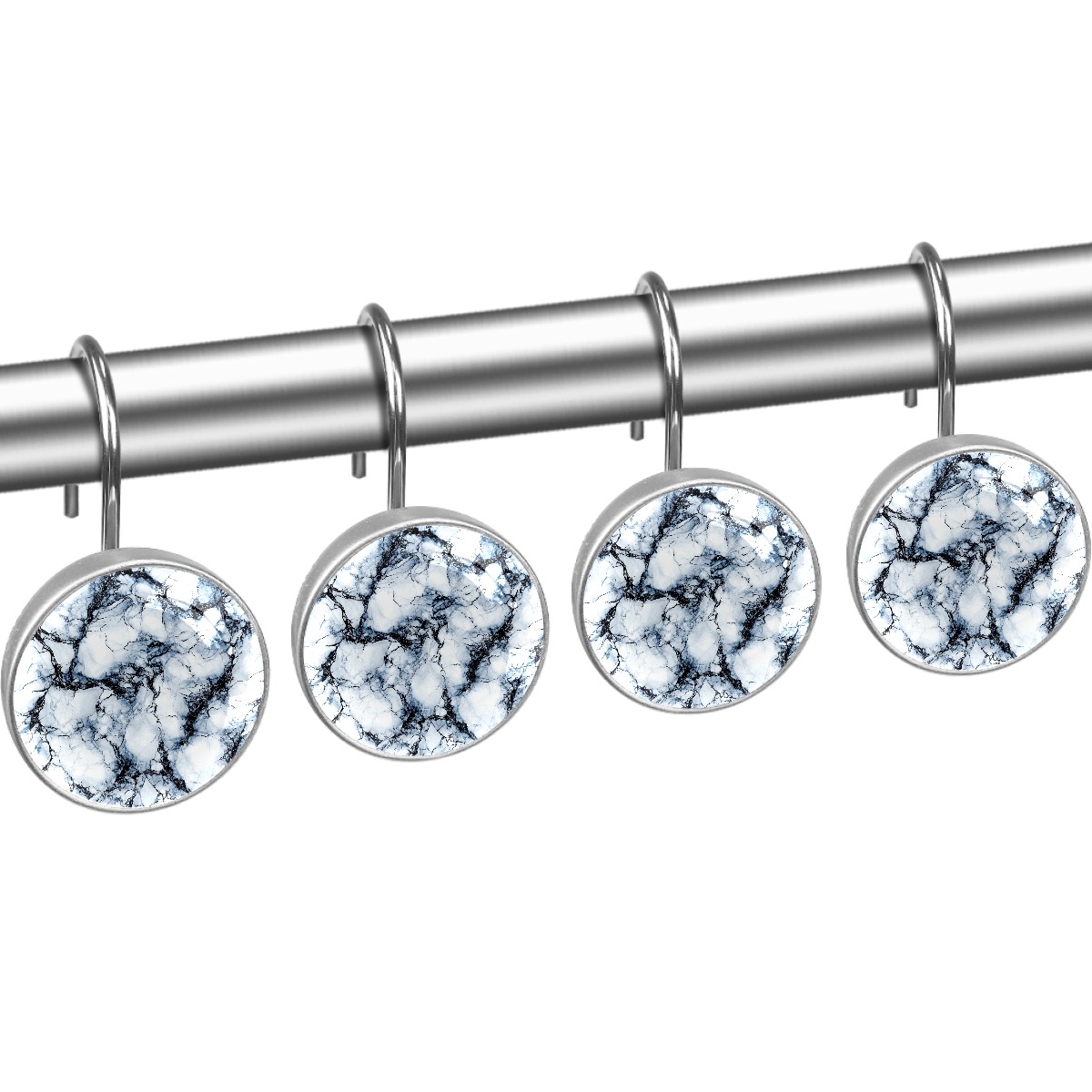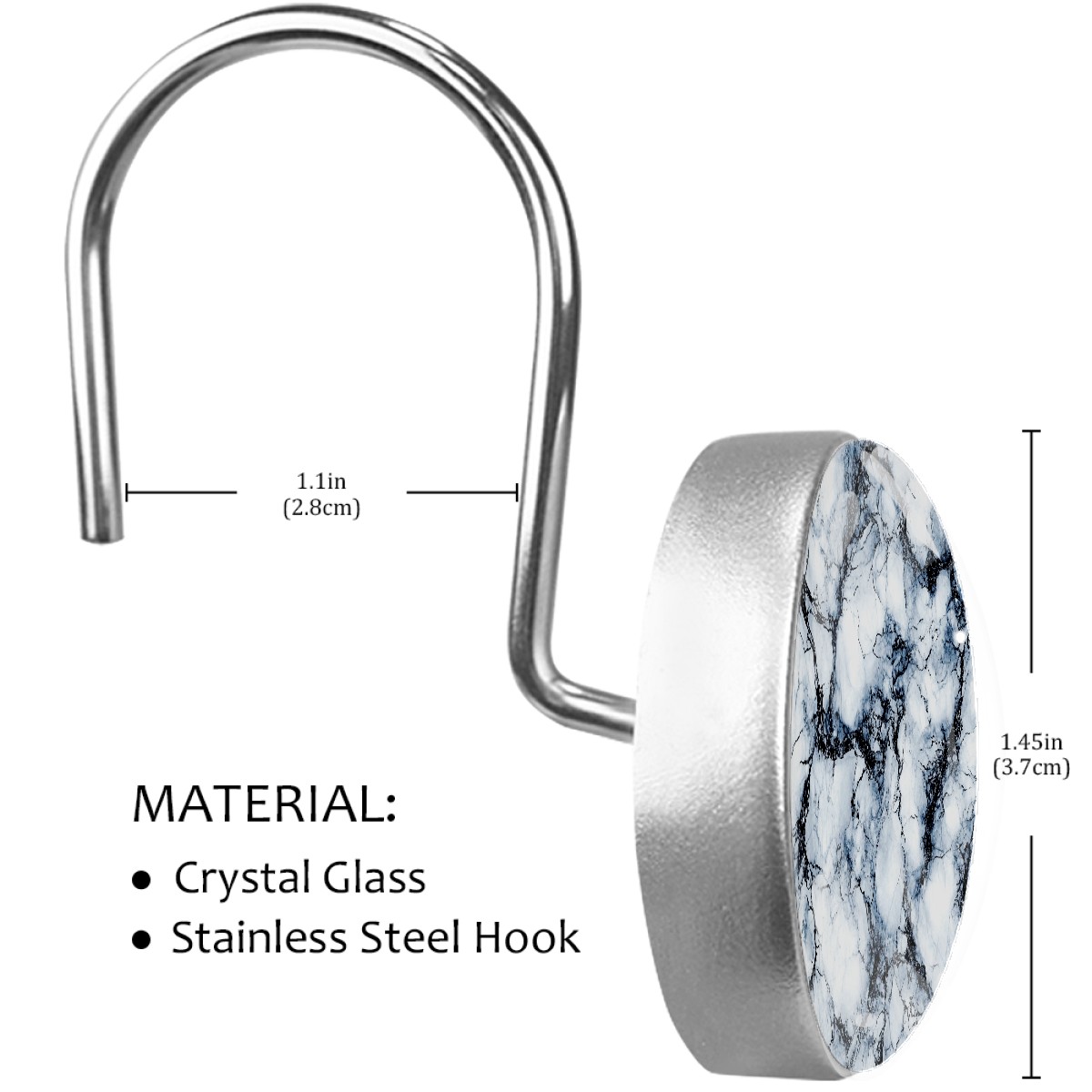 Decorative Black And White Marble Shower Curtain Hooks 12pcs Crystal Glass Rustproof Shower Hooks for Bathroom Home Decor Stainless Steel Resin Shower Curtain Rings