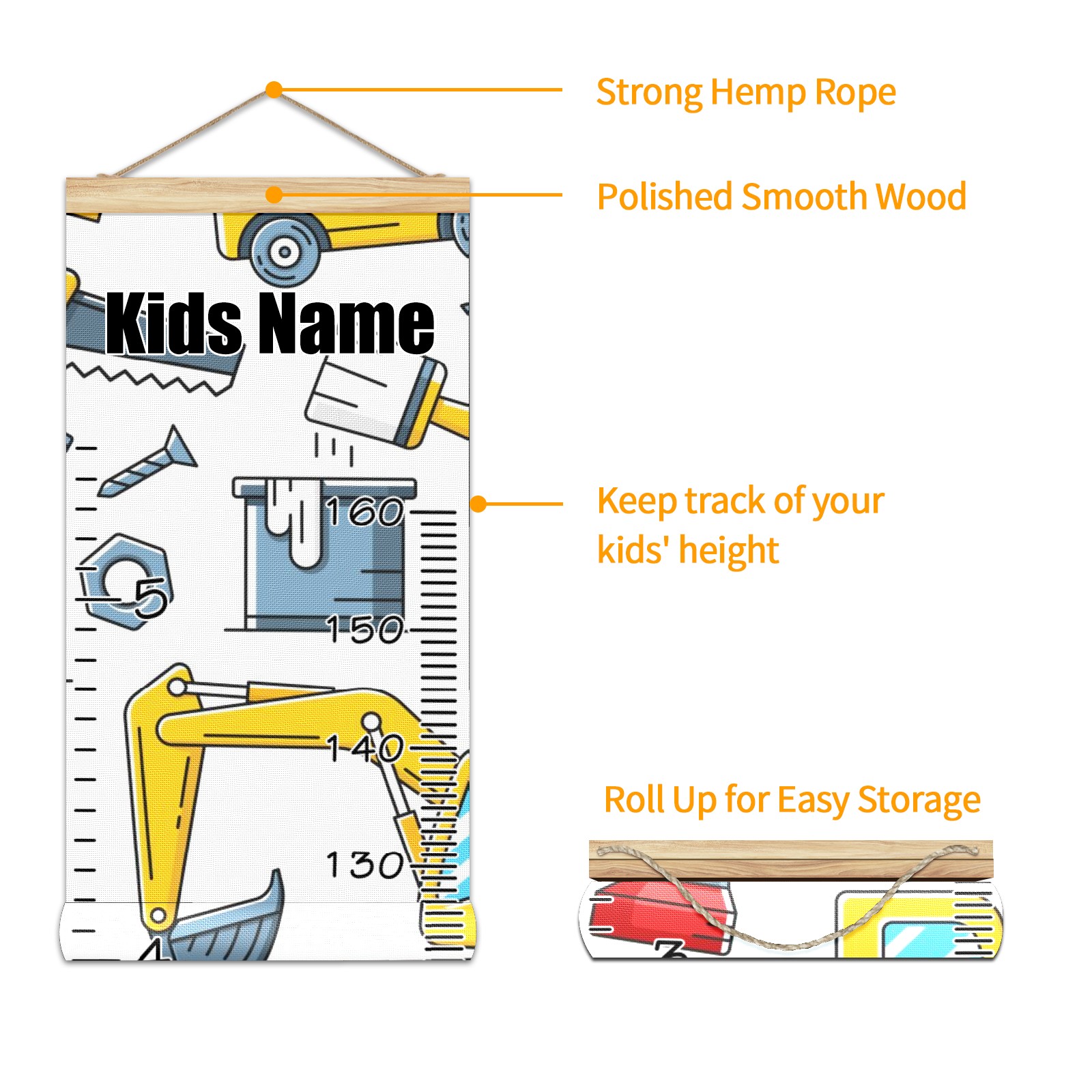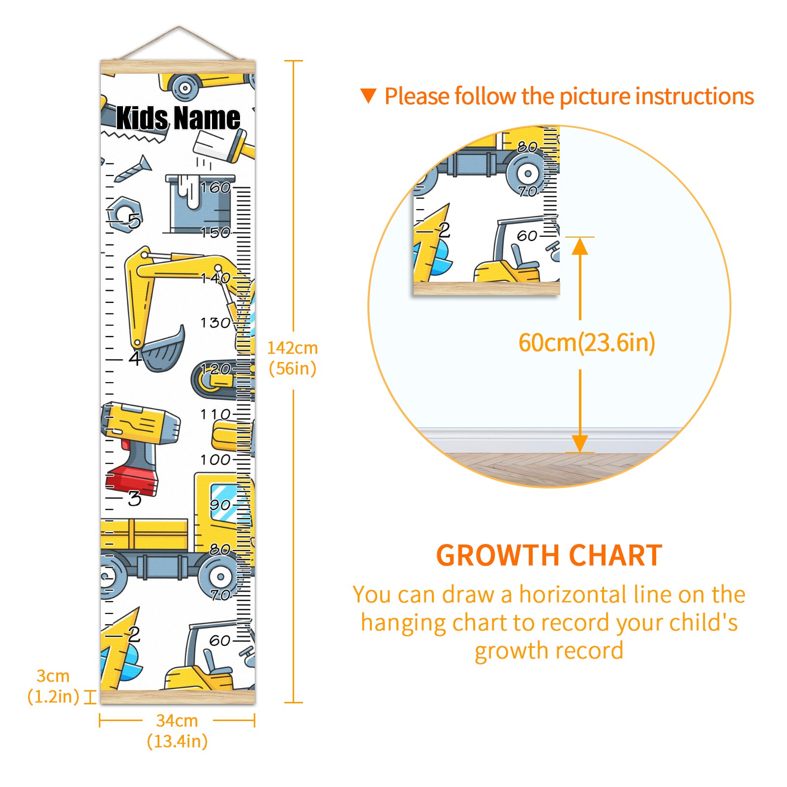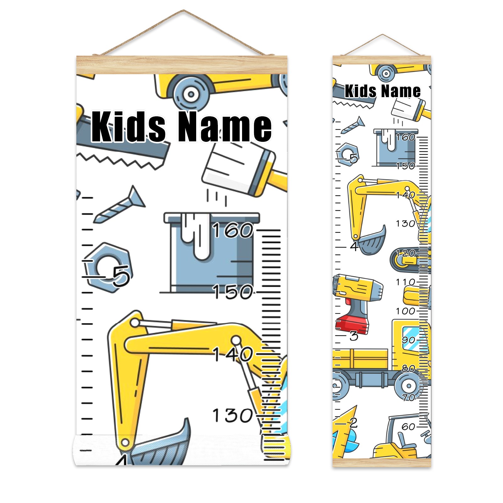 Personalized Growth Chart for Kids Boys Girls Custom Baby Name Canvas Height Chart for Wall Hanging Tractor Truck Construction Tools Measuring Chart Ruler 13.4'' x 56''
