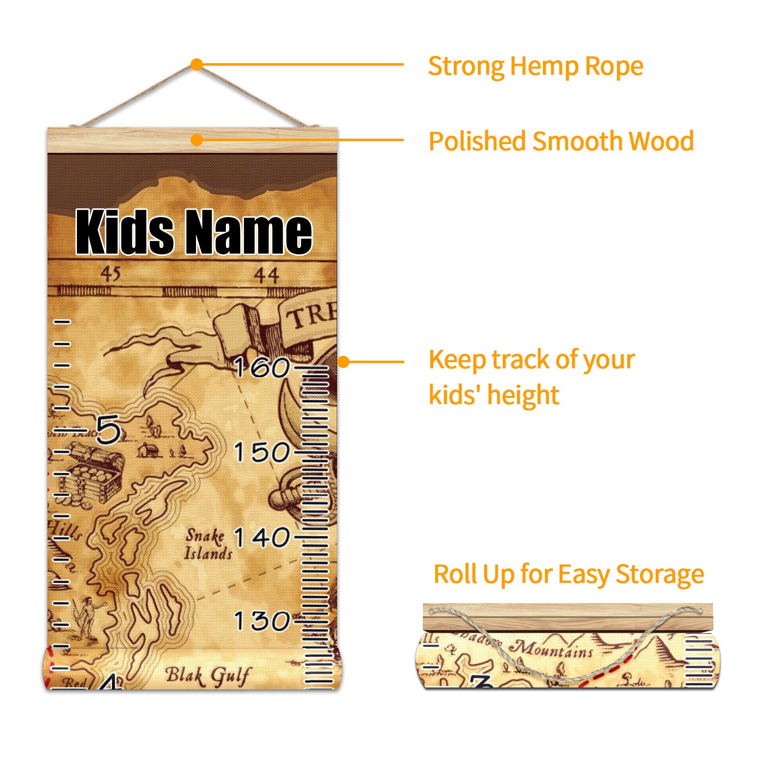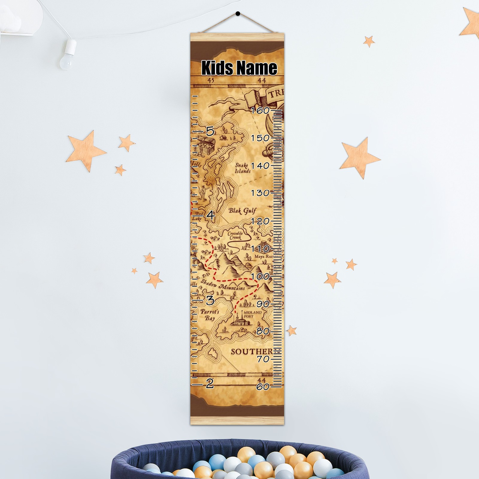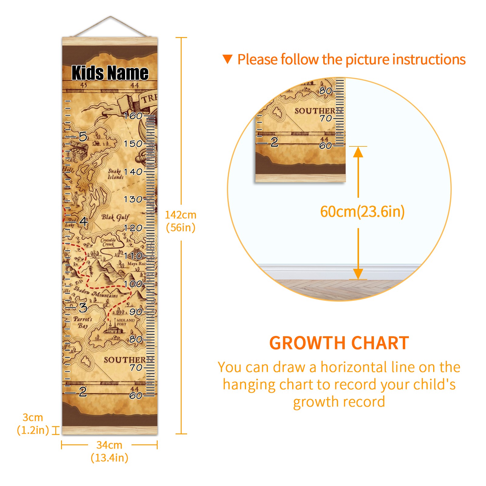 Personalized Growth Chart for Kids Boys Girls Custom Baby Name Canvas Height Chart for Wall Hanging Vintage Nautical World Map Pirate Compass Measuring Chart Ruler 13.4'' x 56''