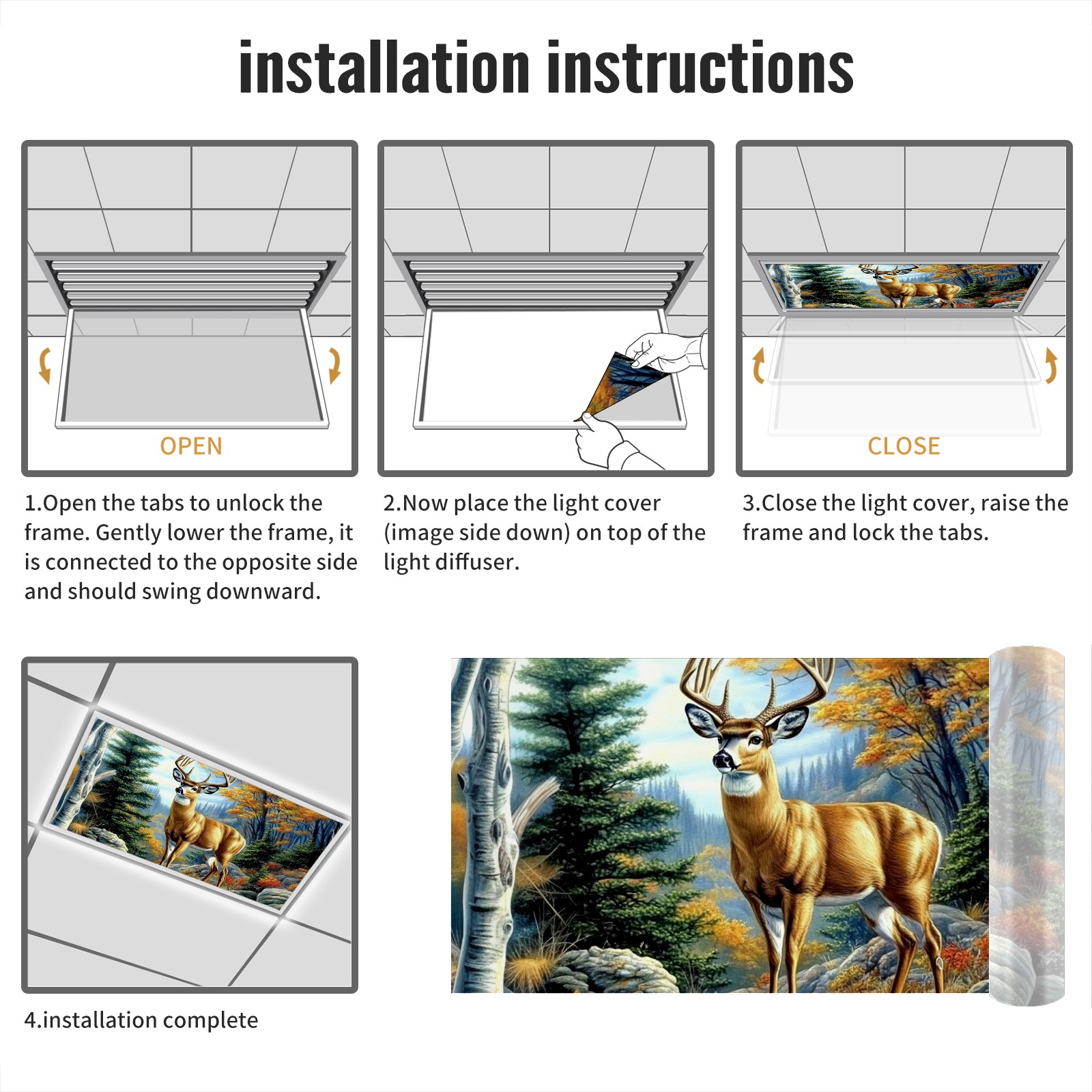 <p>Lights Fluorescent Light Covers for Classroom Office Ceiling Lights</p> <p>Size: 47.2'' x 23.6''. Standard 2x4 ft size can fit the Drop Ceiling Fluorescent Light.</p> <p>Material: Flexible PET Material (Not Fabric).&nbsp;</p> <p>Fluorescent Light Covers Features:</p> <p>1.Reducing Glare: The ceiling light cover effectively softens the harsh fluorescent light, reducing eye strain.</p> <p>2.Aesthetics: Decorative fluorescent light covers can be designed with a variety of patterns, enhancing the aesthetic appeal of the environment.</p> <p>3.Size adaptability: The light covers for ceiling can be slightly trimmed to fit ighting fixtures.</p> <p>4.Non-magnetic Design: The fluorescent light cover is non-magnetic and can be installed by inserting it into the panel. Alternatively, additional securing methods (such as double-sided tape) can be used to ensure a stable installation outside the panel.</p> <p>5.Suitable for most room,such as office, classroom, hostpital, library, clinics, playroom, nursery, kindergarten, school, hotel, bar, night club and so on.</p>