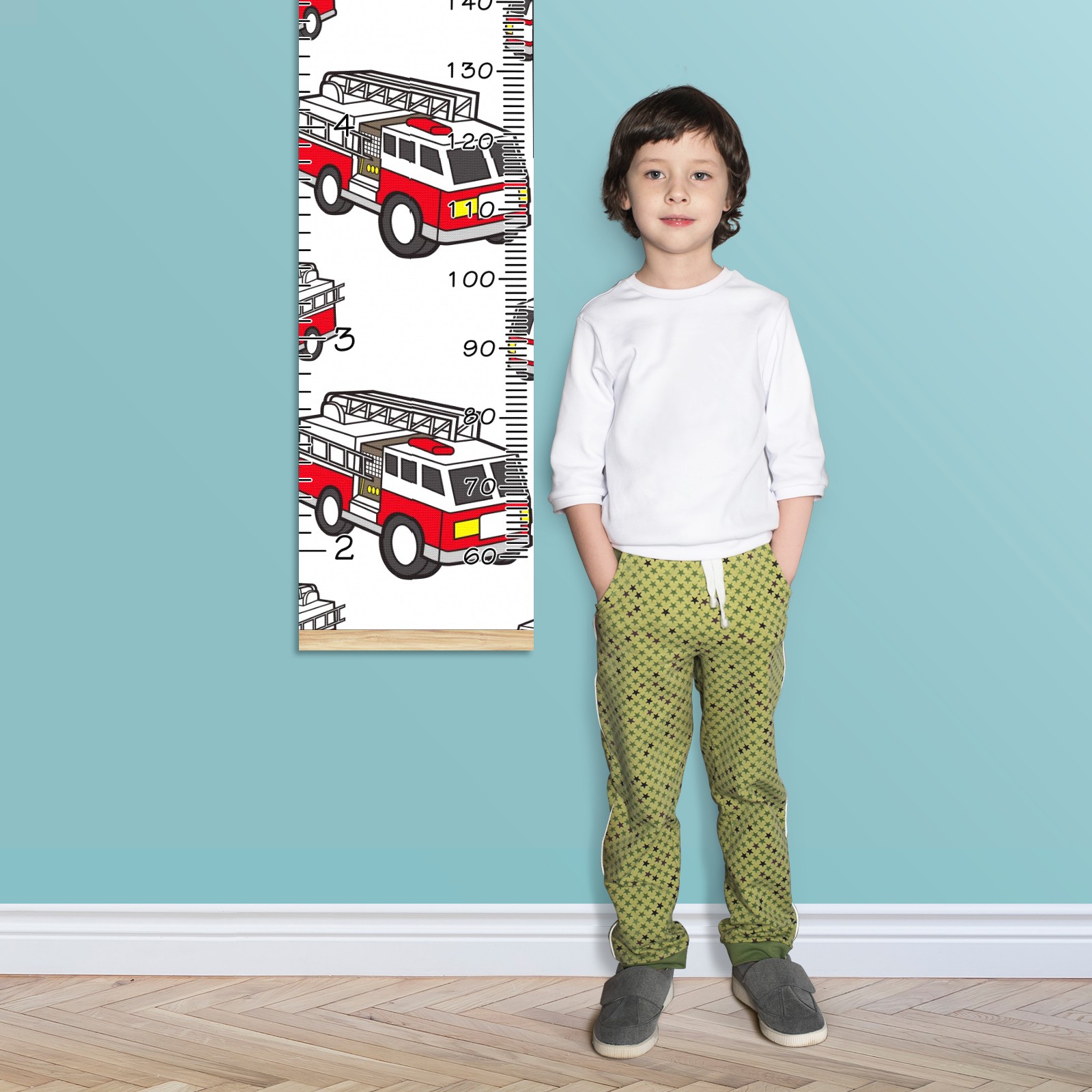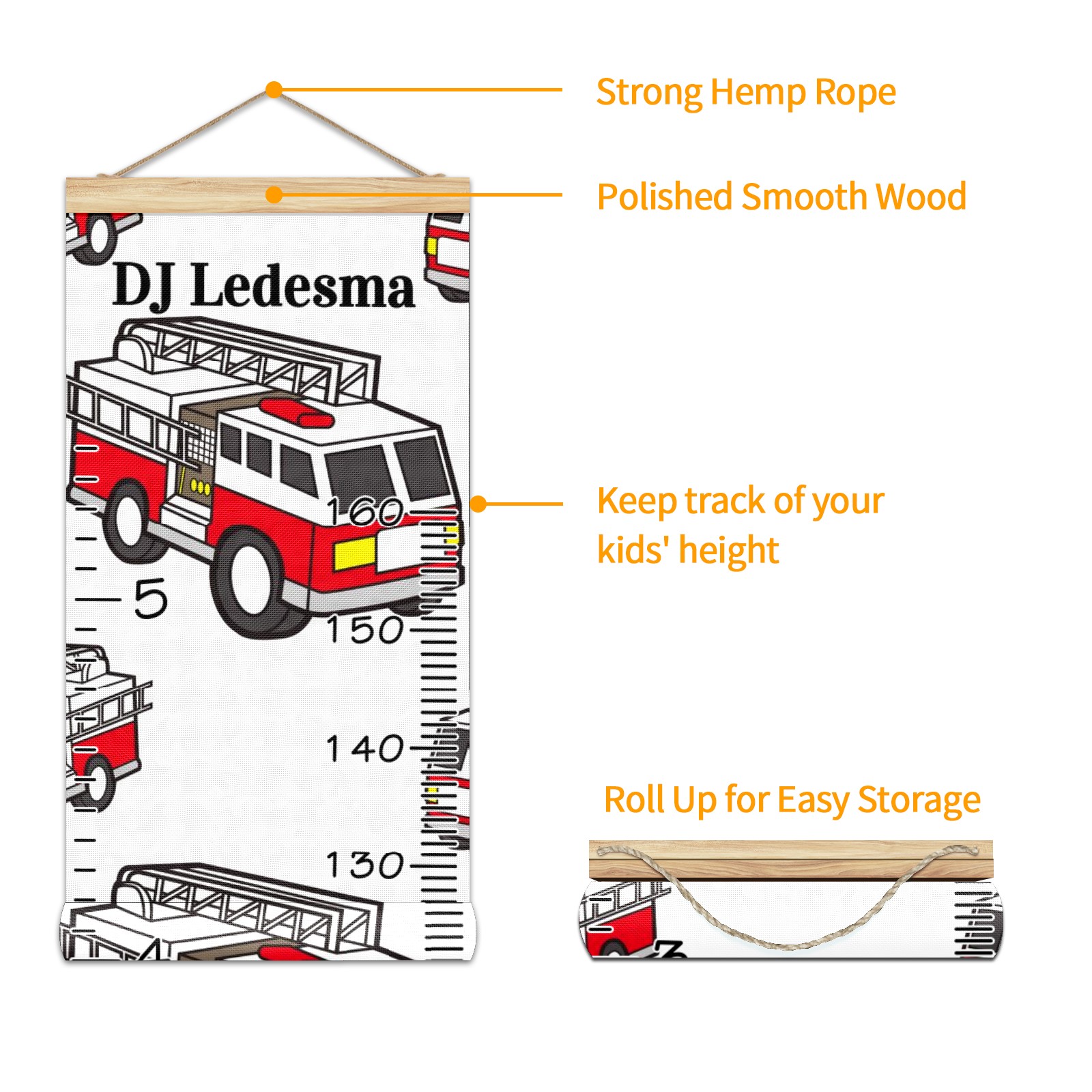 Personalized Kids Name Growth Chart Ruler for Wall Wood Frame Canvas Height Measure Chart 13.4x56 in Hanging Growth Chart Fire Truck2.22 Boys Girls Room Decor