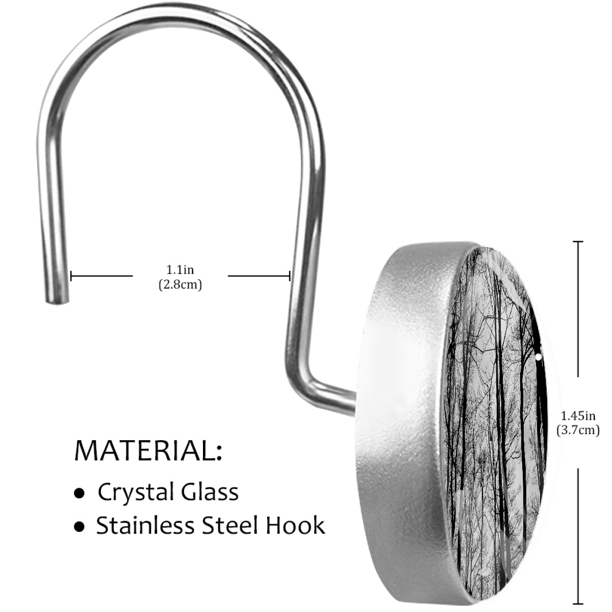• <p>Bathroom Shower Curtain Hooks Rings for Home Decoration</p> <p>Size:&nbsp;</p> <p>- Crystal glass diameter-1.45x1.45 inches</p> <p>- Hook diameter : 1.1 inches</p> <p>Material:&nbsp;Stainless steel + Crystal Glass + Resin</p> <p>Weight:&nbsp;about 430 g</p> <p>Package included:&nbsp;12 pcs shower curtain hooks</p> <p><b></b></p> <p><b></b></p>
