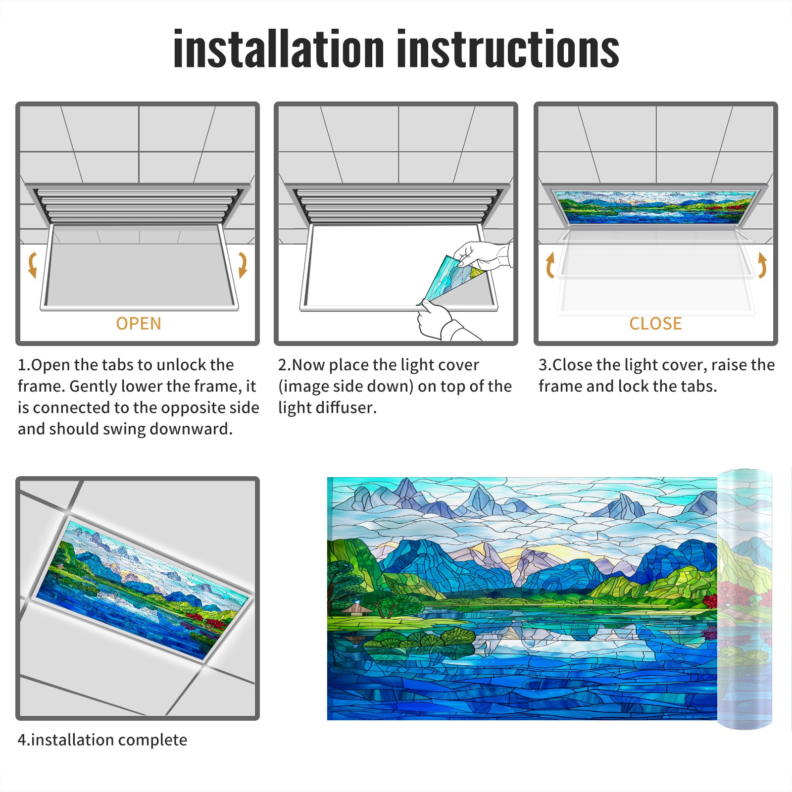 <p>Lights Fluorescent Light Covers for Classroom Office Ceiling Lights</p> <p>Size: 47.2'' x 23.6''. Standard 2x4 ft size can fit the Drop Ceiling Fluorescent Light.</p> <p>Material: Flexible PET Material (Not Fabric).&nbsp;</p> <p>Fluorescent Light Covers Features:</p> <p>1.Reducing Glare: The ceiling light cover effectively softens the harsh fluorescent light, reducing eye strain.</p> <p>2.Aesthetics: Decorative fluorescent light covers can be designed with a variety of patterns, enhancing the aesthetic appeal of the environment.</p> <p>3.Size adaptability: The light covers for ceiling can be slightly trimmed to fit ighting fixtures.</p> <p>4.Non-magnetic Design: The fluorescent light cover is non-magnetic and can be installed by inserting it into the panel. Alternatively, additional securing methods (such as double-sided tape) can be used to ensure a stable installation outside the panel.</p> <p>5.Suitable for most room,such as office, classroom, hostpital, library, clinics, playroom, nursery, kindergarten, school, hotel, bar, night club and so on.</p>