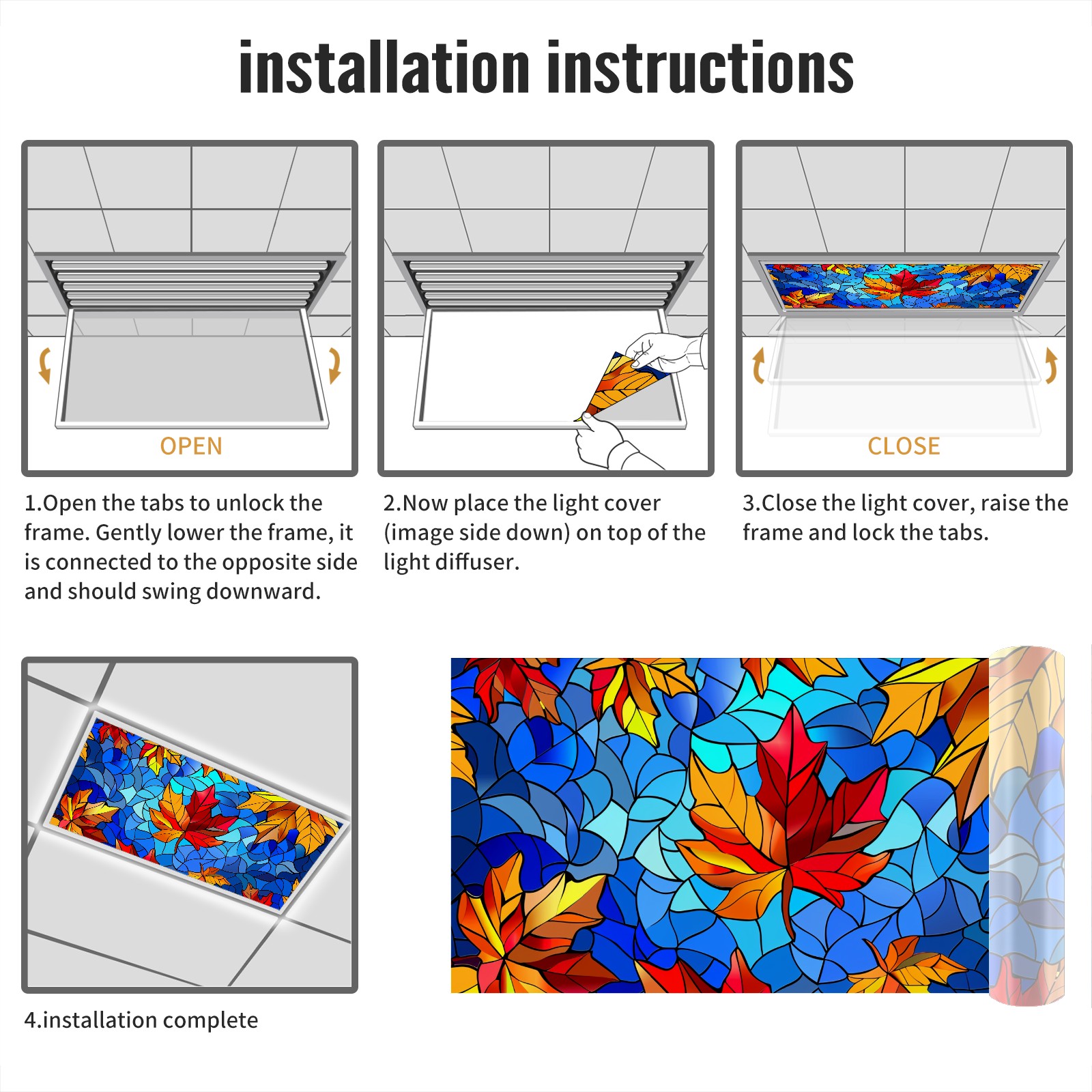 <p>Lights Fluorescent Light Covers for Classroom Office Ceiling Lights</p> <p>Size: 47.2'' x 23.6''. Standard 2x4 ft size can fit the Drop Ceiling Fluorescent Light.</p> <p>Material: Flexible PET Material (Not Fabric).&nbsp;</p> <p>Fluorescent Light Covers Features:</p> <p>1.Reducing Glare: The ceiling light cover effectively softens the harsh fluorescent light, reducing eye strain.</p> <p>2.Aesthetics: Decorative fluorescent light covers can be designed with a variety of patterns, enhancing the aesthetic appeal of the environment.</p> <p>3.Size adaptability: The light covers for ceiling can be slightly trimmed to fit ighting fixtures.</p> <p>4.Non-magnetic Design: The fluorescent light cover is non-magnetic and can be installed by inserting it into the panel. Alternatively, additional securing methods (such as double-sided tape) can be used to ensure a stable installation outside the panel.</p> <p>5.Suitable for most room,such as office, classroom, hostpital, library, clinics, playroom, nursery, kindergarten, school, hotel, bar, night club and so on.</p>