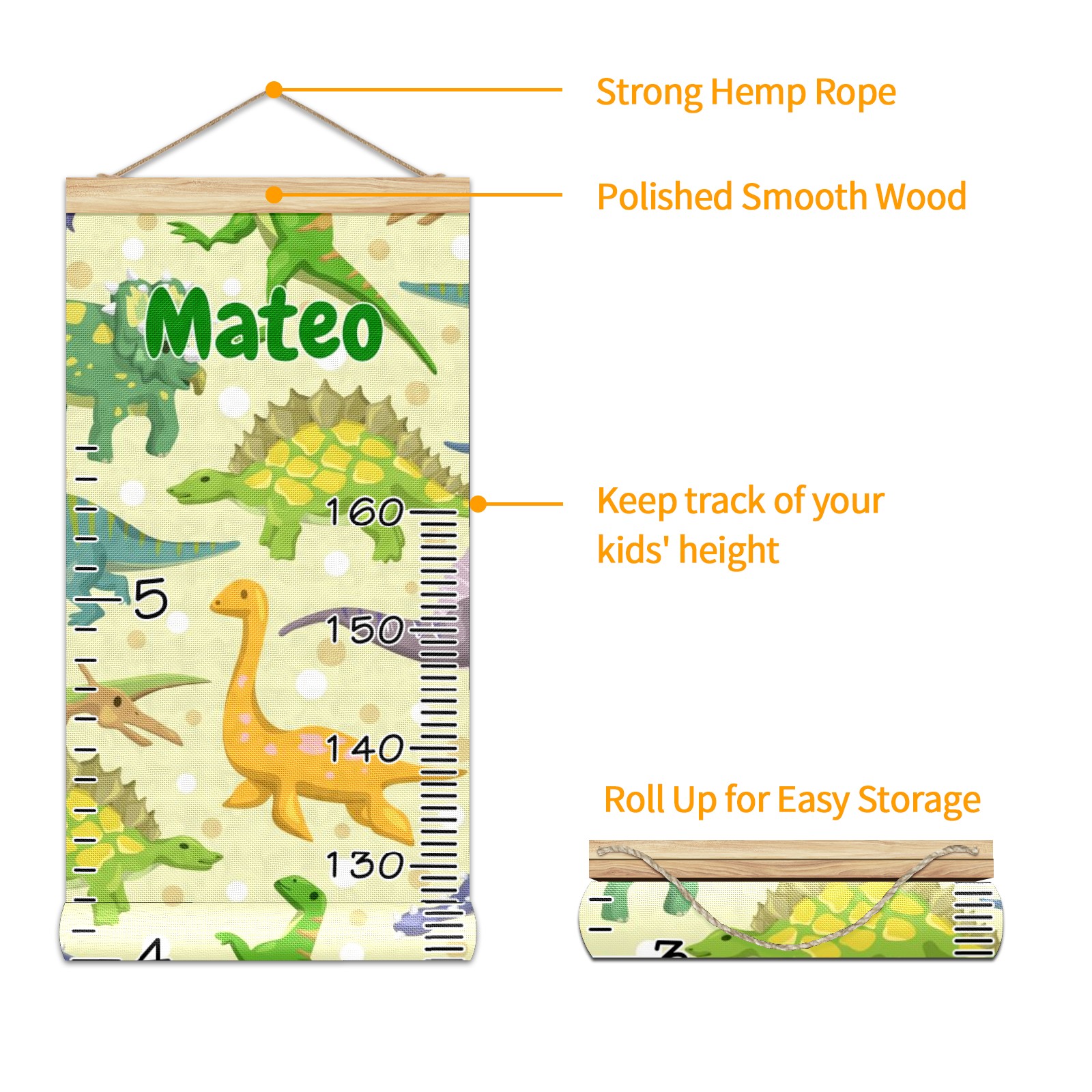 Personalized Kids Name Growth Chart Ruler for Wall Wood Frame Canvas Height Measure Chart 13.4x56 in Hanging Growth Chart Cartoon Dinosaur Animal3.3-1 Boys Girls Room Decor