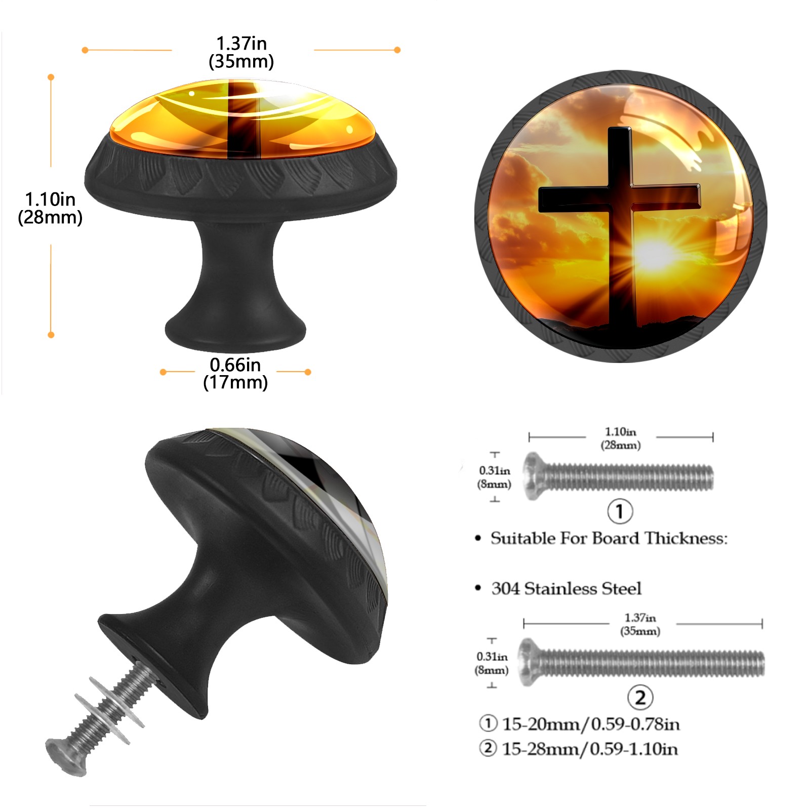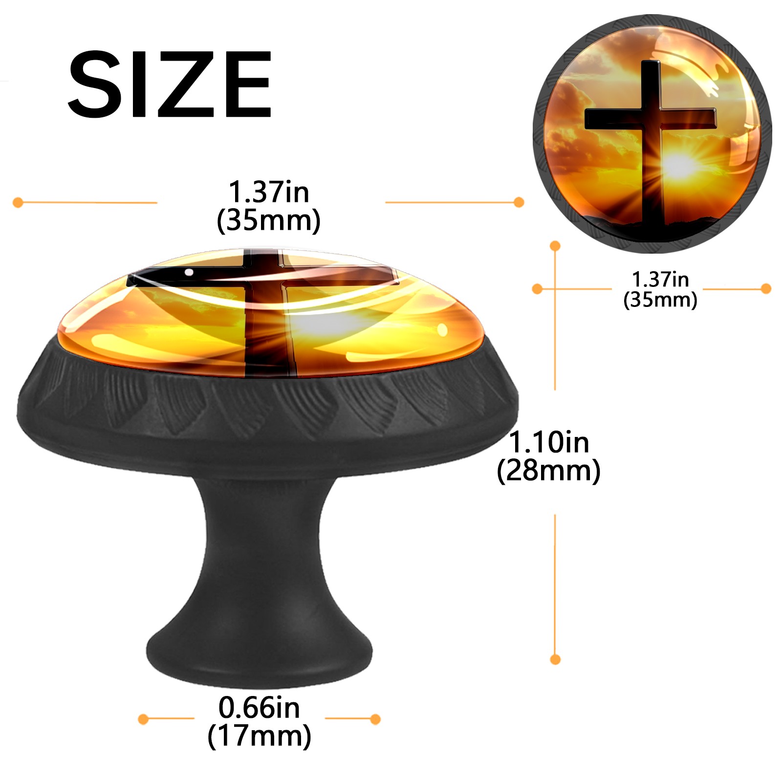 <p><b>Package Includes:</b></p> <p>Drawer Knobs x 4</p> <p>1.10 Inches Mounting Screws x 4</p> <p>1.37 Inches Mounting Screws x 4</p> <p><br></p> <p>Crystal Glass Diameter: 1.37 inches (35mm)</p> <p>Knob Height: 1.10 inches (28mm)</p> <p>Base Diameter: 0.66 inches (17mm)</p> <p><br></p> <p><b>Practical and Aesthetic:</b></p> <p>The cute drawer pulls combine the durability of an ABS base with the high transparency of glass, enhanced by unique patterns that add decoration and cuteness. It’s both practical and visually appealing.</p> <p><b>Pattern Design:</b></p> <p>Clear patterns add decoration and personalization. They enhance visual appeal and can match different home styles, meeting diverse design needs.</p> <p><b>Easy Installation:</b></p> <p>Equipped with mounting screws, the ABS base can be securely attached to the drawer with ease.</p> <p><b>Easy Cleaning:</b></p> <p>The smooth surface of the round glass pull resists dust and stains, making it easy to clean with just a damp cloth.</p> <p><b>Wear-Resistant:</b></p> <p>The cabinet knobs are designed to resist scratches and fading, maintaining their good appearance over long-term use.</p>