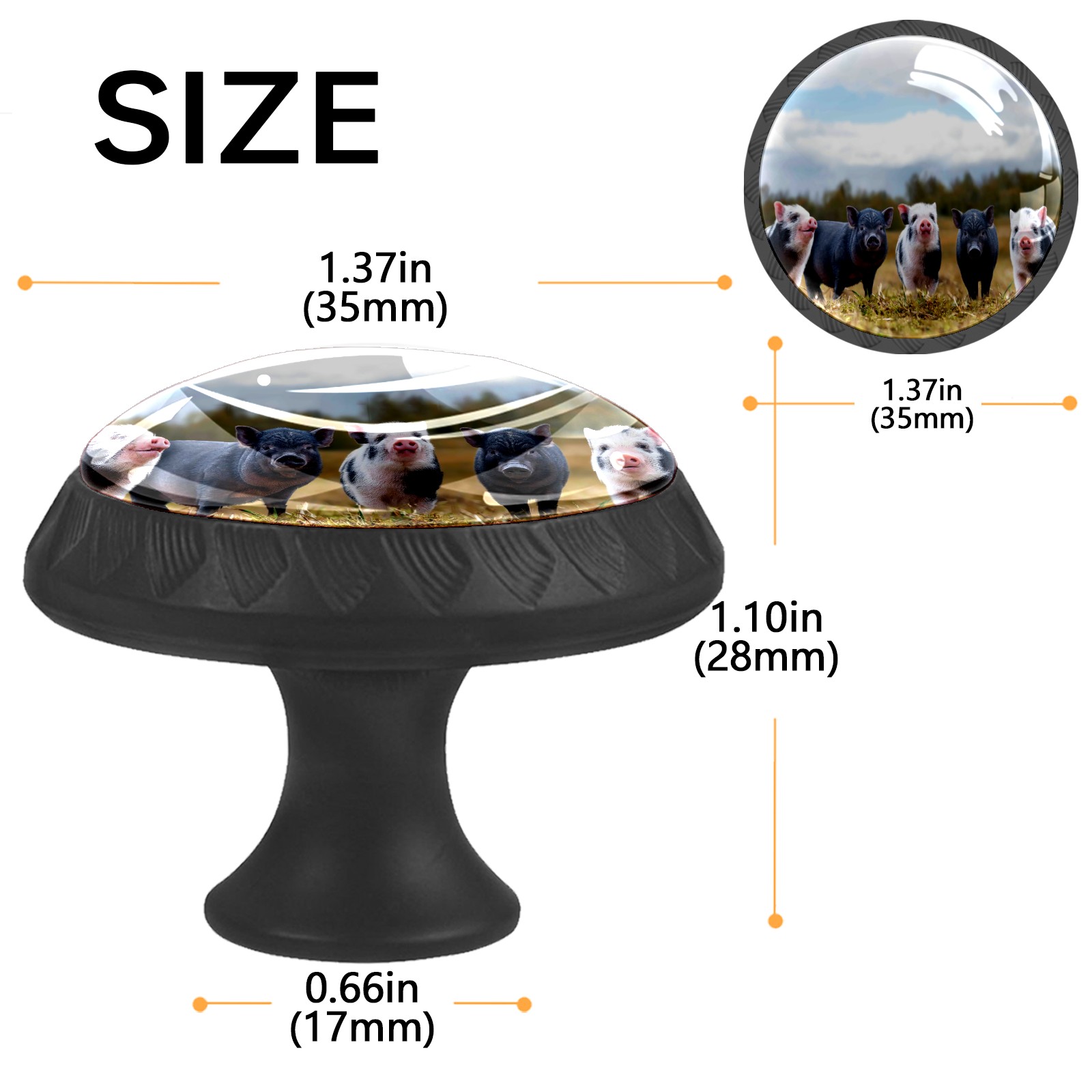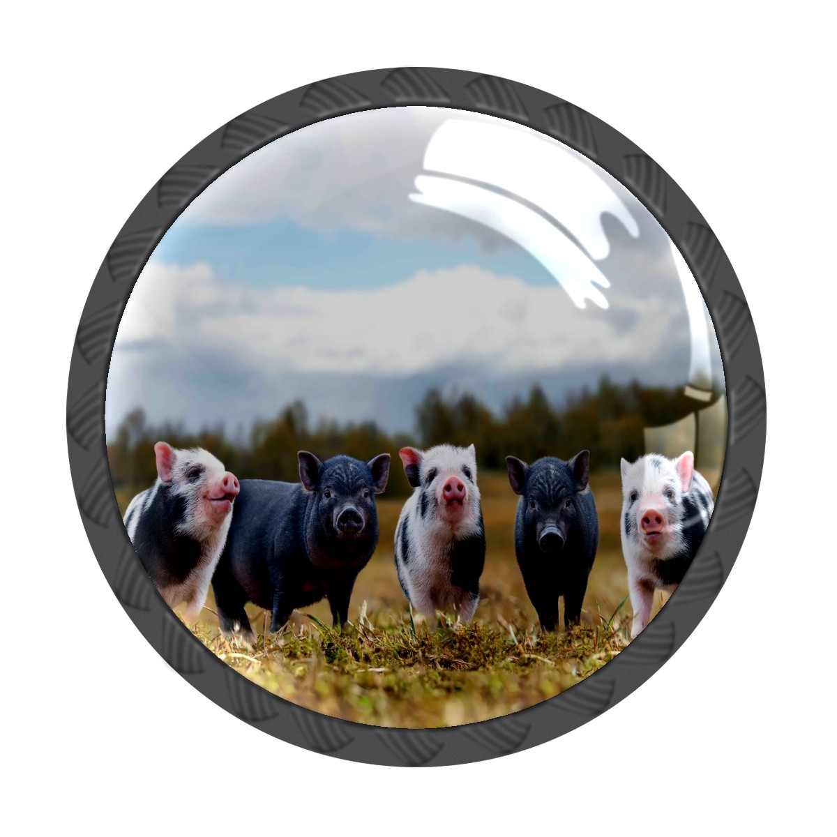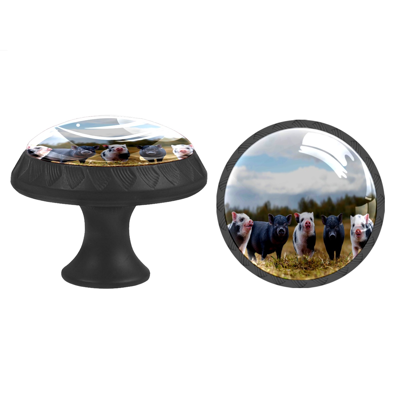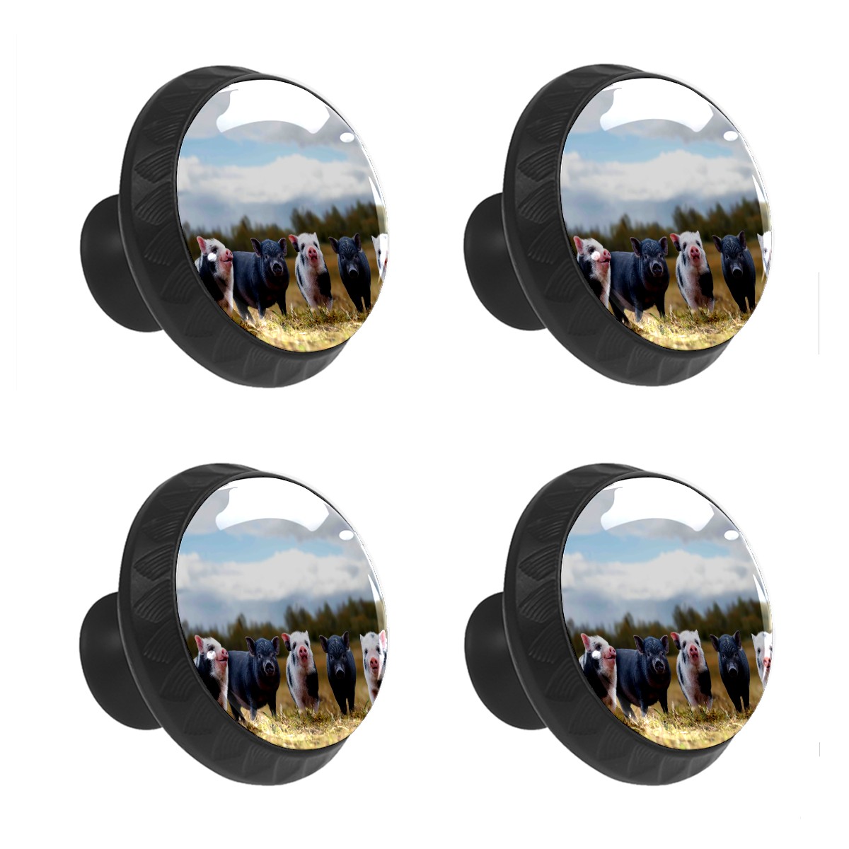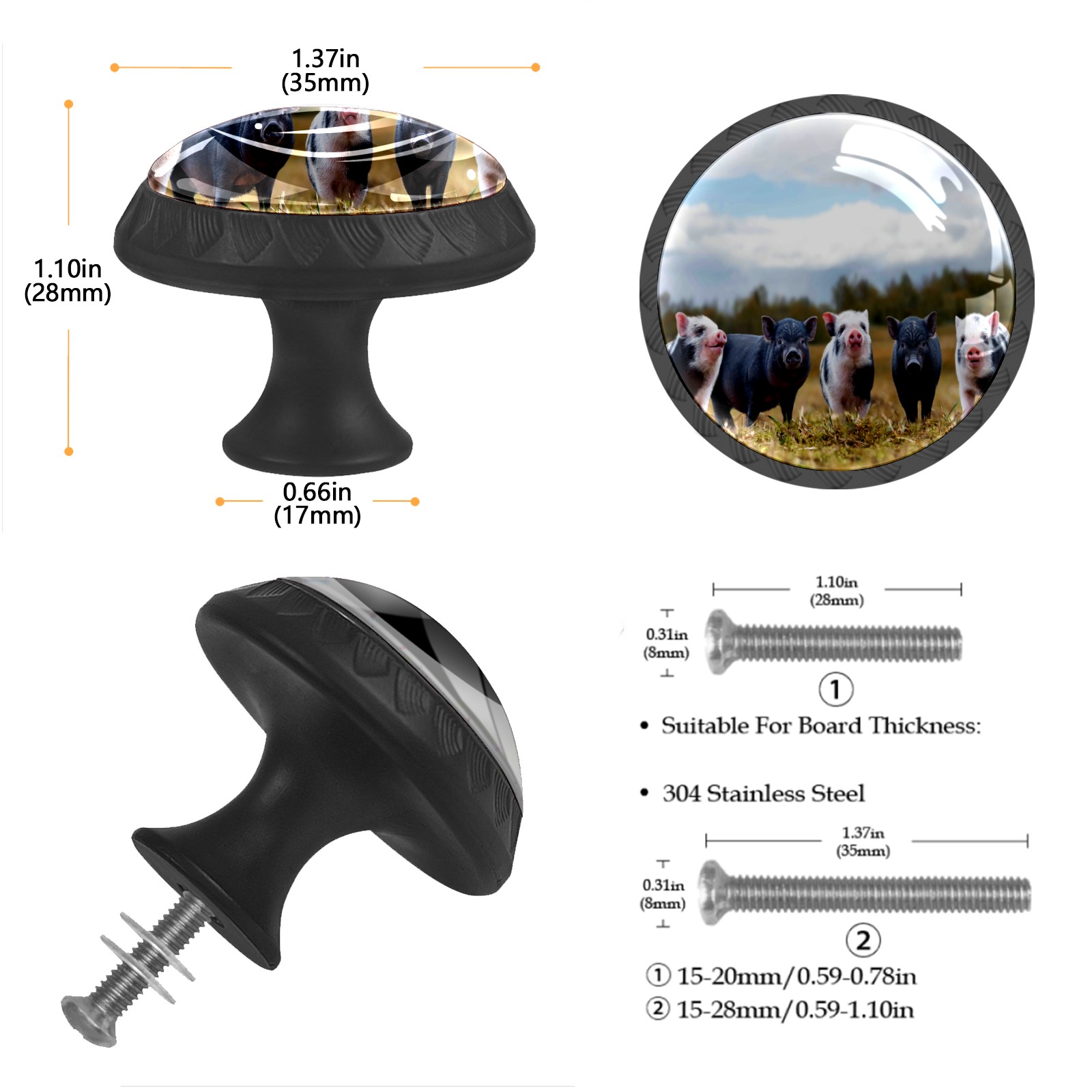 Round Cabinet Knobs Cute Pink Black Farm Pig (1) Drawer Pulls Crystal Glass Knobs for Dresser Kitchen Bathroom Cabinet Black Cupboard Wardrobe Pulls Handles, 4 Pack (1.37'' x1.37'')