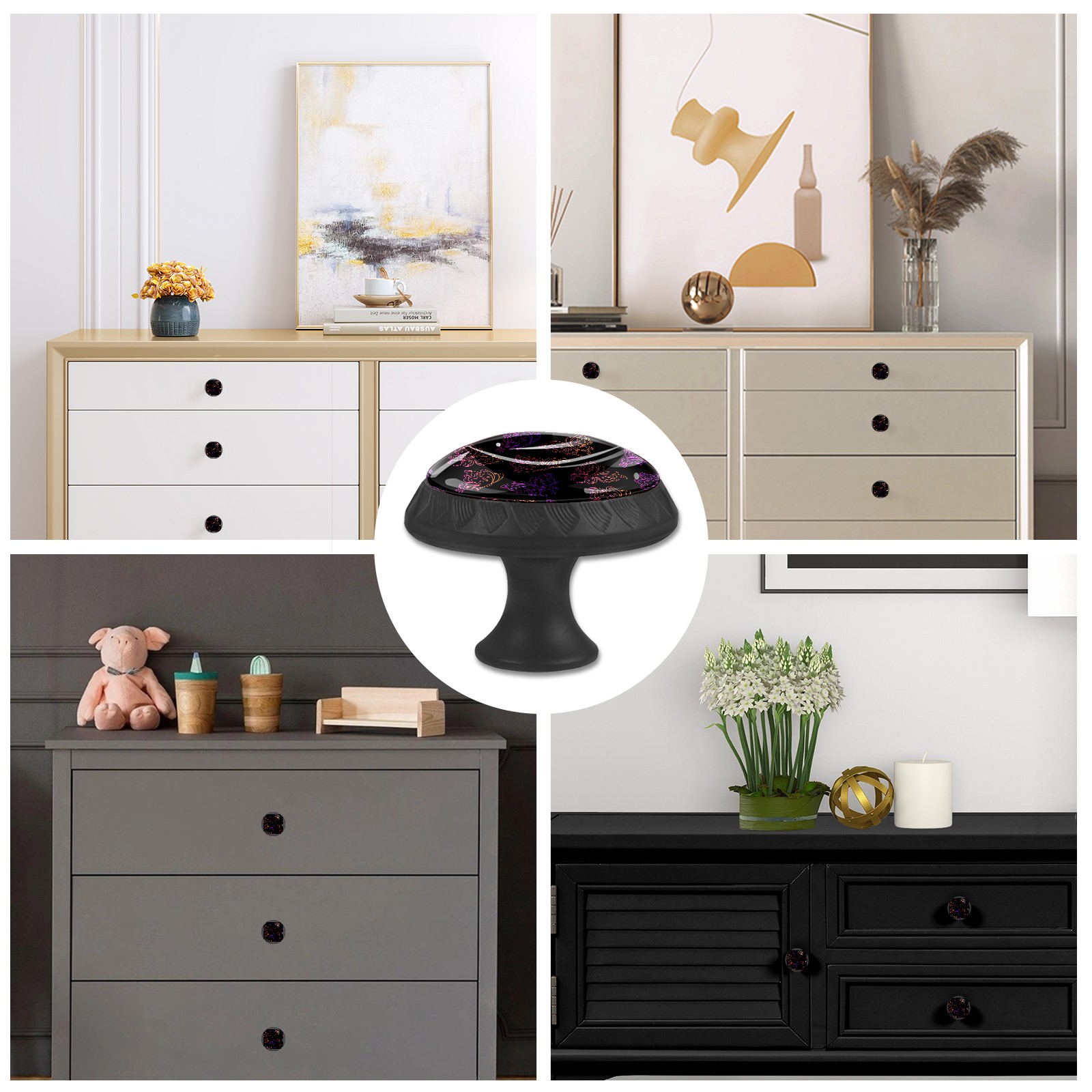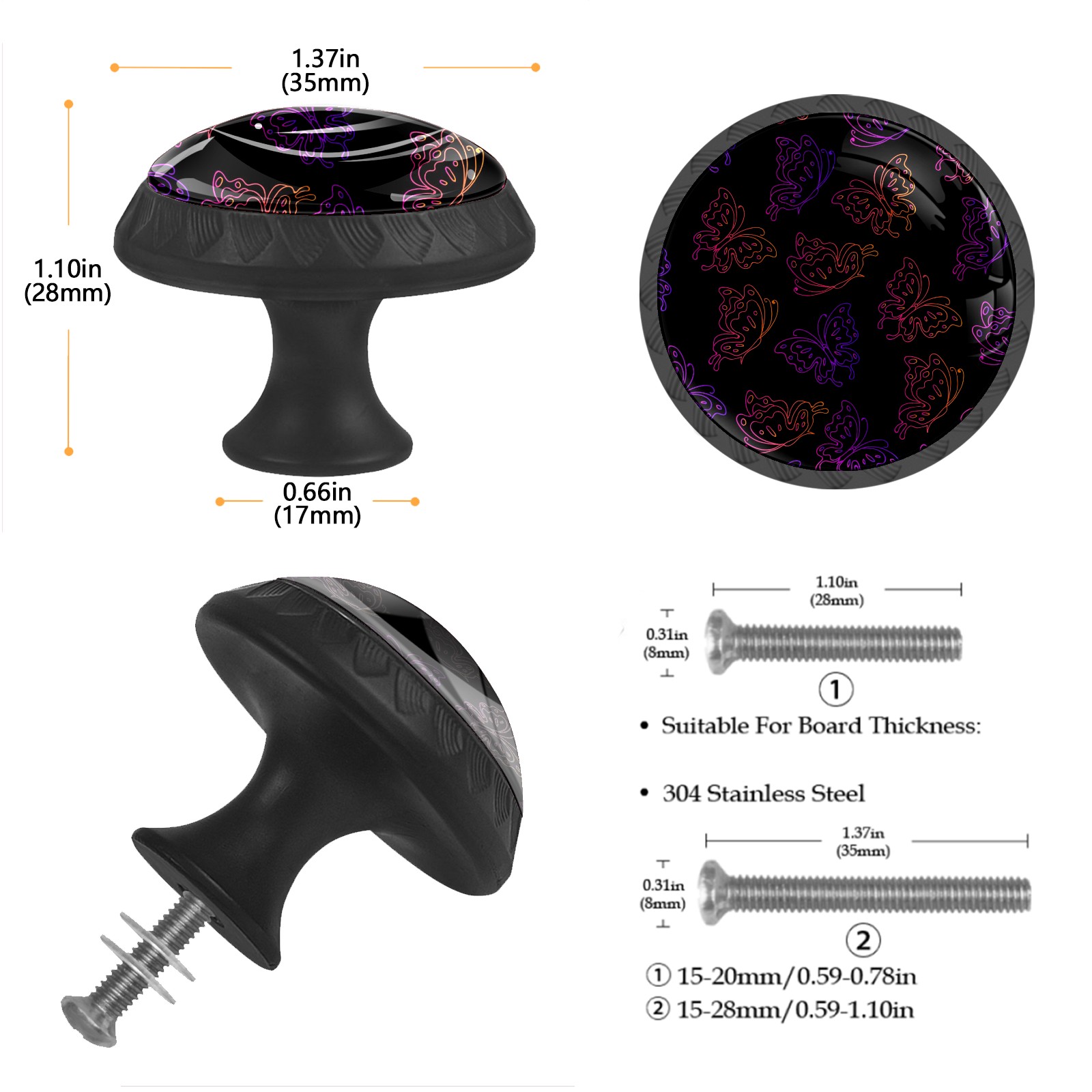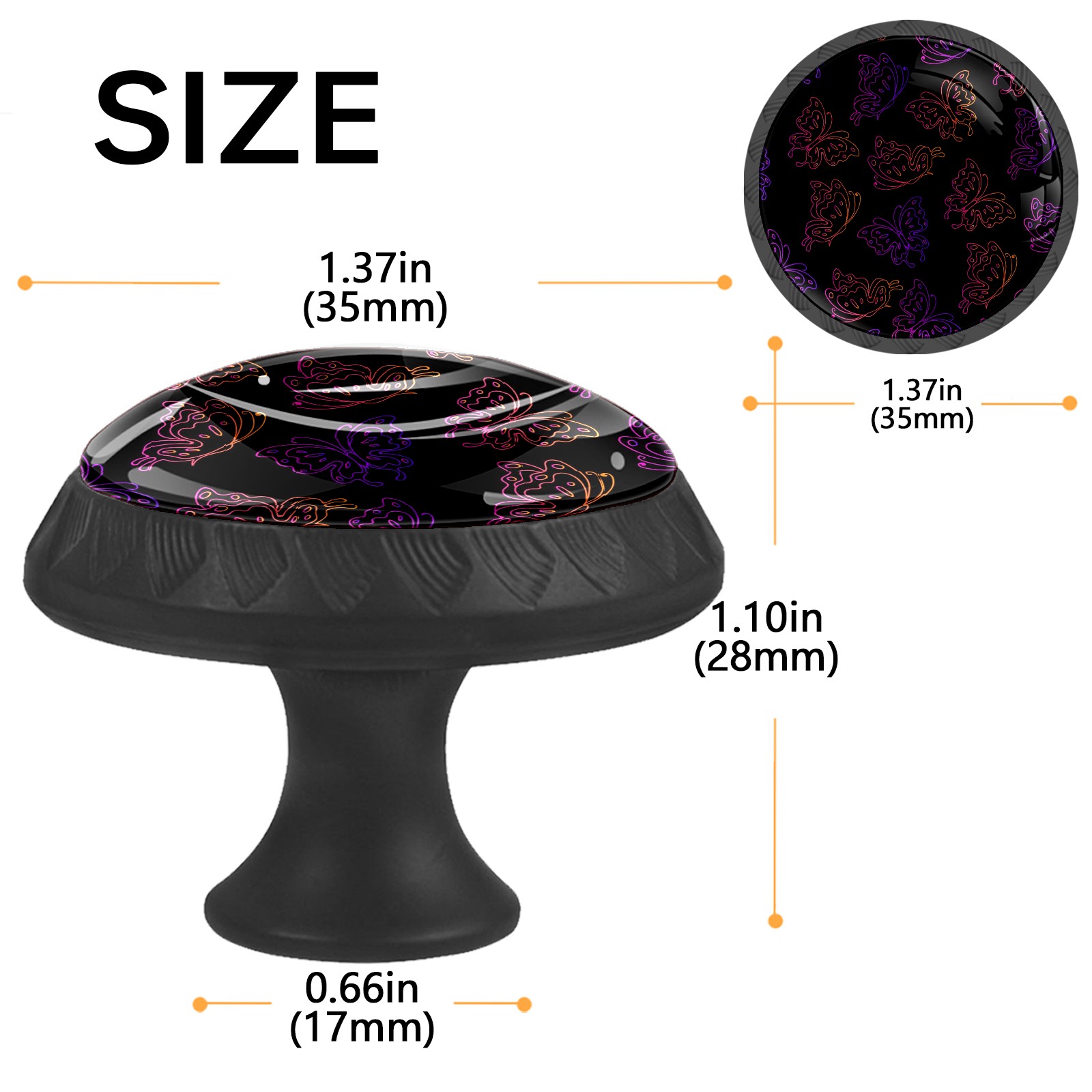 • <p><b>Package Includes:</b></p> <p>Drawer Knobs x 4</p> <p>1.10 Inches Mounting Screws x 4</p> <p>1.37 Inches Mounting Screws x 4</p> <p><br></p> <p>Crystal Glass Diameter: 1.37 inches (35mm)</p> <p>Knob Height: 1.10 inches (28mm)</p> <p>Base Diameter: 0.66 inches (17mm)</p> <p><br></p> <p><b>Practical and Aesthetic:</b></p> <p>The cute drawer pulls combine the durability of an ABS base with the high transparency of glass, enhanced by unique patterns that add decoration and cuteness. It’s both practical and visually appealing.</p> <p><b>Pattern Design:</b></p> <p>Clear patterns add decoration and personalization. They enhance visual appeal and can match different home styles, meeting diverse design needs.</p> <p><b>Easy Installation:</b></p> <p>Equipped with mounting screws, the ABS base can be securely attached to the drawer with ease.</p> <p><b>Easy Cleaning:</b></p> <p>The smooth surface of the round glass pull resists dust and stains, making it easy to clean with just a damp cloth.</p> <p><b>Wear-Resistant:</b></p> <p>The cabinet knobs are designed to resist scratches and fading, maintaining their good appearance over long-term use.</p>