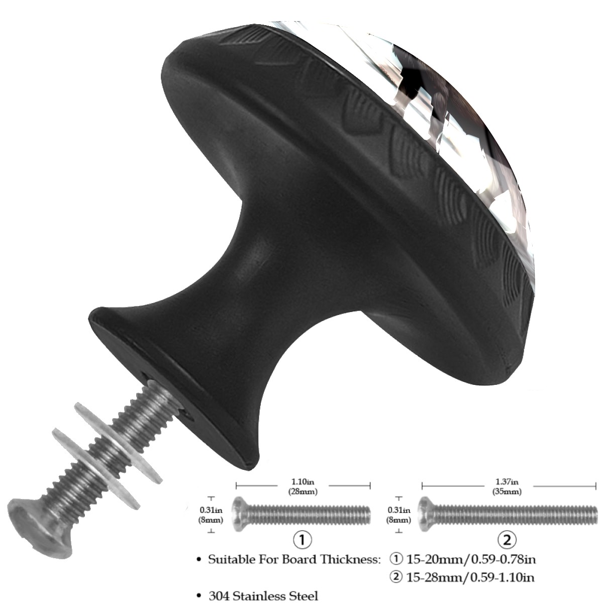 <p><b>Package Includes:</b></p> <p>Drawer Knobs x 4</p> <p>1.10 Inches Mounting Screws x 4</p> <p>1.37 Inches Mounting Screws x 4</p> <p><br></p> <p>Crystal Glass Diameter: 1.37 inches (35mm)</p> <p>Knob Height: 1.10 inches (28mm)</p> <p>Base Diameter: 0.66 inches (17mm)</p> <p><br></p> <p><b>Practical and Aesthetic:</b></p> <p>The cute drawer pulls combine the durability of an ABS base with the high transparency of glass, enhanced by unique patterns that add decoration and cuteness. It’s both practical and visually appealing.</p> <p><b>Pattern Design:</b></p> <p>Clear patterns add decoration and personalization. They enhance visual appeal and can match different home styles, meeting diverse design needs.</p> <p><b>Easy Installation:</b></p> <p>Equipped with mounting screws, the ABS base can be securely attached to the drawer with ease.</p> <p><b>Easy Cleaning:</b></p> <p>The smooth surface of the round glass pull resists dust and stains, making it easy to clean with just a damp cloth.</p> <p><b>Wear-Resistant:</b></p> <p>The cabinet knobs are designed to resist scratches and fading, maintaining their good appearance over long-term use.</p>