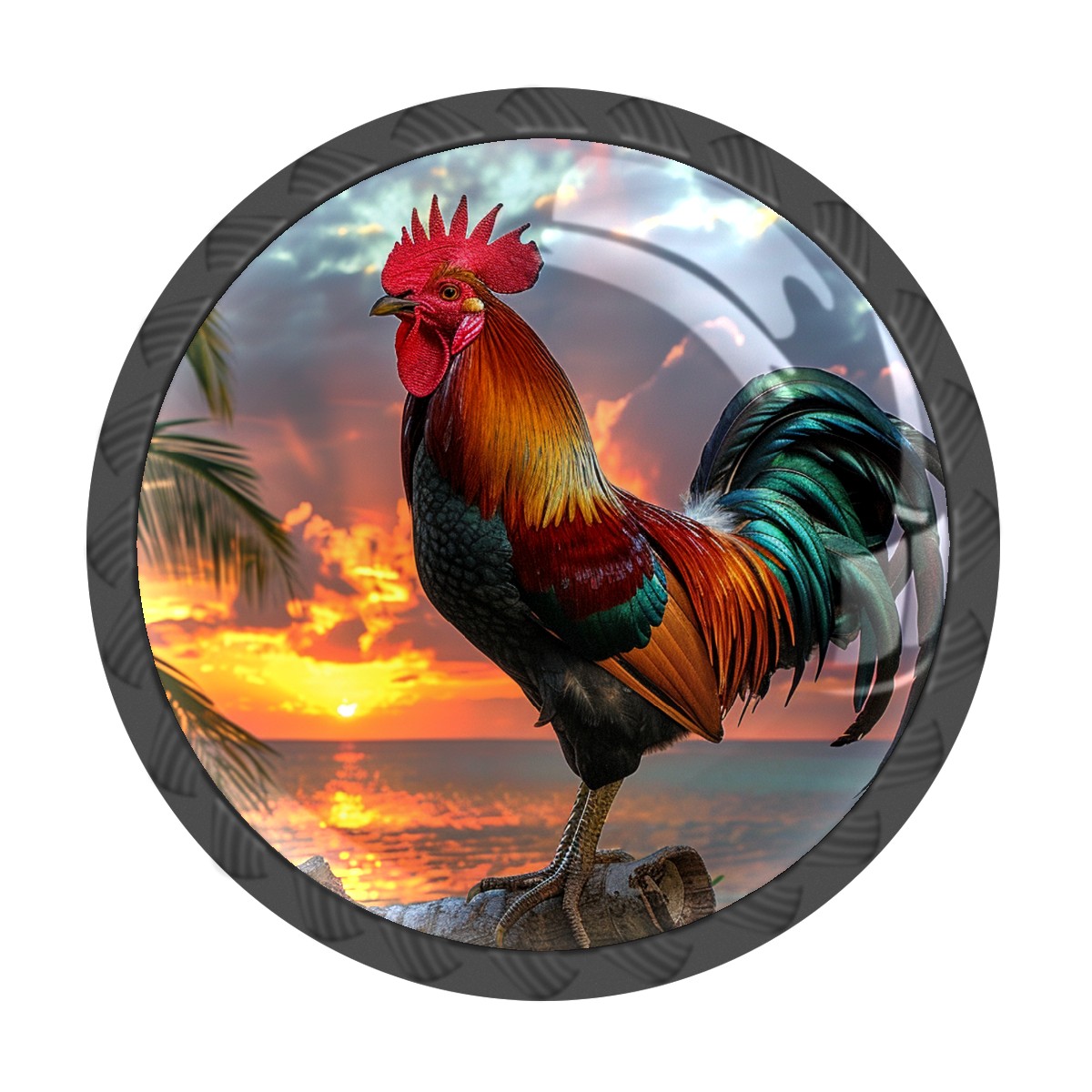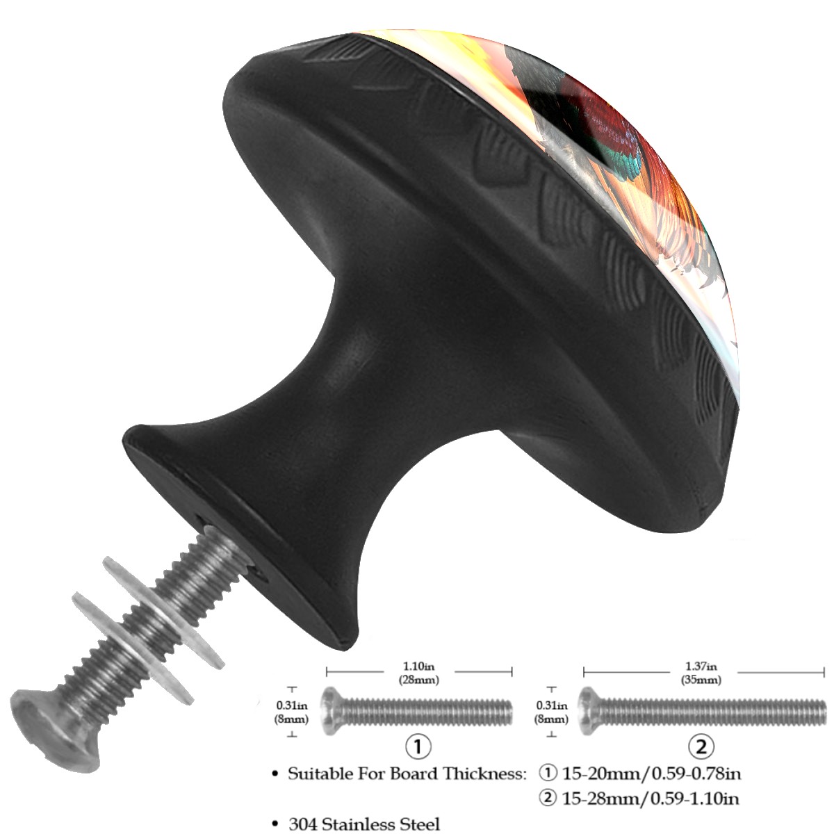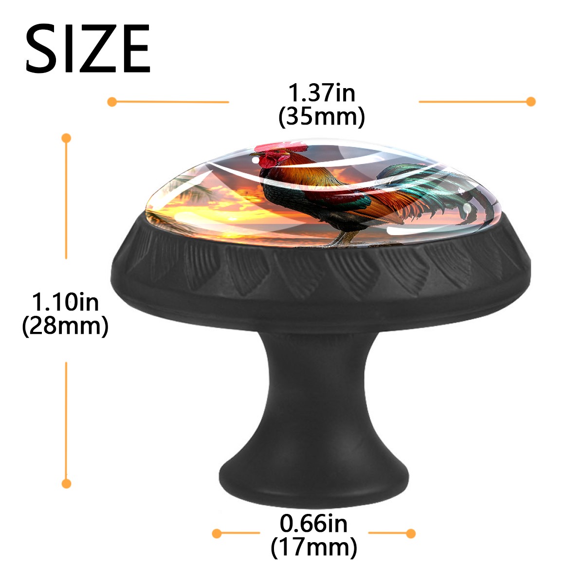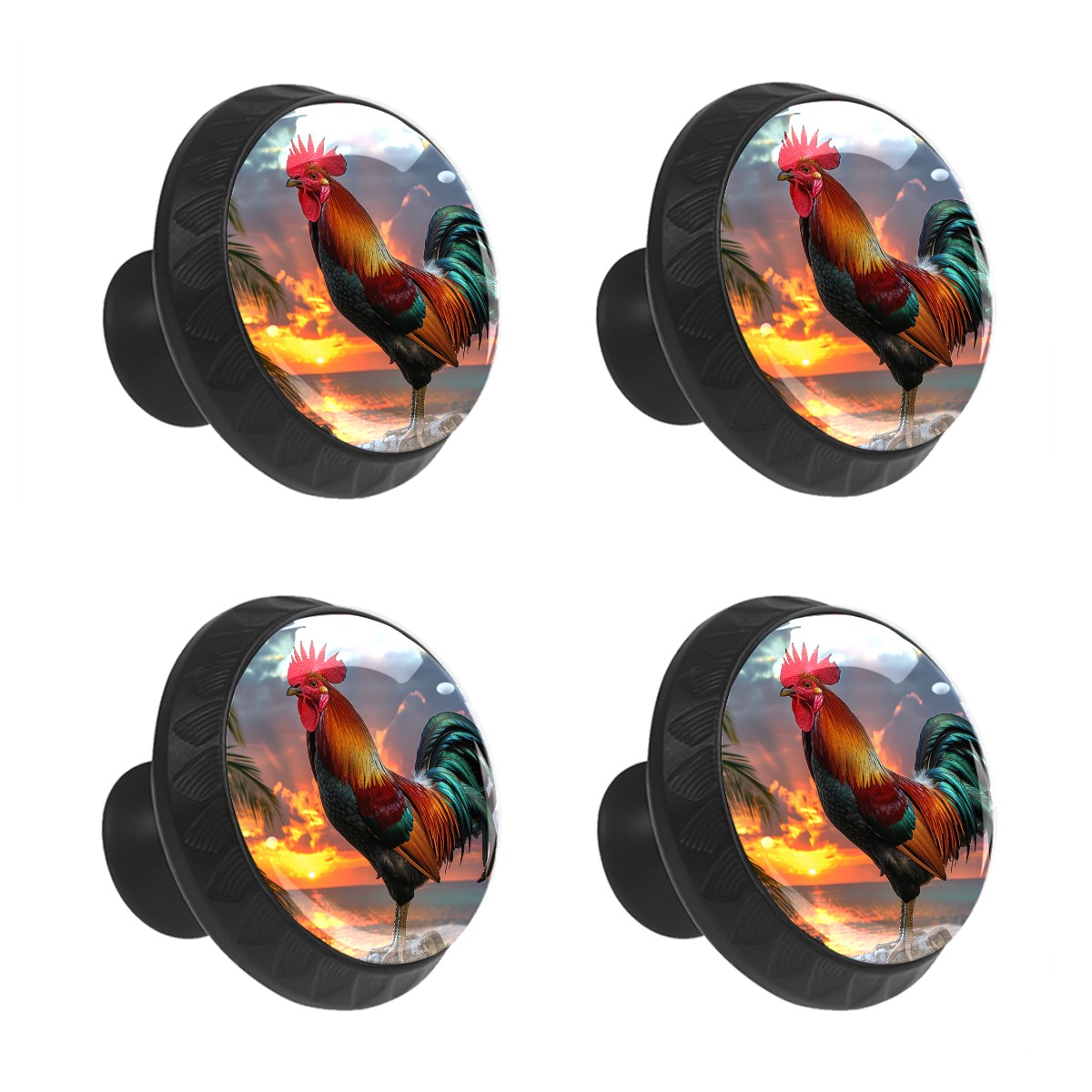 Round Cabinet Knobs Colorful Rooster Tropical Sunset Drawer Pulls Crystal Glass Knobs for Dresser Kitchen Bathroom Cabinet Black Cupboard Wardrobe Pulls Handles, 4 Pack