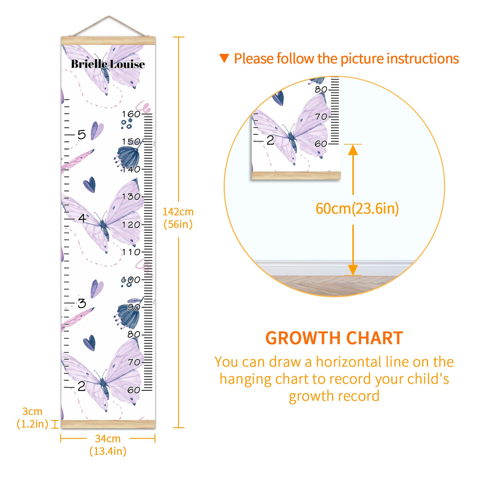 <p><b>Baby height growth chart can be used anywhere</b></p><p>Ideal for kids nursery decoration, kids bedroom, interior walls or windows, playroom, living room, homedecoration.Add name and make the growth chart special!</p><p><br></p><p><b>Easy to fold and carry</b></p><p>With rope at the top of the growth chart, it is easy to install and remove.You can fold it and unfold any time any where.</p><p><br></p><p><b>Perfect Gift Idea for Kids</b></p><p>Environmental and non-toxic for kids use, it must be a perfect gift for baby, kids, girls, and boys.This is a best choice for your friend who have kids or baby as a popular gift.</p><p><br></p><p><b>Easy to read</b></p><p>Measurement accrate with 2 scales, Centimeters and feet. The letters are big enough, very easy to read.</p><p><br></p><p><b>60cm(23.6inch) Over Ground Design</b></p><p>Not only can protect from dust and other damage, but also will not interfere in floor cleaning.</p><p><br></p><p><b>Features:</b></p><p>Rope for Hanging</p><p>Material: Linen + Wood</p><p>Dimensions: 13.4x56 inches</p><p>Weight: 7.5 once</p><p>Package Included: 1 * Baby Growth Chart</p>
