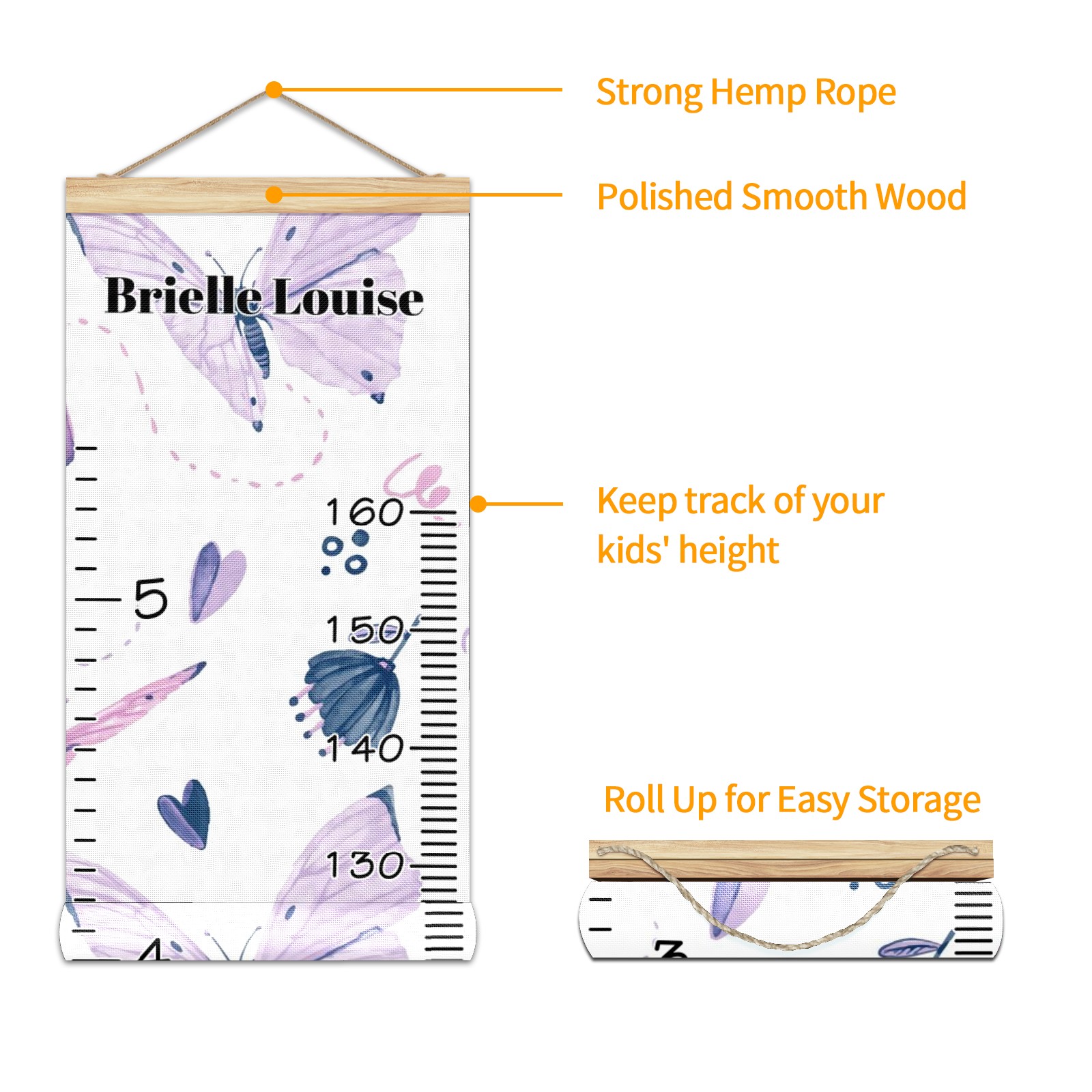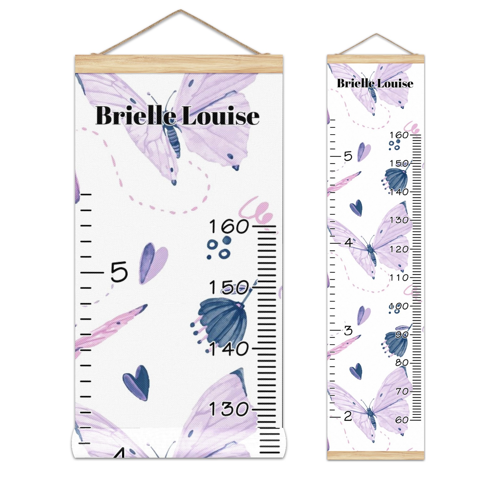 Personalized Kids Name Growth Chart Ruler for Wall Wood Frame Canvas Height Measure Chart 13.4x56 in Hanging Growth Chart Butterflies Purple3.10 Boys Girls Room Decor