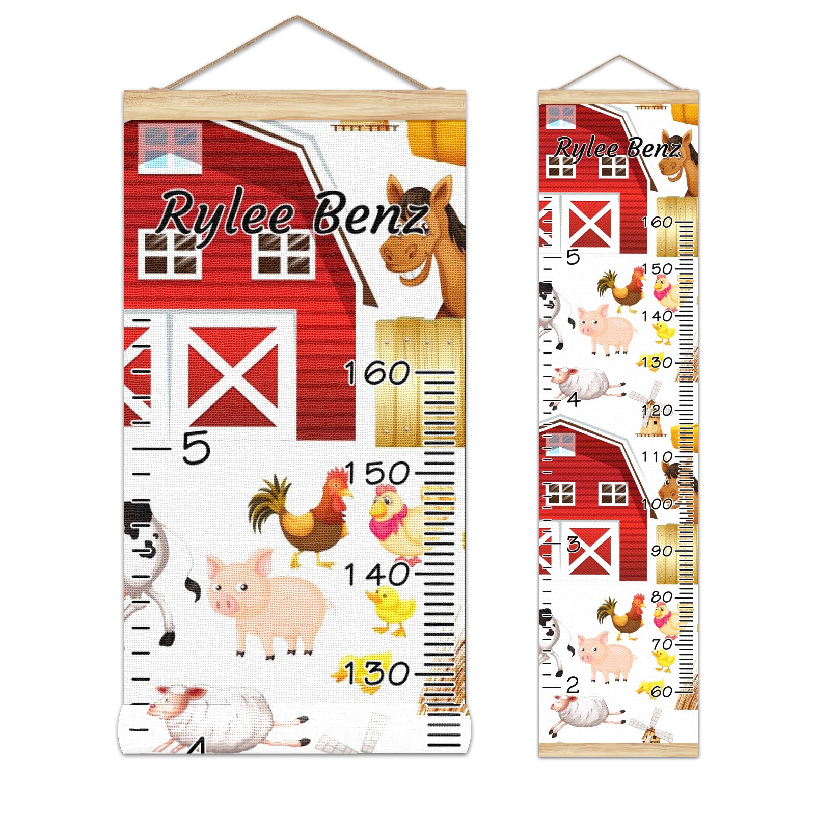 Personalized Kids Name Growth Chart Ruler for Wall Wood Frame Canvas Height Measure Chart 13.4x56 in Hanging Growth Chart Farm Animals Horse Red Barn3.11 Boys Girls Room Decor