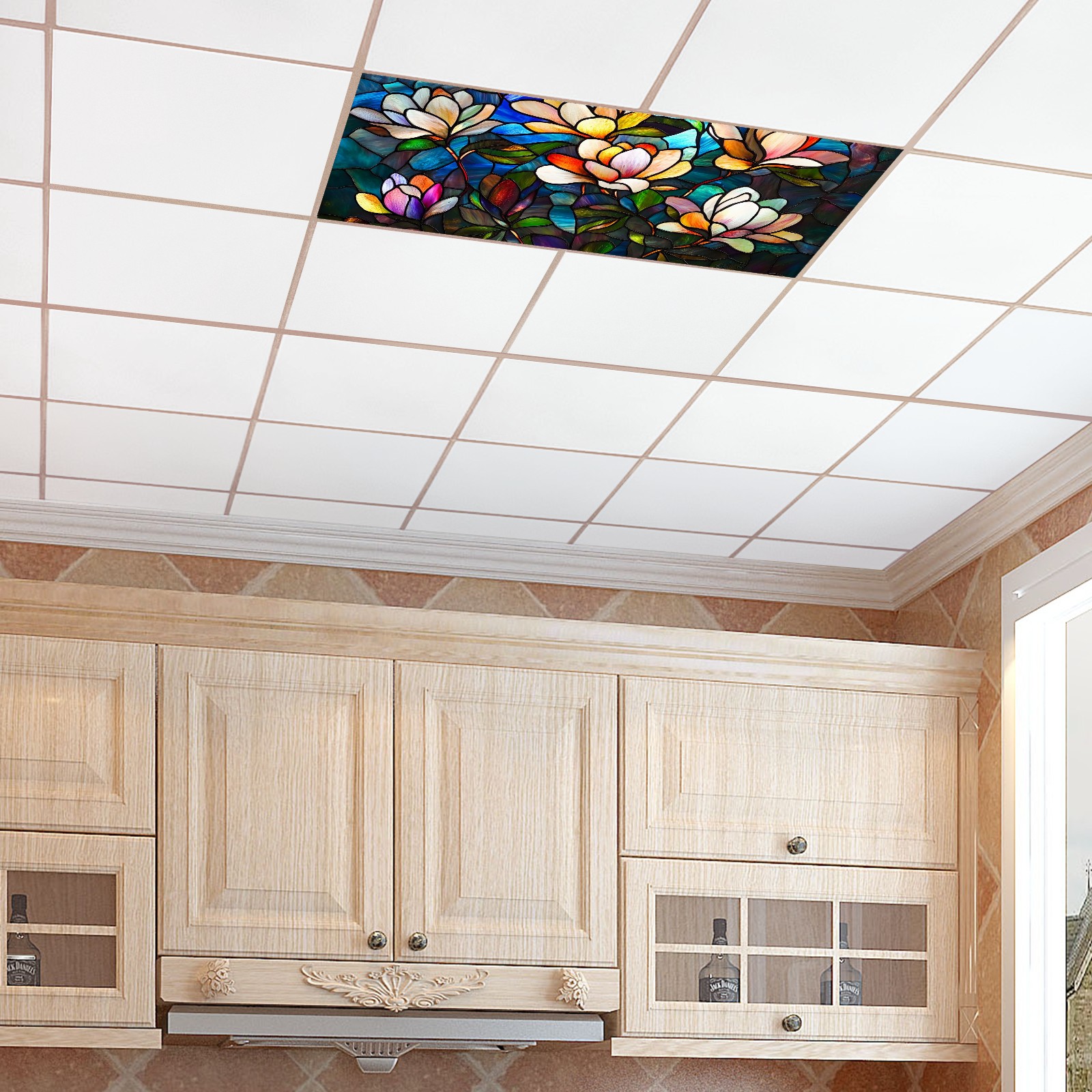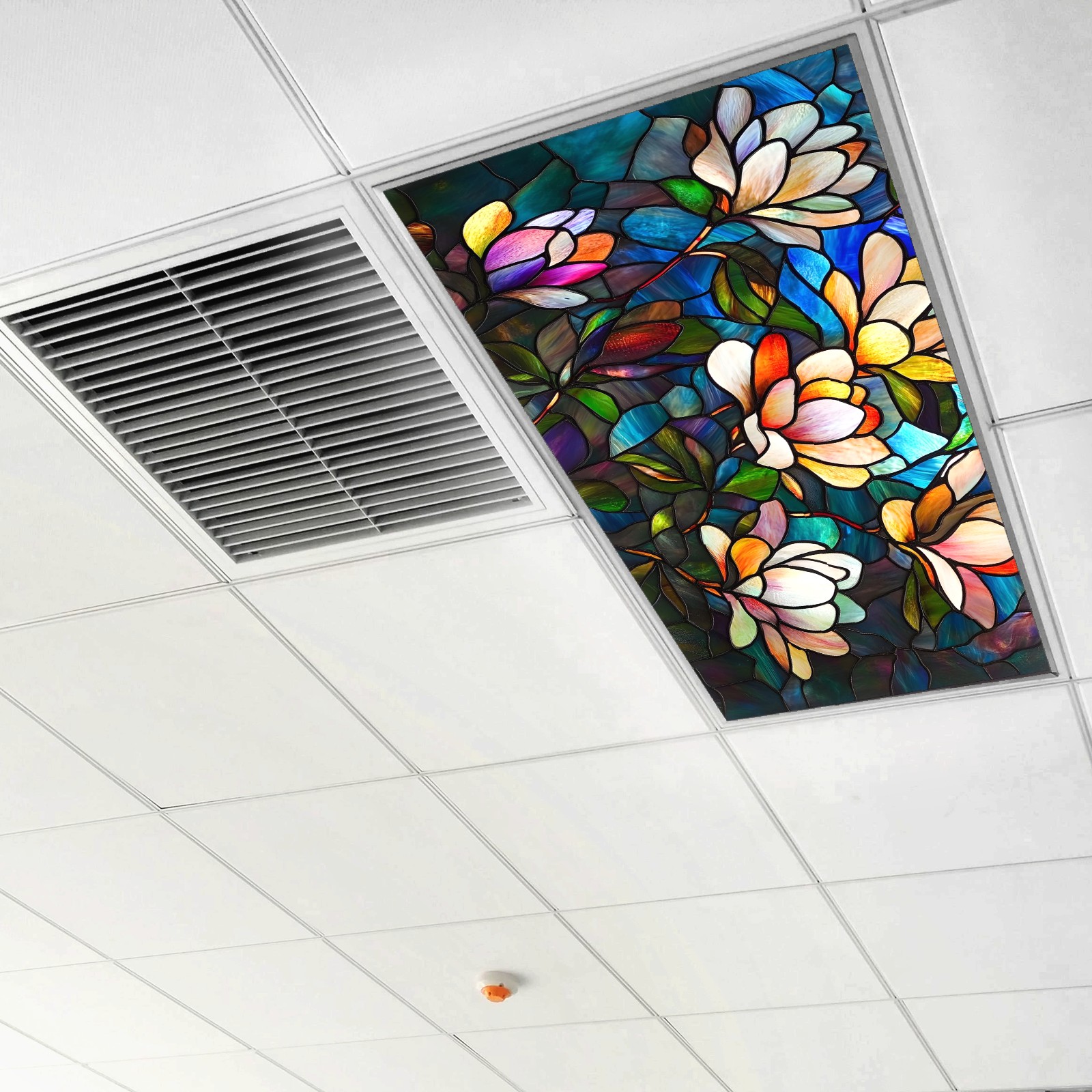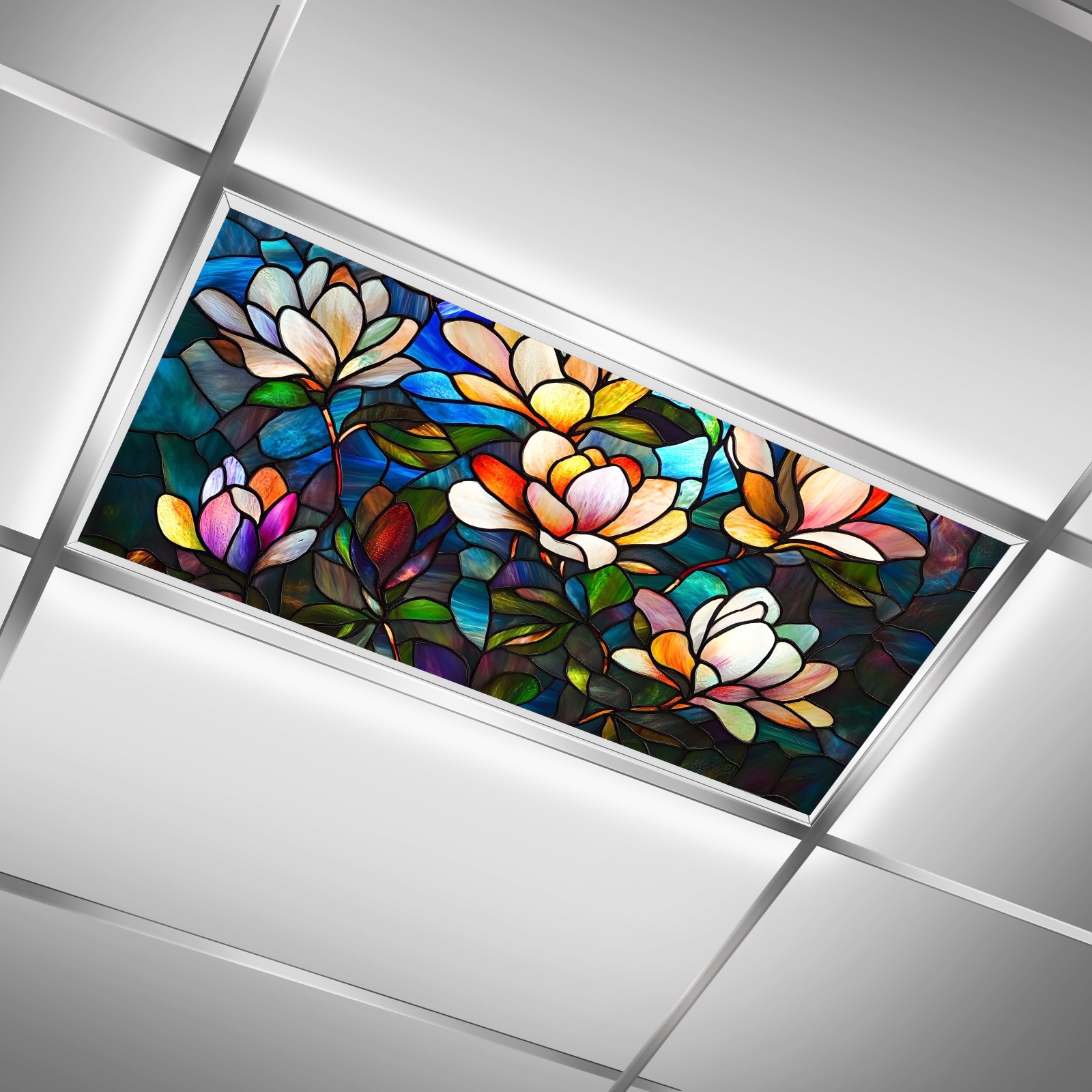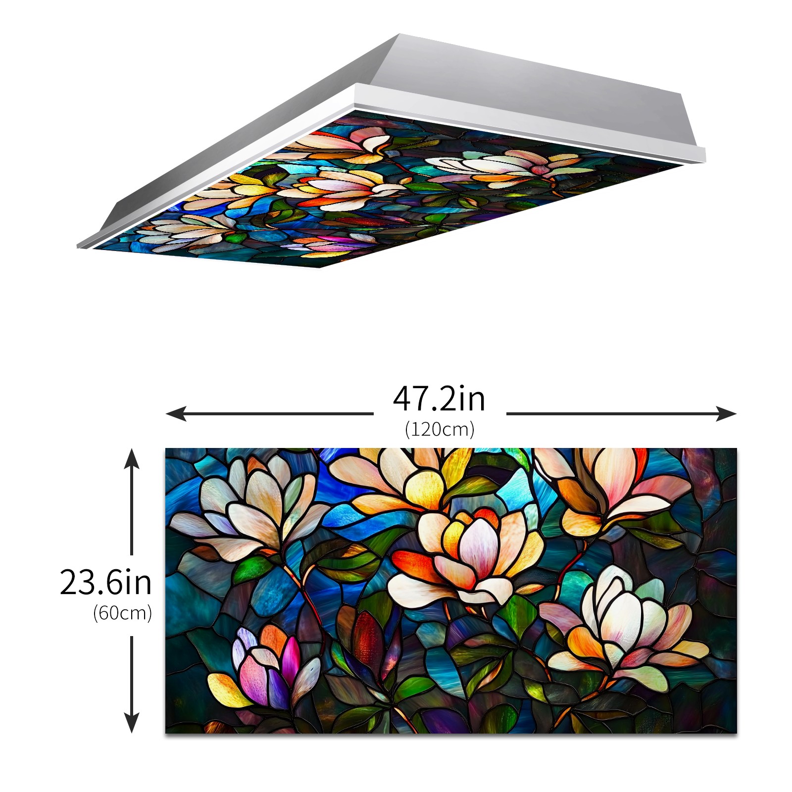 MSINMKOK Stained Glass Magnolia Flowers Fluorescent Light Covers for Ceiling Lights Classroom Office Decorative Drop Ceiling Light Cover Filters Hospital Home Ceiling Decor 47.2'' x 23.6''
