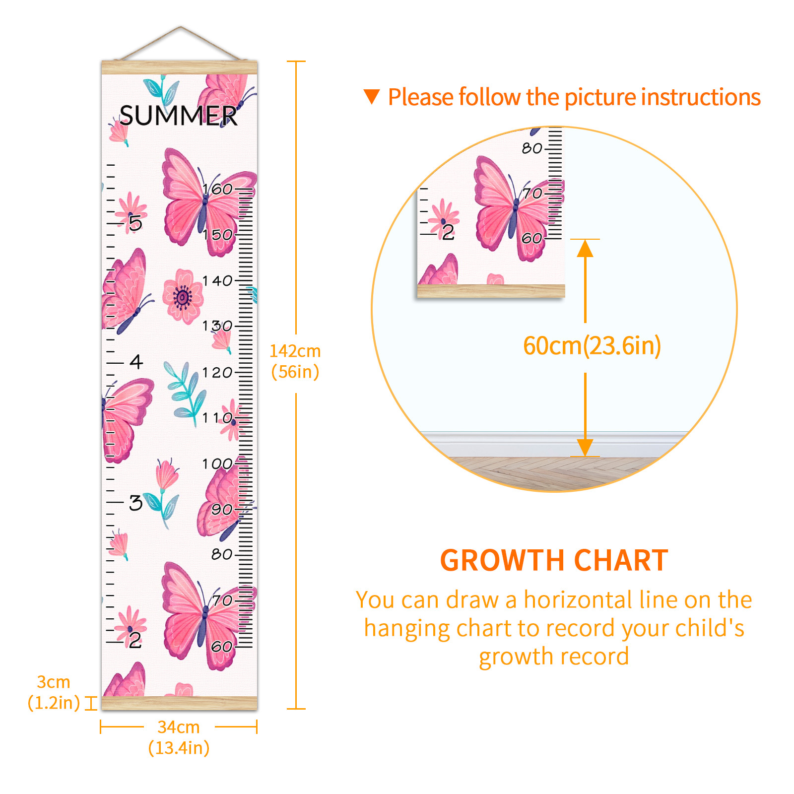 <p><b>Baby height growth chart can be used anywhere</b></p><p>Ideal for kids nursery decoration, kids bedroom, interior walls or windows, playroom, living room, homedecoration.Add name and make the growth chart special!</p><p><br></p><p><b>Easy to fold and carry</b></p><p>With rope at the top of the growth chart, it is easy to install and remove.You can fold it and unfold any time any where.</p><p><br></p><p><b>Perfect Gift Idea for Kids</b></p><p>Environmental and non-toxic for kids use, it must be a perfect gift for baby, kids, girls, and boys.This is a best choice for your friend who have kids or baby as a popular gift.</p><p><br></p><p><b>Easy to read</b></p><p>Measurement accrate with 2 scales, Centimeters and feet. The letters are big enough, very easy to read.</p><p><br></p><p><b>60cm(23.6inch) Over Ground Design</b></p><p>Not only can protect from dust and other damage, but also will not interfere in floor cleaning.</p><p><br></p><p><b>Features:</b></p><p>Rope for Hanging</p><p>Material: Linen + Wood</p><p>Dimensions: 13.4x56 inches</p><p>Weight: 7.5 once</p><p>Package Included: 1 * Baby Growth Chart</p>