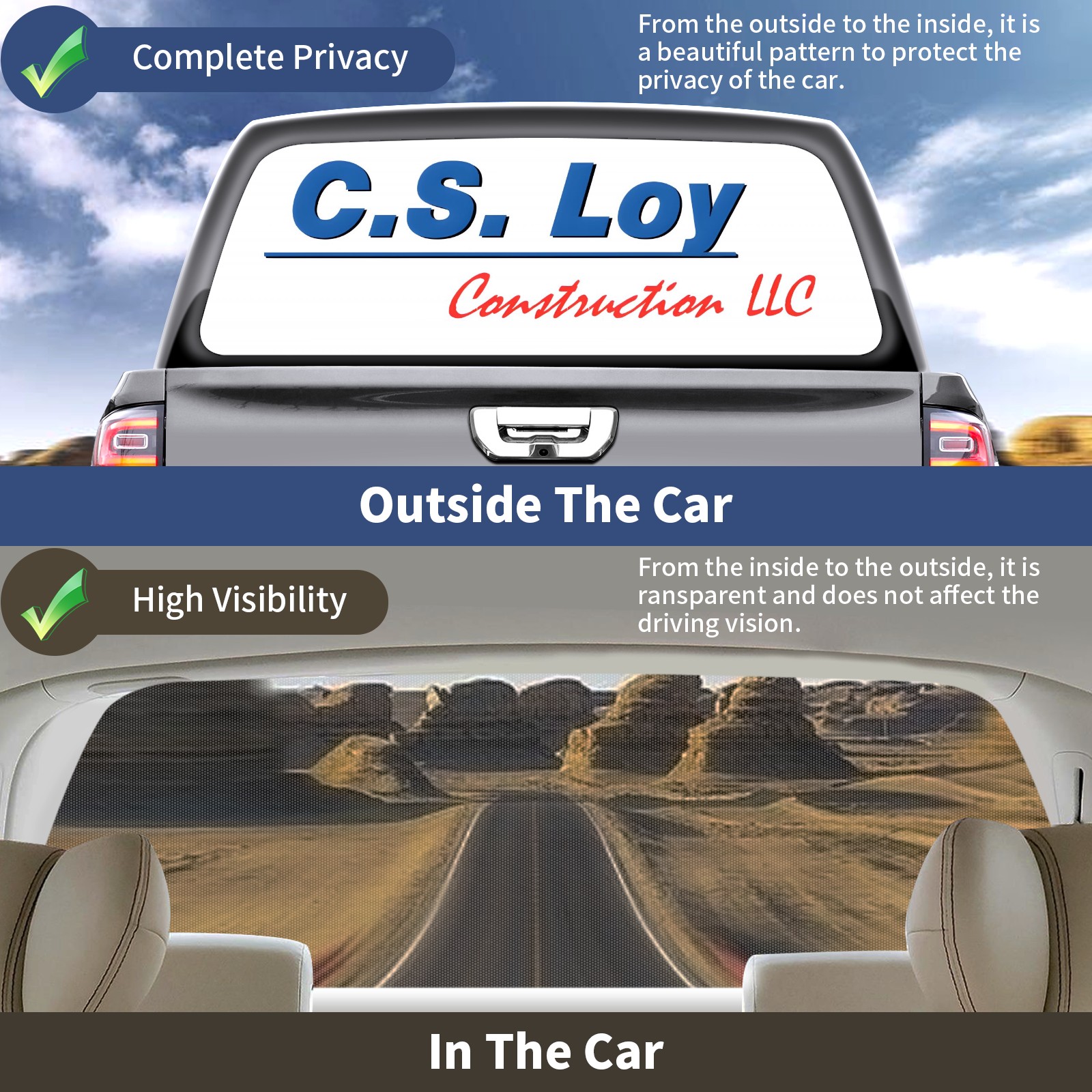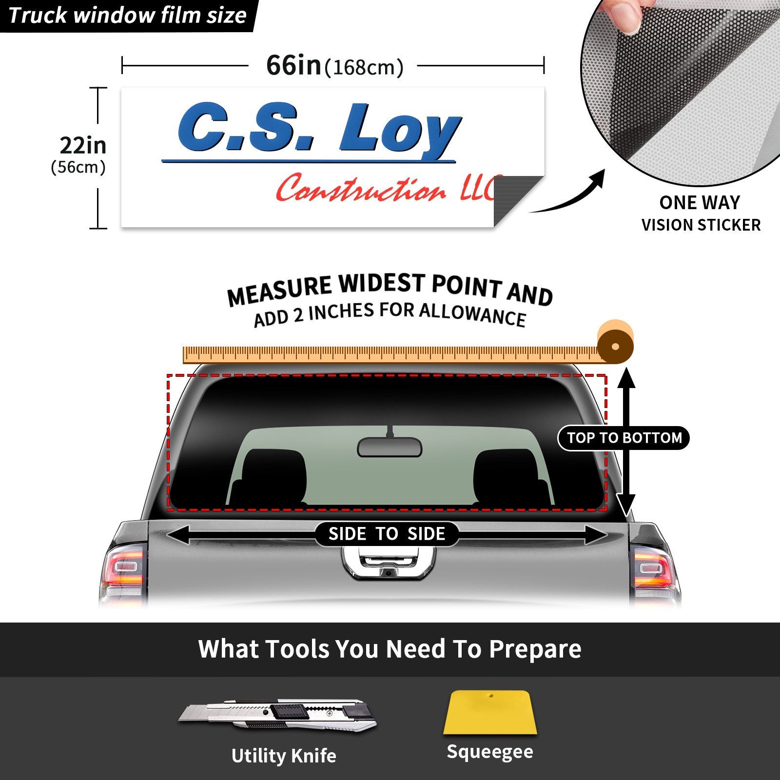 <p><strong>Truck Rear Window Graphics Decals Pickup Trucks Back Window Film Stickers 66" x 22" Perforated Vinyl Wrap Stickers Decorations for Car Rear Window</strong></p><p><strong><br /></strong></p><p><strong>Features :</strong></p><p>- Size of the rear window decals for trucks is 66x22 Inches (168x56cm).</p><p>- High quality perforated vinyl window film, one way vision sticker.</p><p>- Perforated is see through from the inside but not from outside.</p><p>- Clear printing, waterproof and durable.</p><p>- The car back window graphics stickers fits most truck and makes your vehicle more beautiful. </p><p><br /></p><p><strong>【Installation Instructions】</strong></p><p><strong>1. CLEAN SURFACE -</strong> Clean the rear window thoroughly and make sure the surface clean.</p><p><strong>2. STICK THE DECALS -</strong> Tear off the paper on the back and stick the decal on the window.</p><p><strong>3. SCRAPE OFF AIR BUBBLES -</strong> Use a squeegee or other card to scrape off the excess air bubbles.</p><p><strong>4. TRIM THE EXCESS -</strong> Use a knife to cut off the excess stickers of the window, finally complete.</p><p><br /></p><p>1. Please measure the size before purchasing, back window graphics decal for truck can be cut to your desired size.</p><p>2.The graphics stickers for truck back window is a great gift for yourself also can as a birthday / halloween / christmas gift for your friends and family.</p>