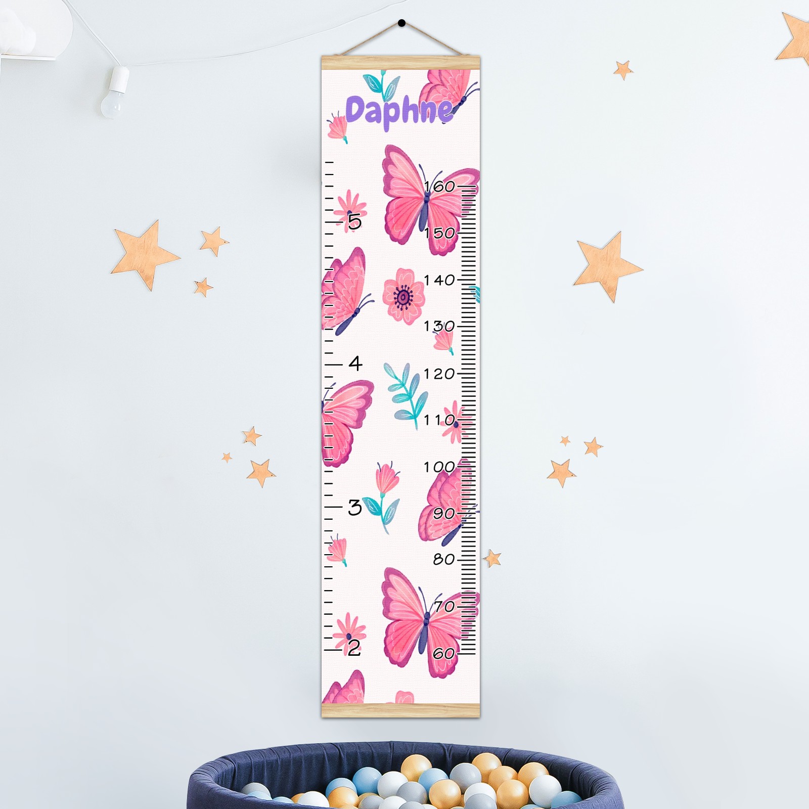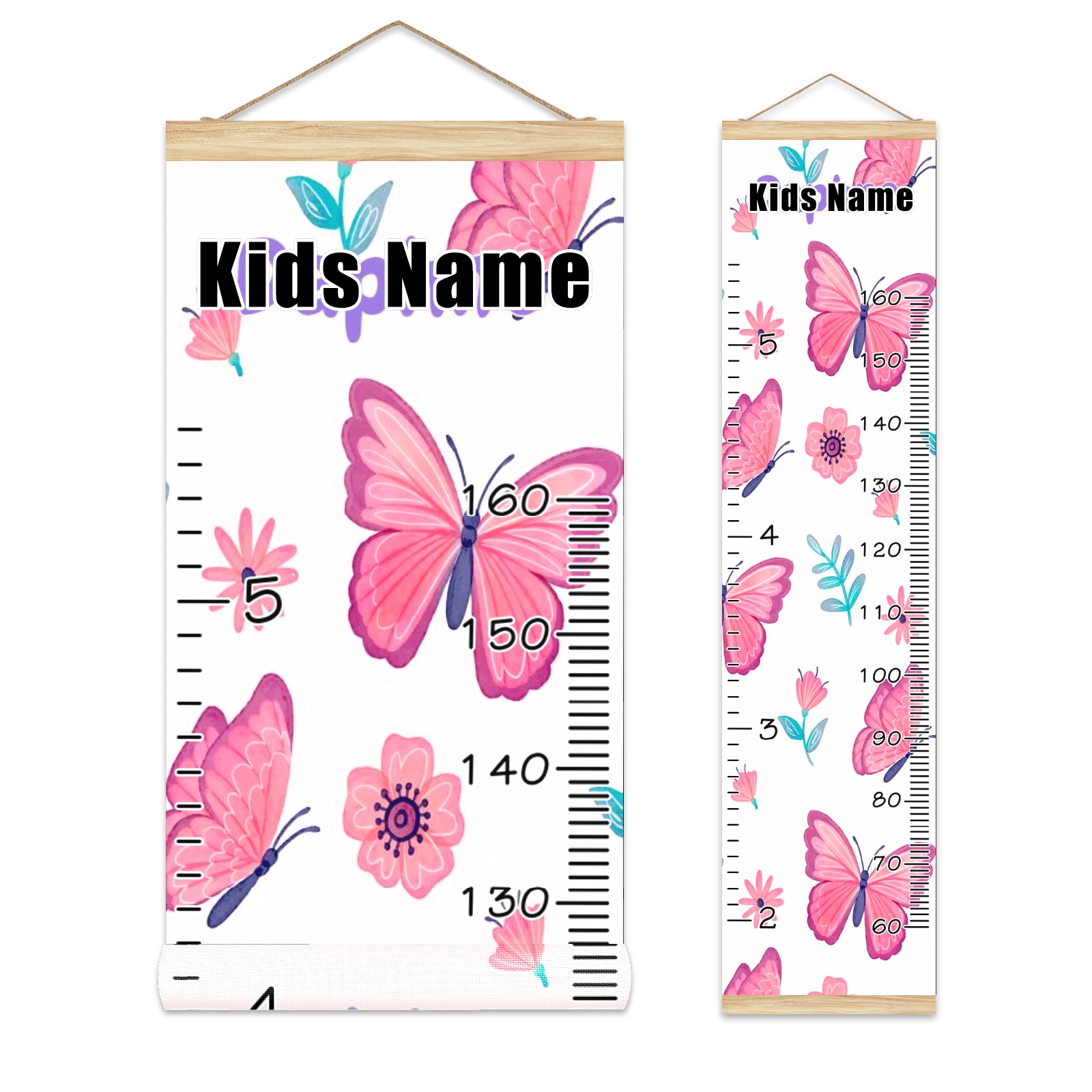 Personalized Kids Name Growth Chart Ruler for Wall Wood Frame Canvas Height Measure Chart 13.4x56 in Hanging Growth Chart Pink Butterfly & Flower3.15 Boys Girls Room Decor