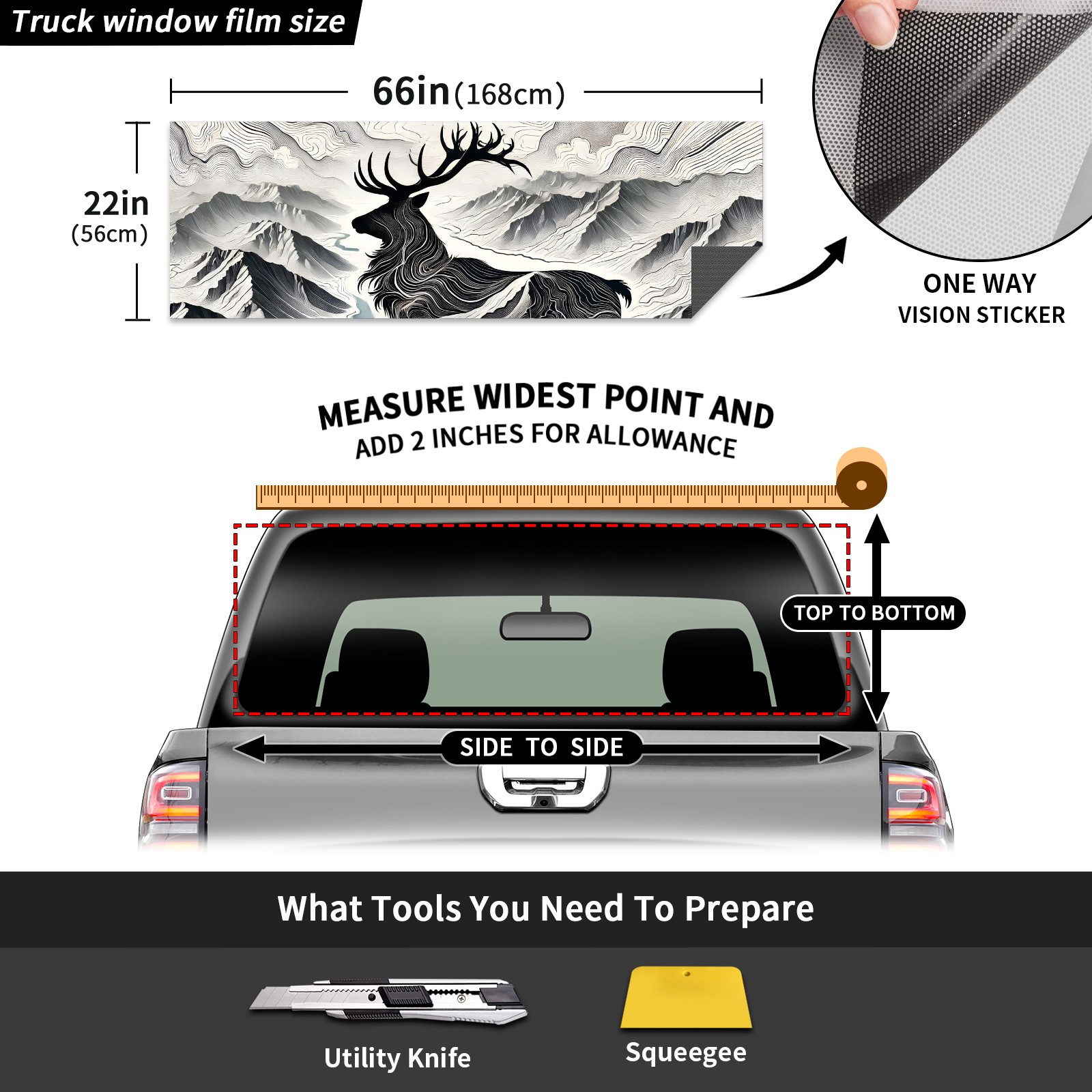 <p><strong>Truck Rear Window Graphics Decals Pickup Trucks Back Window Film Stickers 66" x 22" Perforated Vinyl Wrap Stickers Decorations for Car Rear Window</strong></p><p><strong><br /></strong></p><p><strong>Features :</strong></p><p>- Size of the rear window decals for trucks is 66x22 Inches (168x56cm).</p><p>- High quality perforated vinyl window film, one way vision sticker.</p><p>- Perforated is see through from the inside but not from outside.</p><p>- Clear printing, waterproof and durable.</p><p>- The car back window graphics stickers fits most truck and makes your vehicle more beautiful.&nbsp;</p><p><br /></p><p><strong>【Installation Instructions】</strong></p><p><strong>1. CLEAN SURFACE -</strong> Clean the rear window thoroughly and make sure the surface clean.</p><p><strong>2. STICK THE DECALS -</strong> Tear off the paper on the back and stick the decal on the window.</p><p><strong>3. SCRAPE OFF AIR BUBBLES -</strong> Use a squeegee or other card to scrape off the excess air bubbles.</p><p><strong>4. TRIM THE EXCESS -</strong> Use a knife to cut off the excess stickers of the window, finally complete.</p><p><br /></p><p>1. Please measure the size before purchasing, back window graphics decal for truck can be cut to your desired size.</p><p>2.The graphics stickers for truck back window is a great gift for yourself also can as a birthday / halloween / christmas gift for your friends and family.</p>