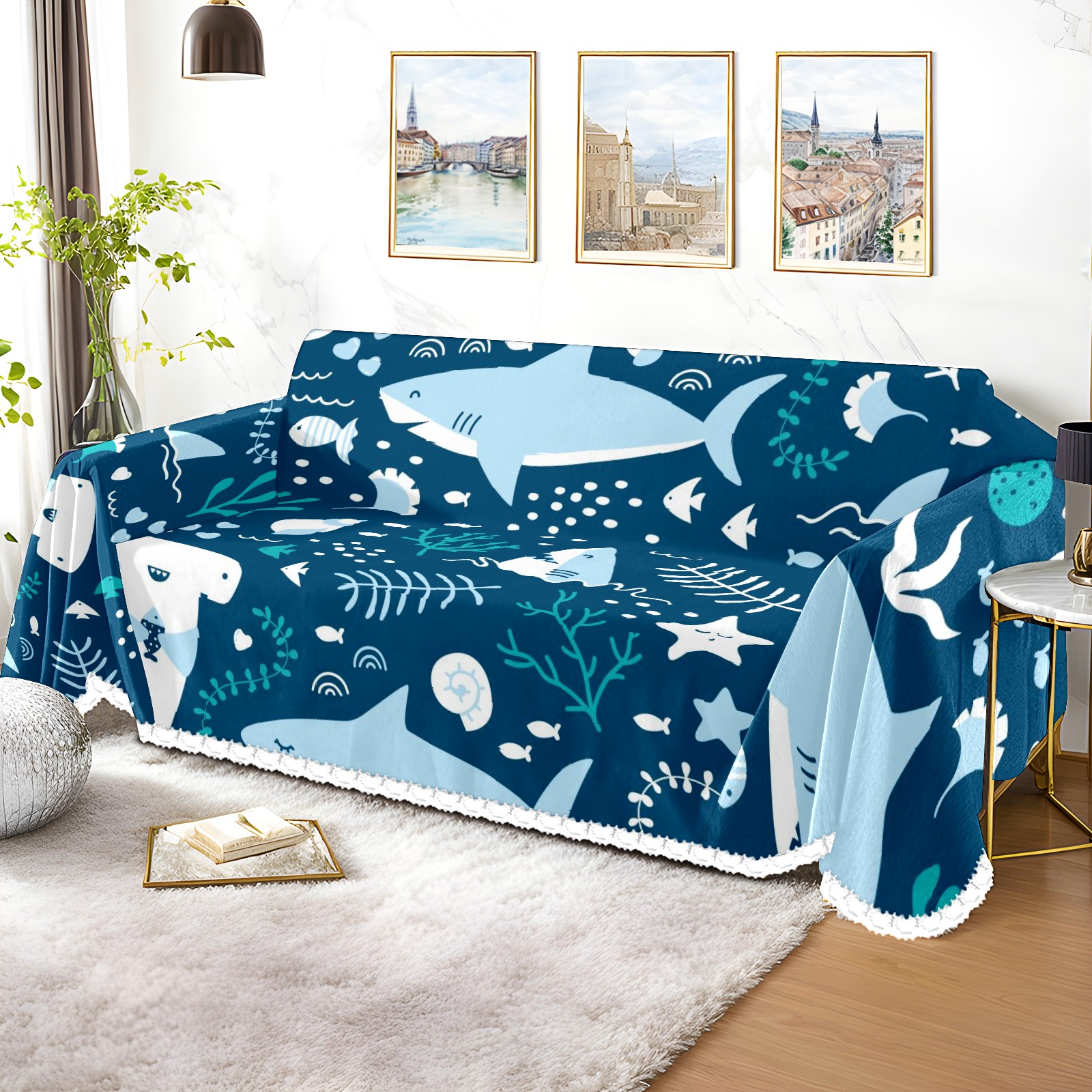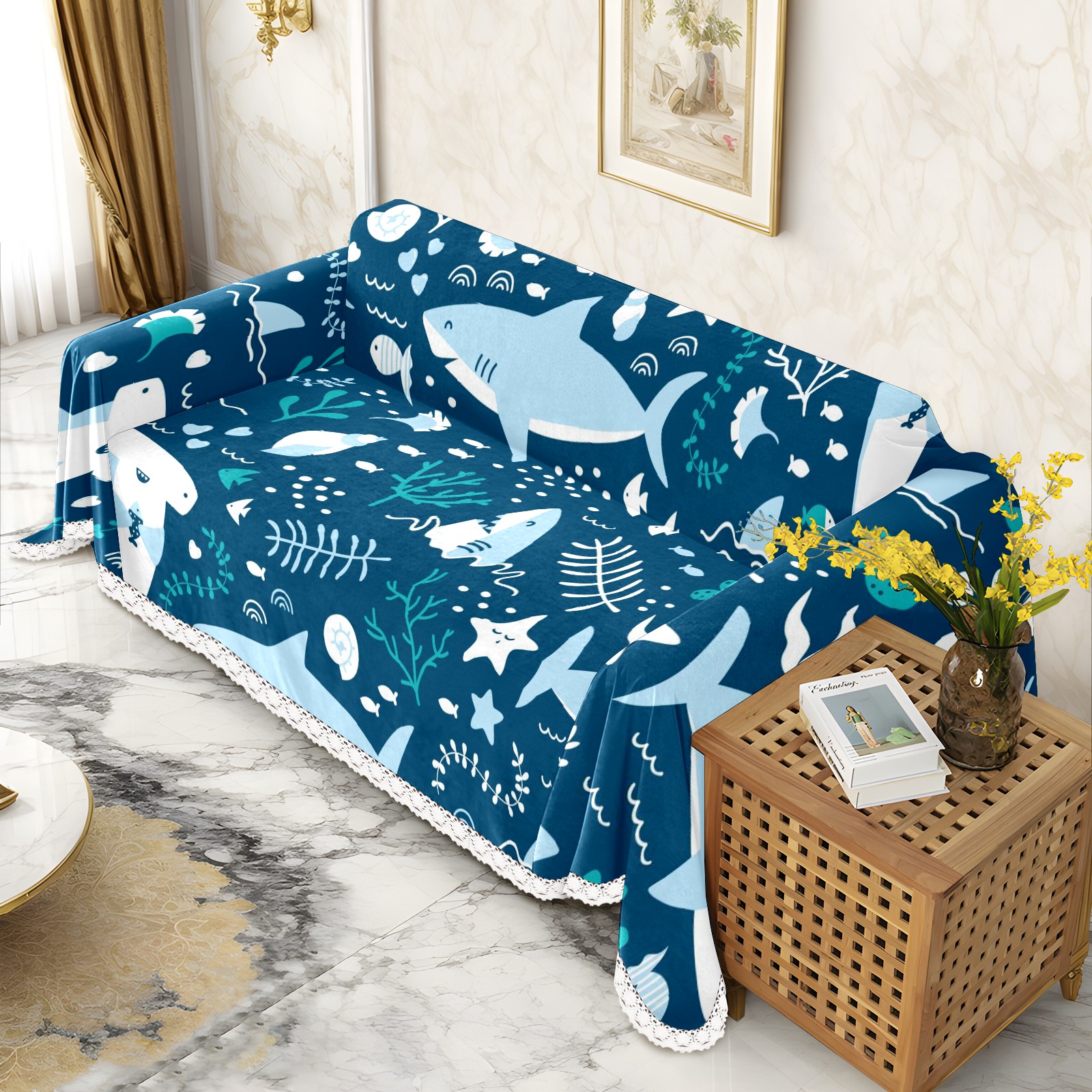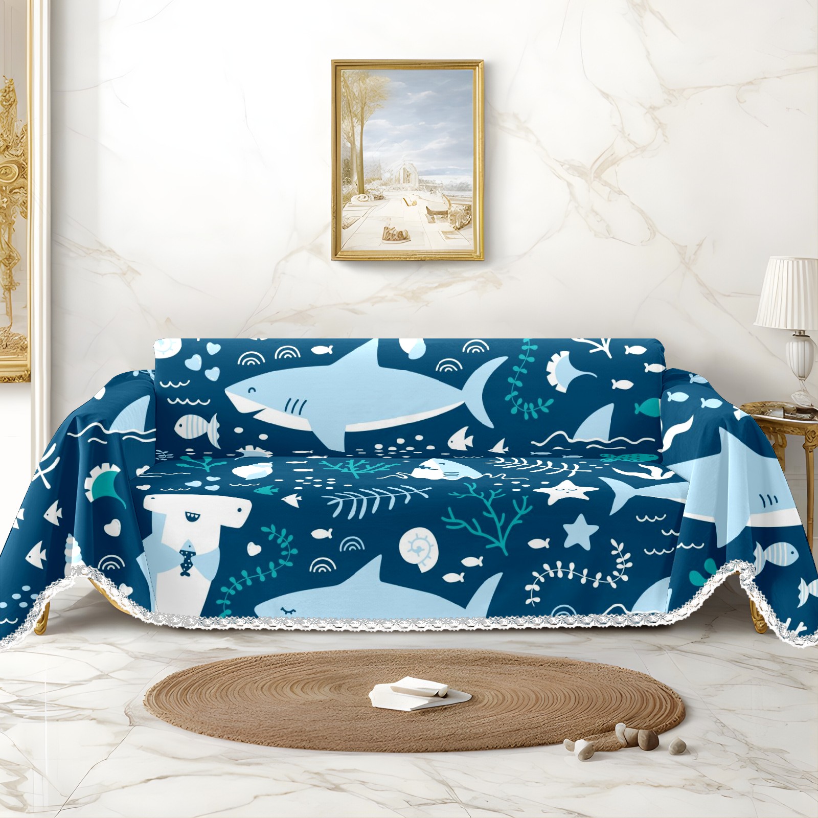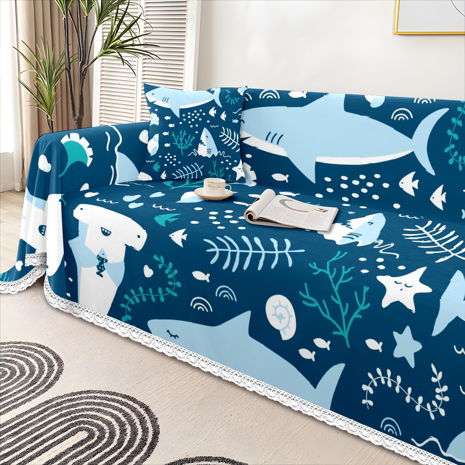 Cute Cartoon Sharks Pattern Sofa Cover-Soft Poly-Cotton Blend, Machine Washable Couch Protector for Home Decor - 71x91 in Couch Covers